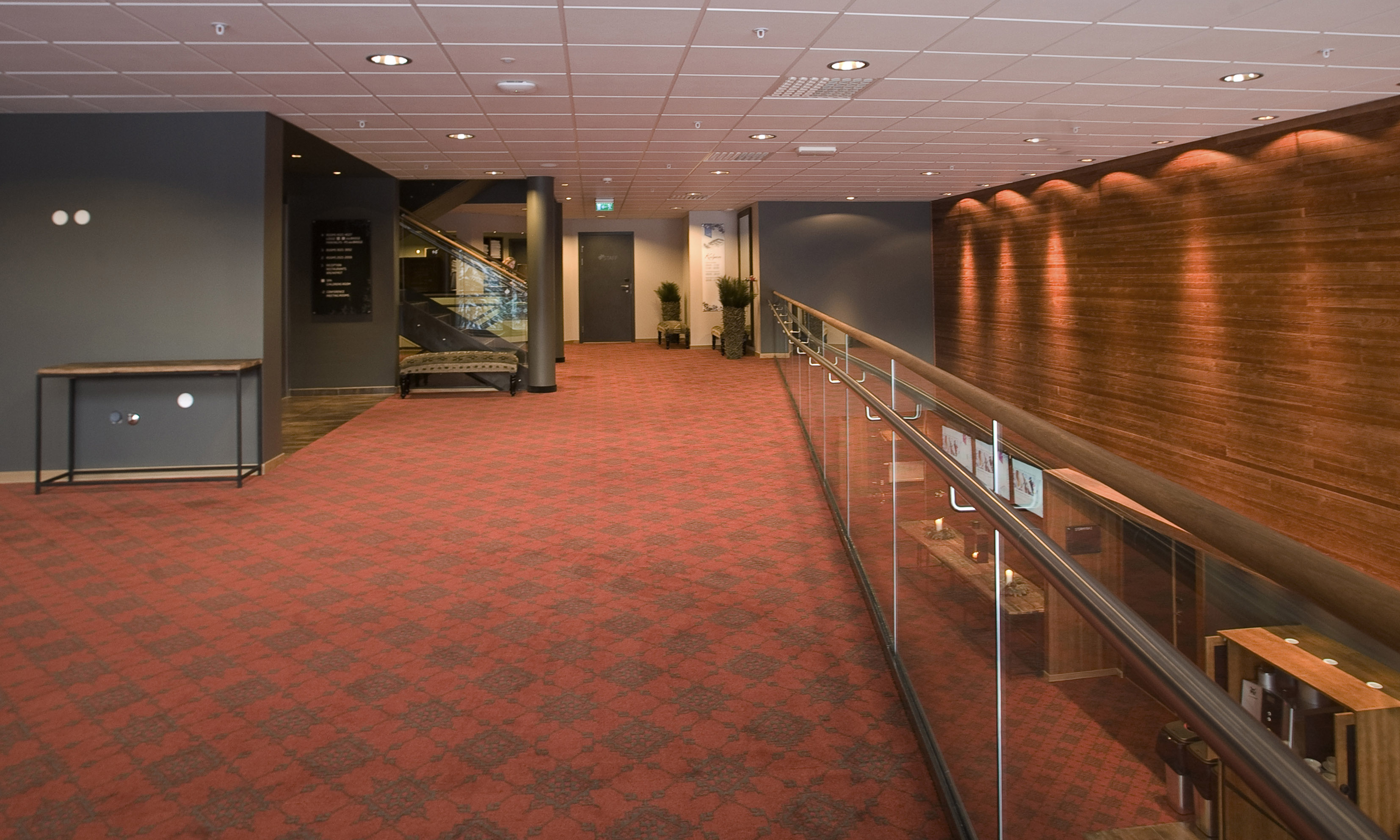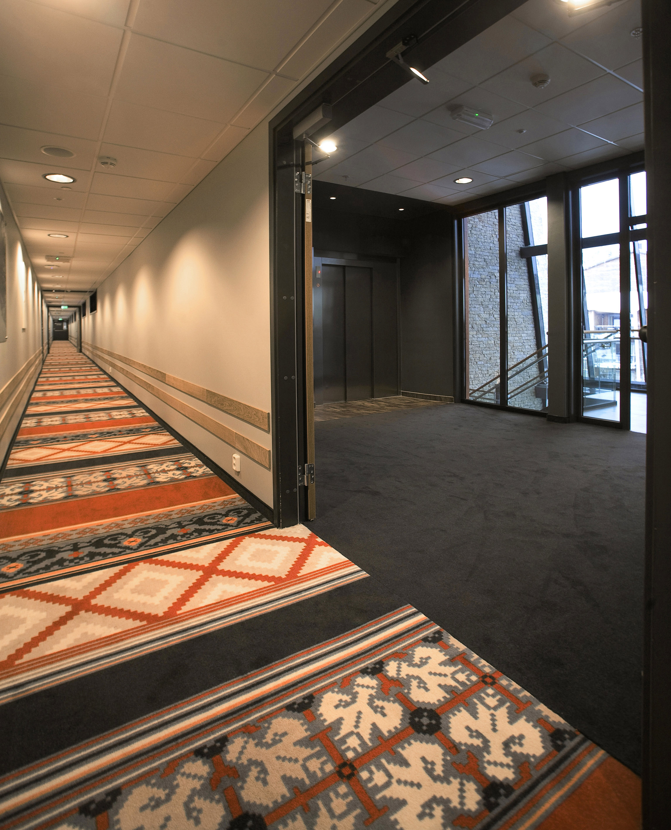 Teppene i de lange korridorene er for det meste installert lengdevis og skjøtfrie med kantsydde teppesokler langs alle veggene. Alle tepper holder samme kvalitet: 1.400 gram Highline – i kombinasjonen 80/20 i ull og nylon med filtbakside. Alle Egetepper er inneklimasertifisert og antismussbehandlet.