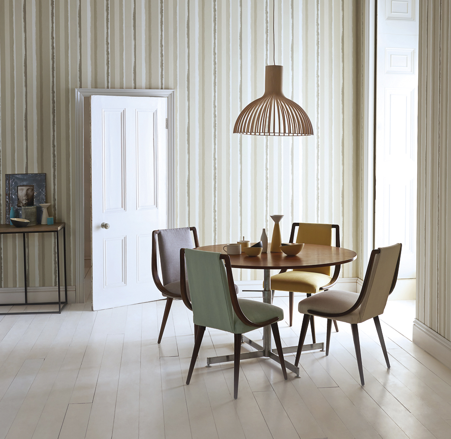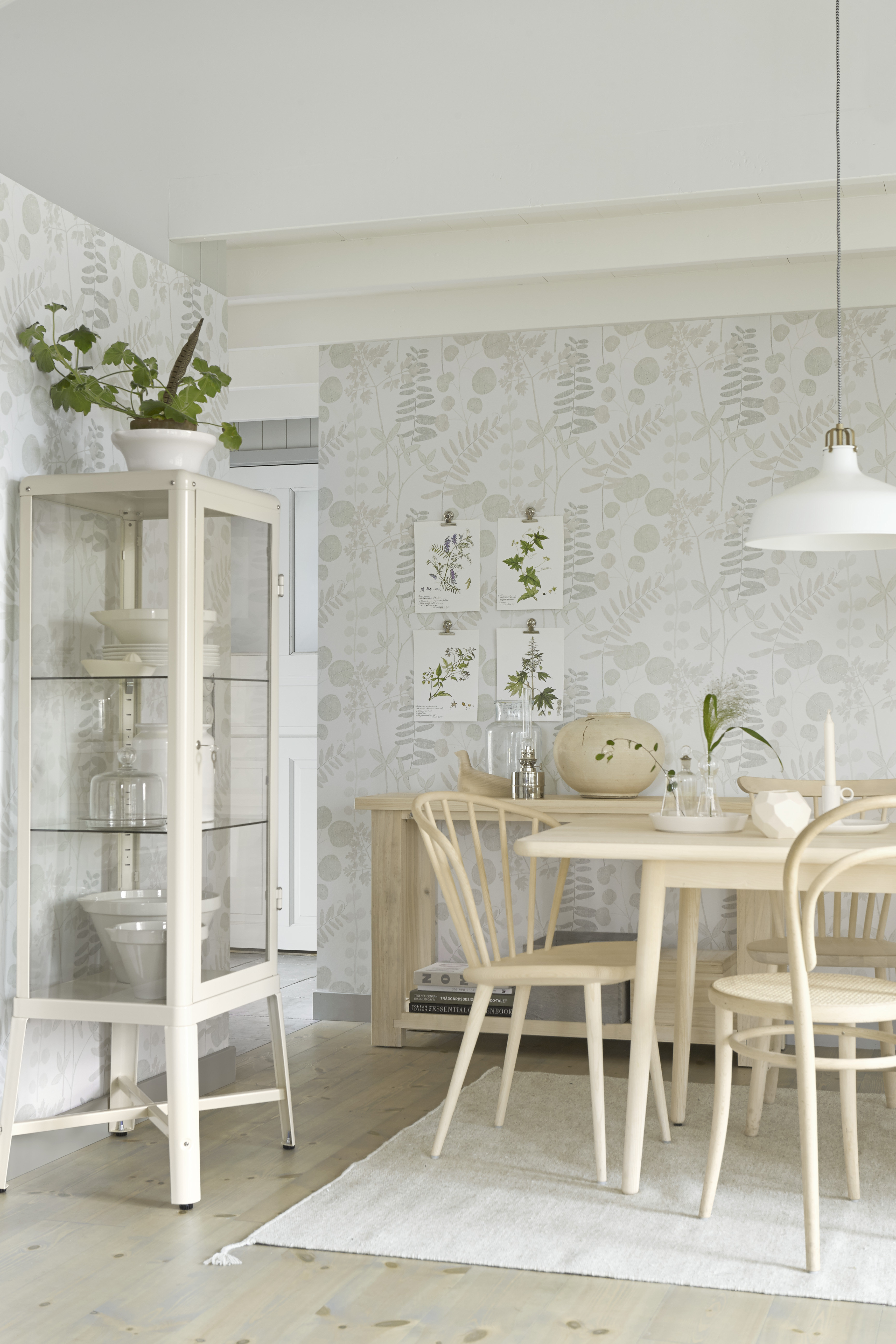 Hvilke materialer vi velger på de store flatene – vegger og gulv, er avgjørende for atmosfæren i rommet. Med åpent kjøkken eller kjøkken i stuen er det viktig å tenke helhet ved valg av materialer. Tapet er et flott materiale for å skape sammenheng mellom rommene. Du kan tapetsere alle veggene i samme design eller skape variasjon ved å mikse mønstret og ensfarget i samme fargenyanser. Tapetkolleksjonene åpner for mange muligheter.