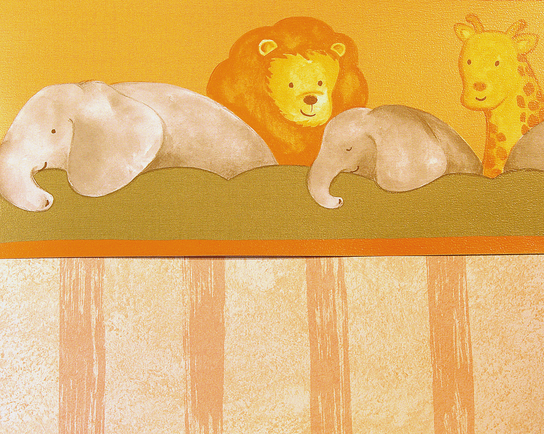 Dyrene i Afrika kan flytte inn til deg. Sebra, elefanter, nesehorn og giraffer finnes både på tekstil og bord, og kan kombineres med tapeter i gult, blått, lysegrønt og ferskenfarget som her. Velg mellom tapet med striper eller sjattert effekt.