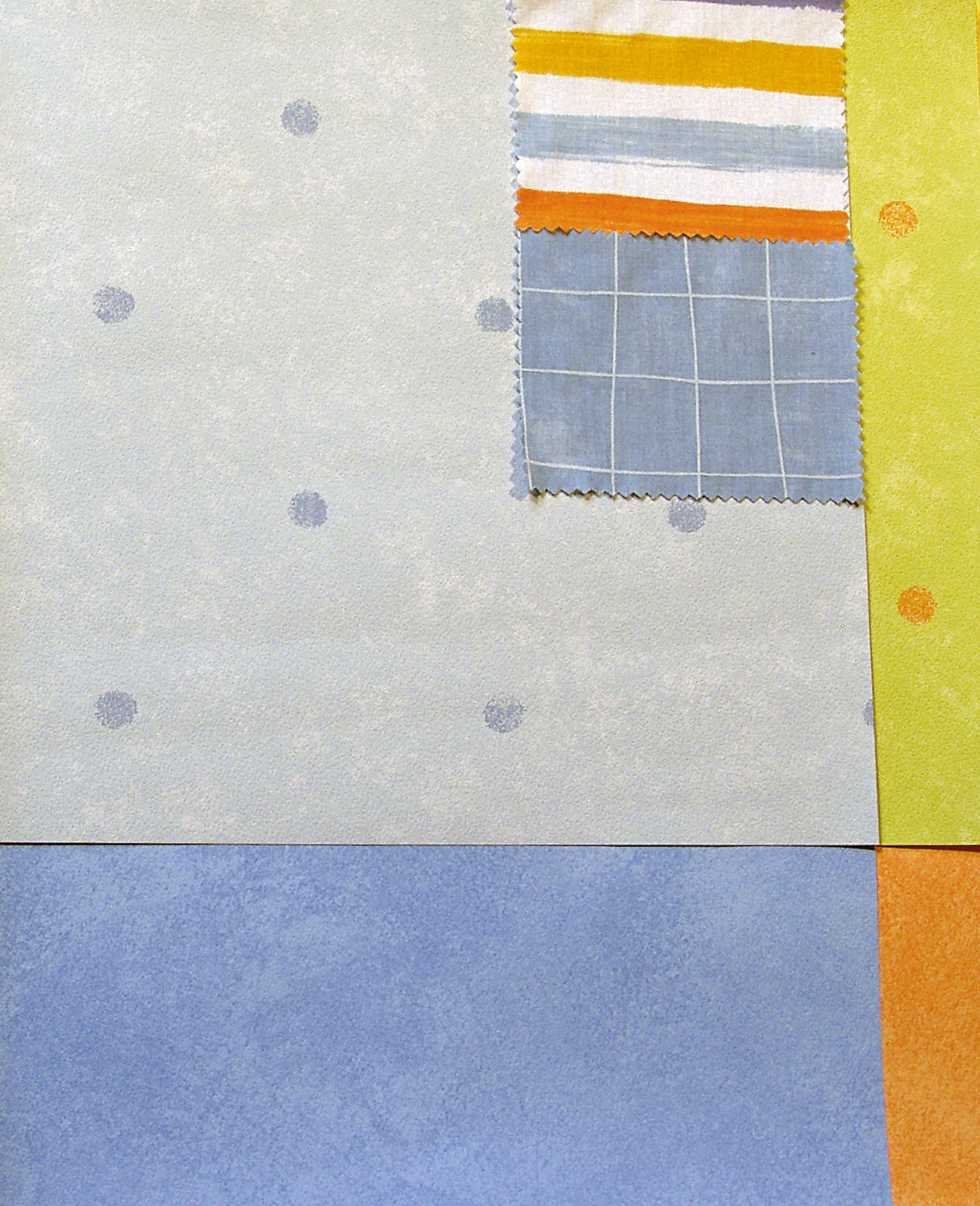 Tapeter med prikker og sjattert effekt er tidløst. Tapetene kan kombineres med stoffer i matchende farger - rutemønstret eller med fargerike striper. Tapetene finnes også i grønt med oransje prikker, hvitt med gule prikker og gult med blå prikker. En bord med glade elefanter hører også med til kolleksjonen.