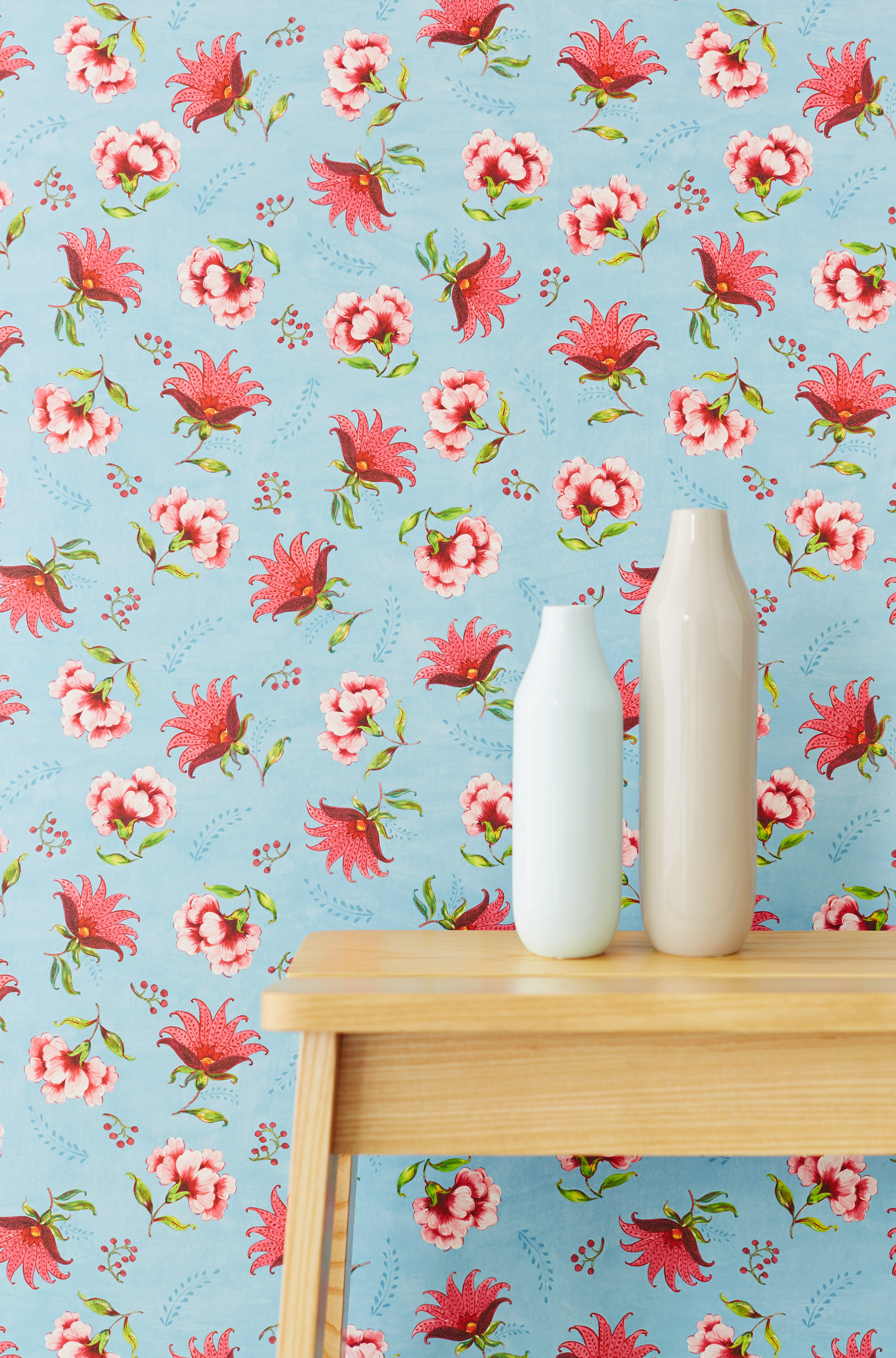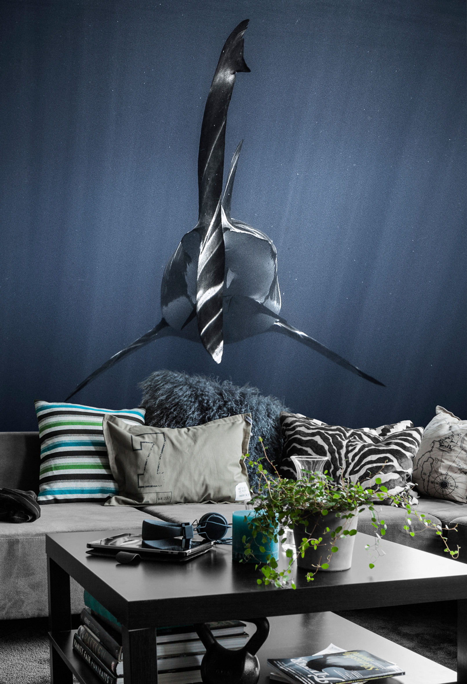 Varme, eksotiske farger blandes med det kjølige skandinaviske, som lyseblå himmel og varme, lyse farger satt opp mot «mørkt lys».