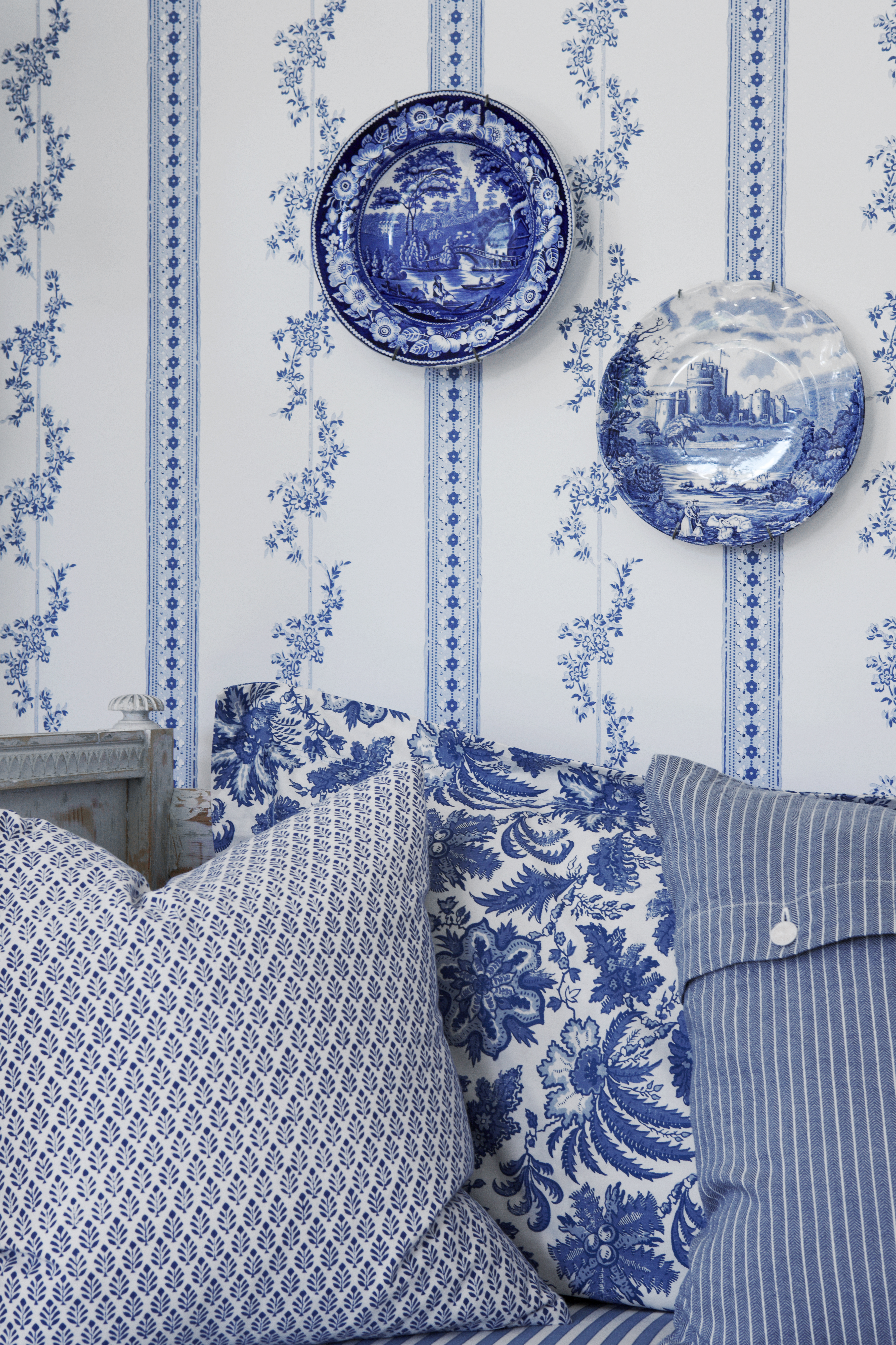 Ifølge designguru Tricia Guild er mønster en viktig faktor når en kombinerer blått og hvitt.