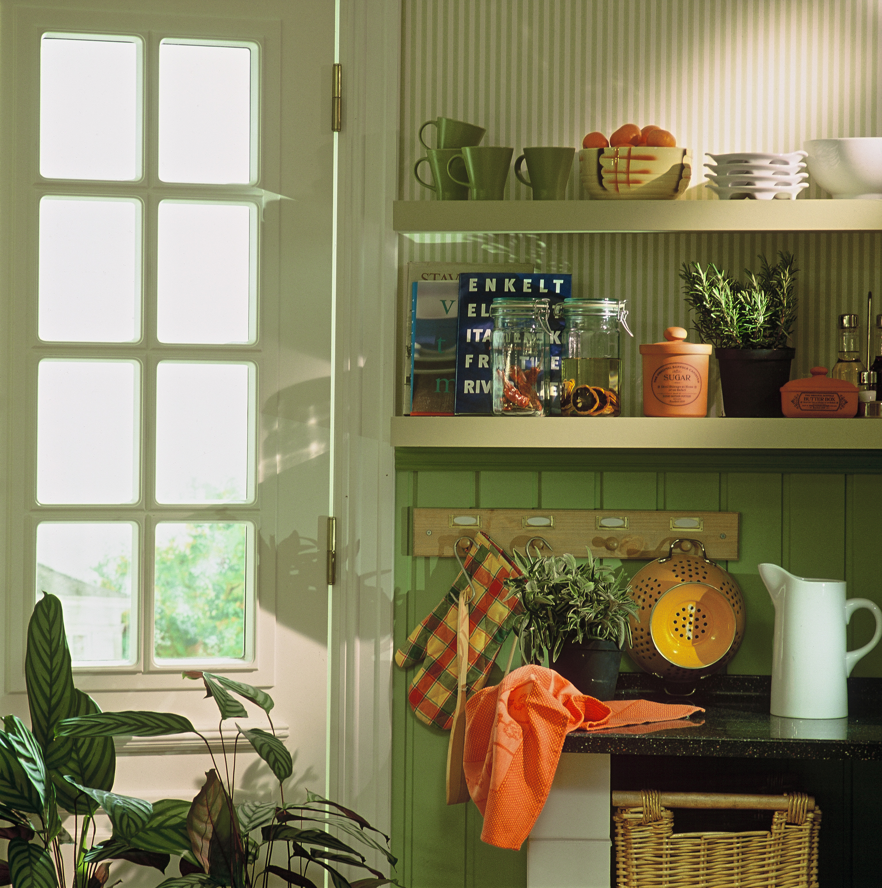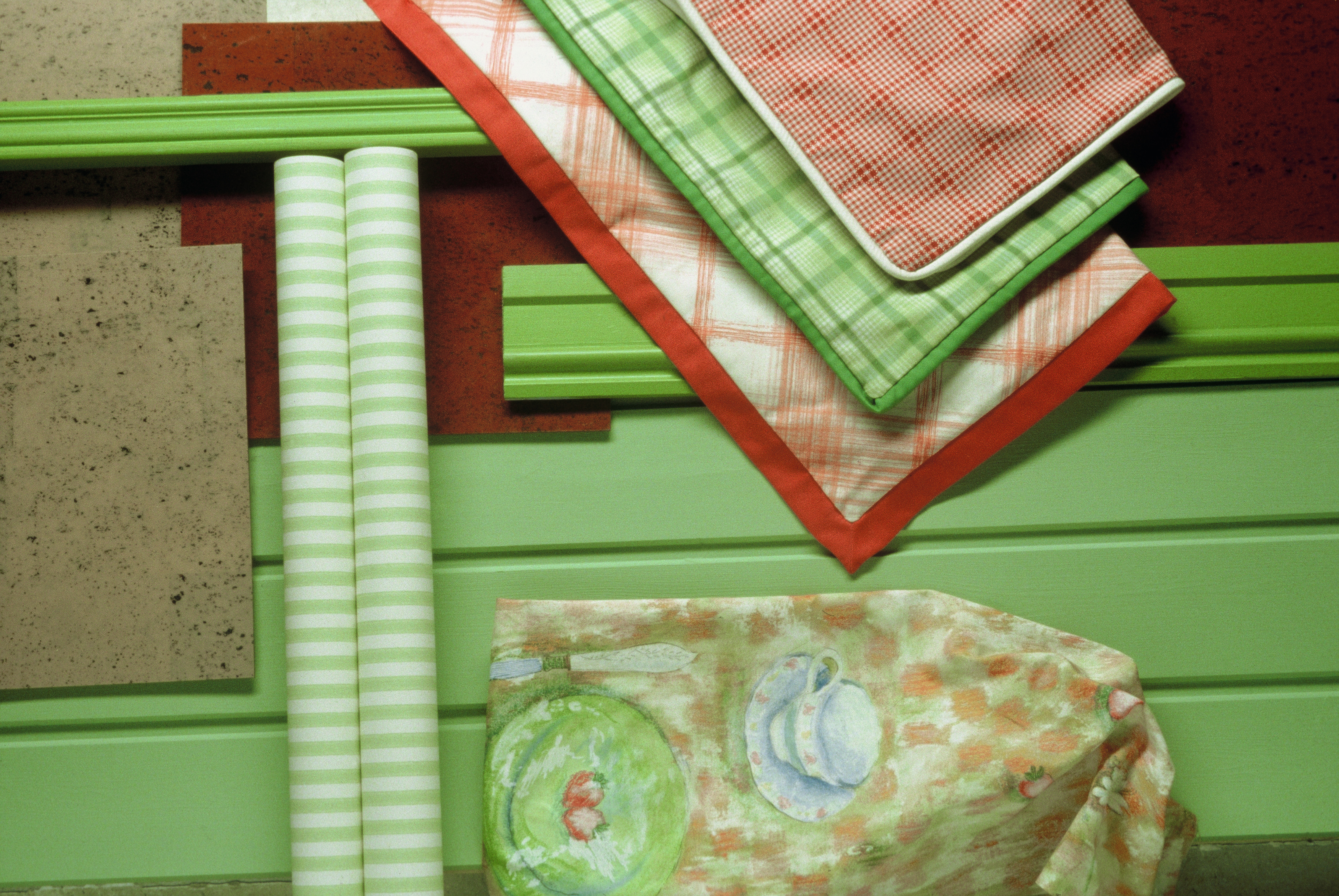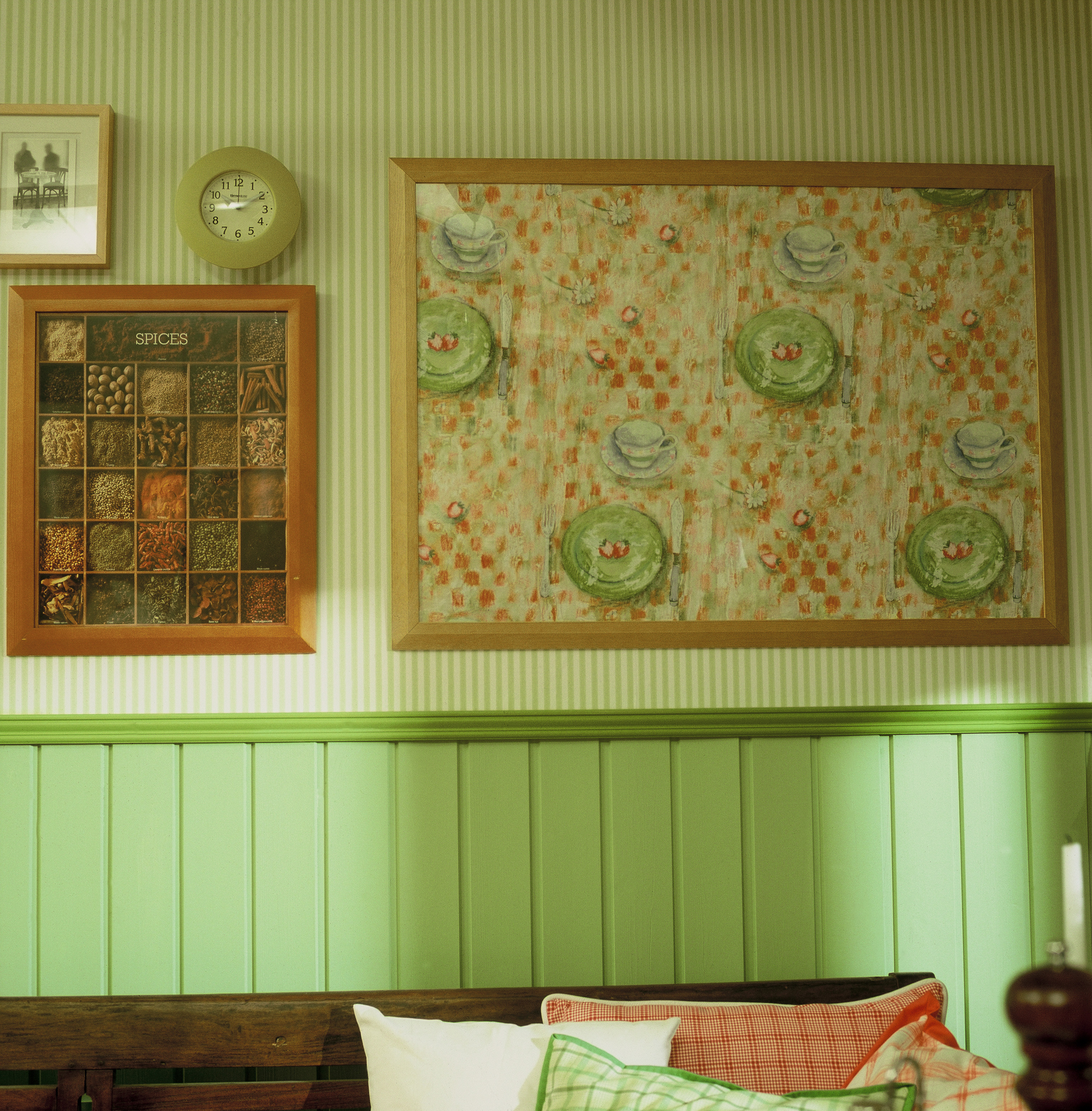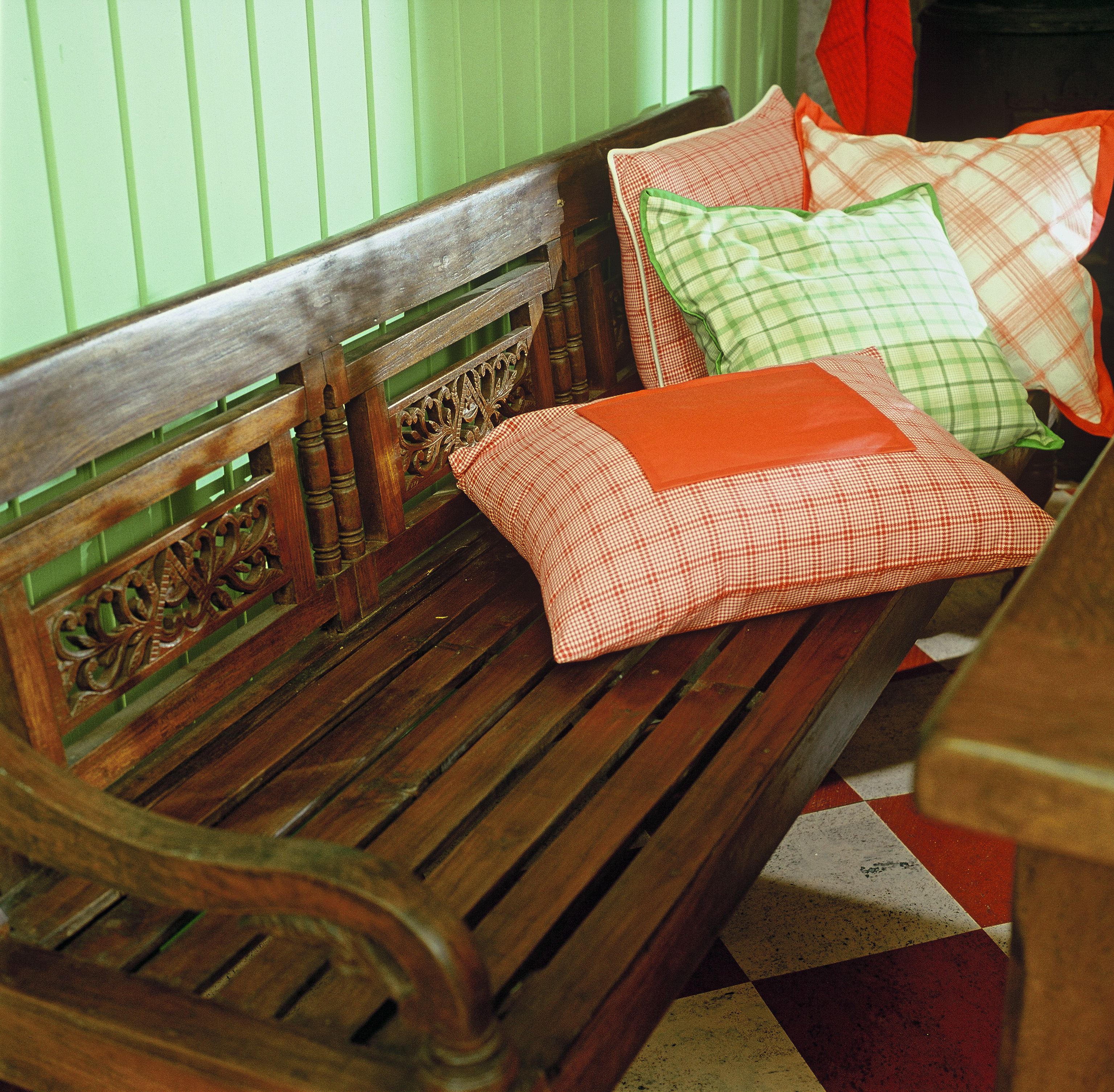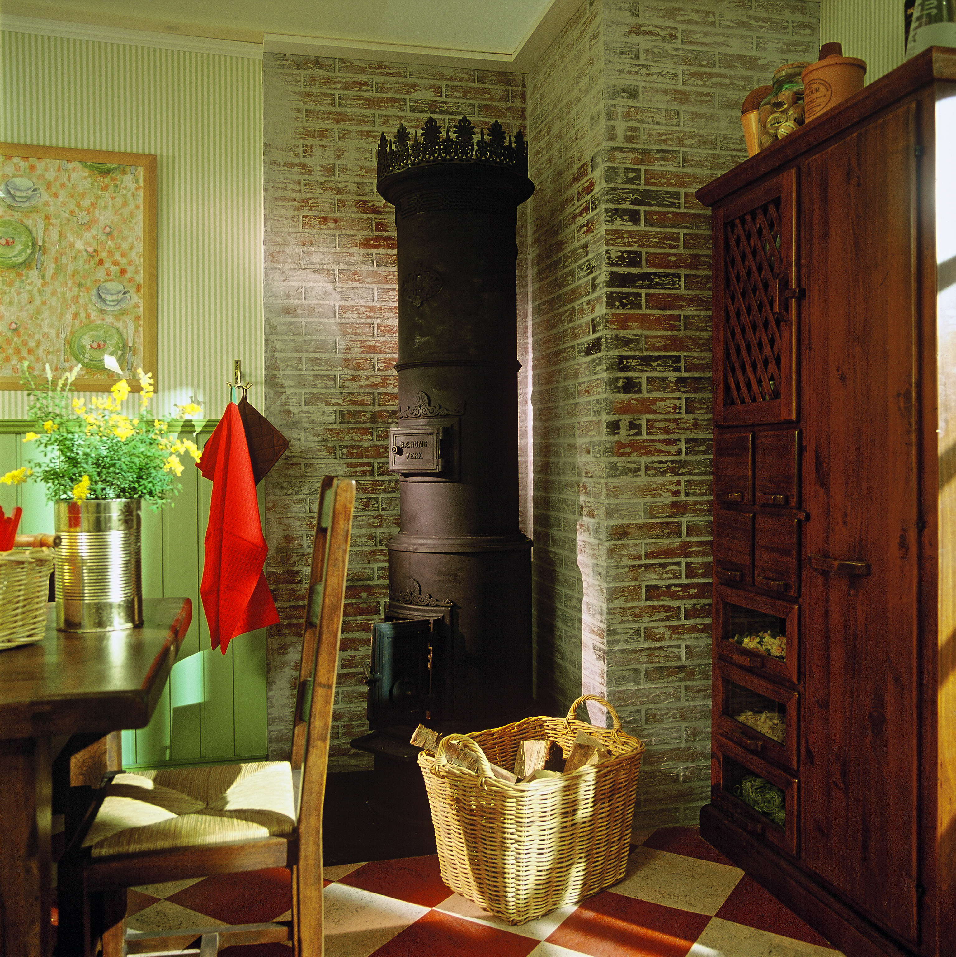 Fargesettingen i rommet bygger på toner av grønt og rødt, to komplementærfarger som fremhever hverandre. I de store flatene som gulv og vegger er fargene dempet godt ned. Bare i de små tekstildetaljene glimter det friskere til. Den gamle ovnene i hjørnet er rommets stolthet og har nettopp blitt restaurert.