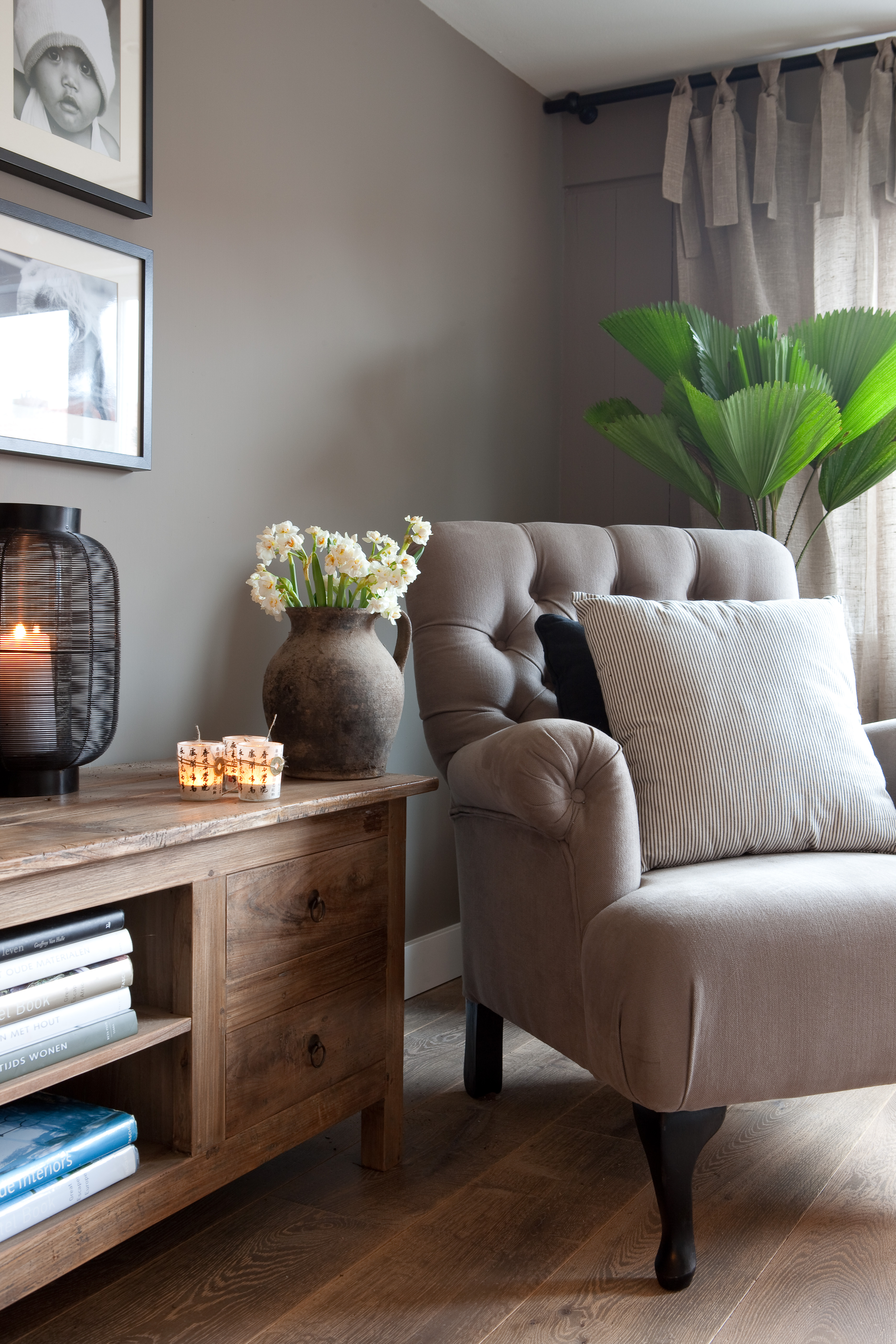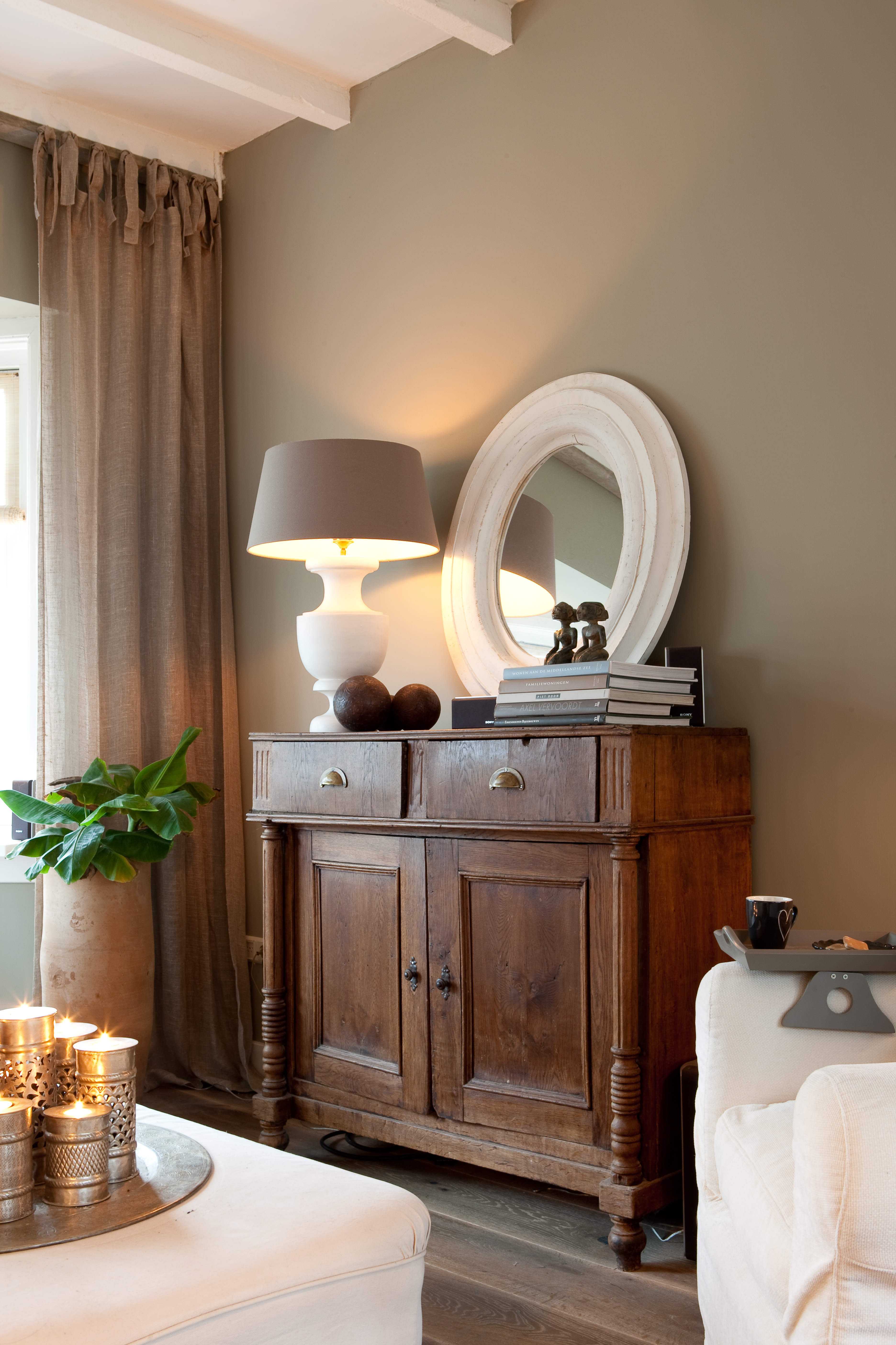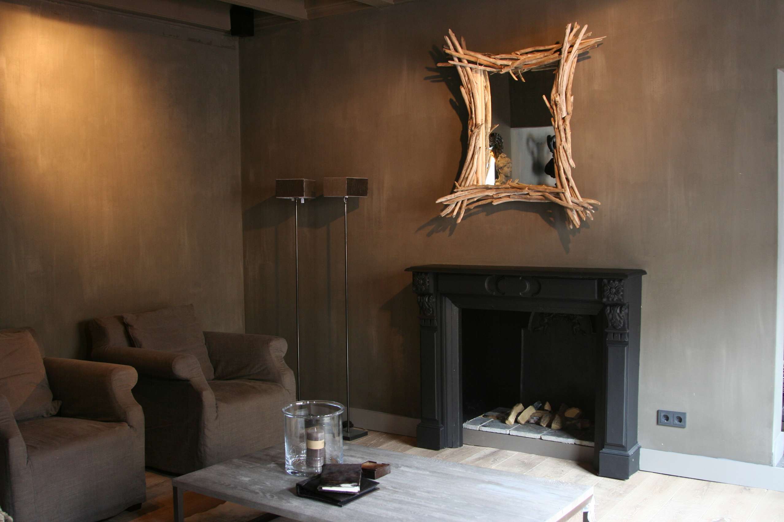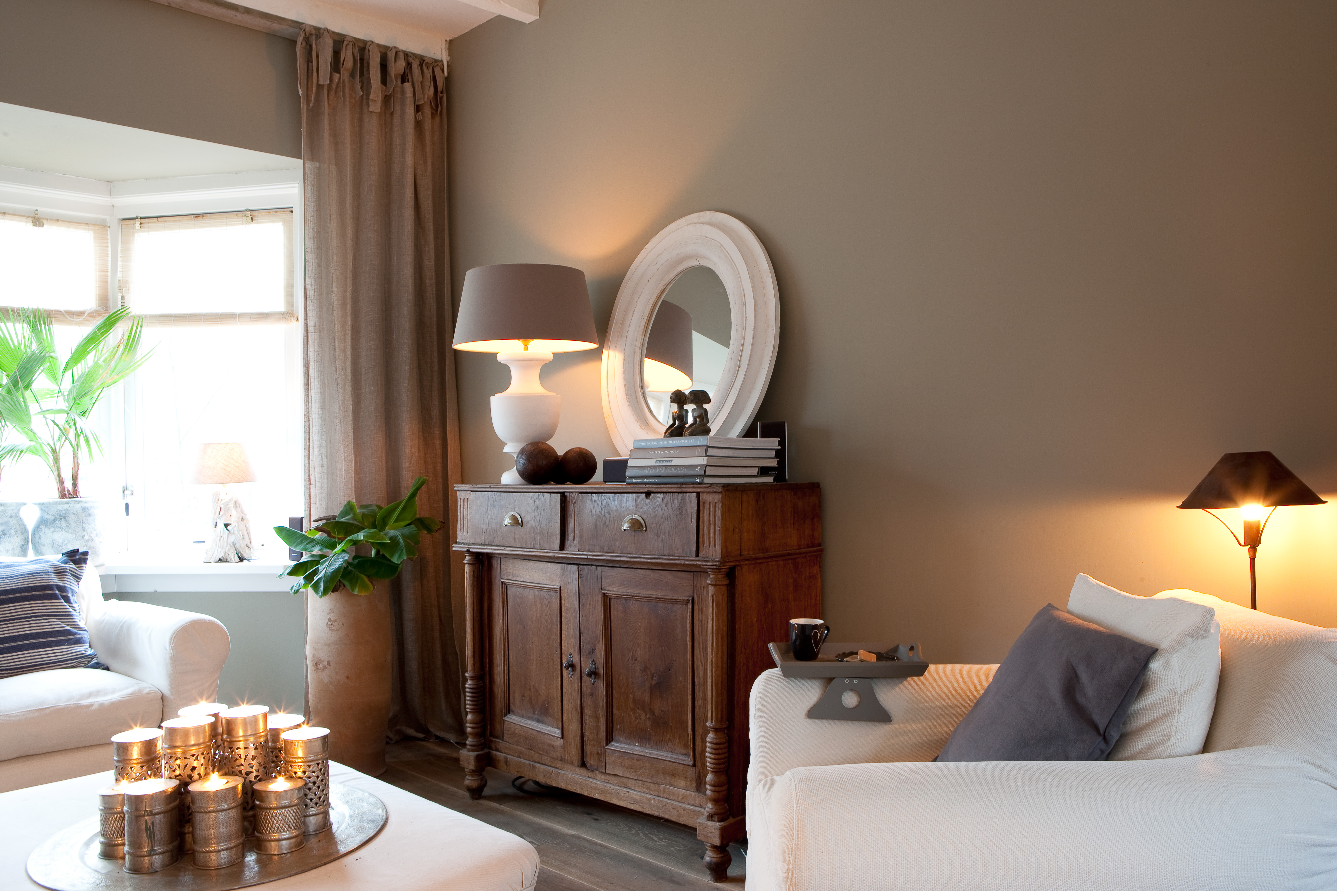 For å skape en gjennomført atmosfære i hele huset, var huseierne opptatt av at fargene skulle fungere som et lunt bakteppe. De mange spesielle gjenstandene måtte få den oppmerksomheten de fortjente, og skulle ikke behøve å kjempe mot de øvrige fargene i interiøret. Valget falt derfor på tidsriktig kalkmaling fra Pure & Original på veggene i alle rom. De aller fleste rom fikk den helmatte malingtypen Classico, som gir et helt dødmatt utseende. En annen malingtype fra samme produsent, Fresco, med sin spesielle betonglook, ble brukt som et spennende krydder forskjellige steder i huset.