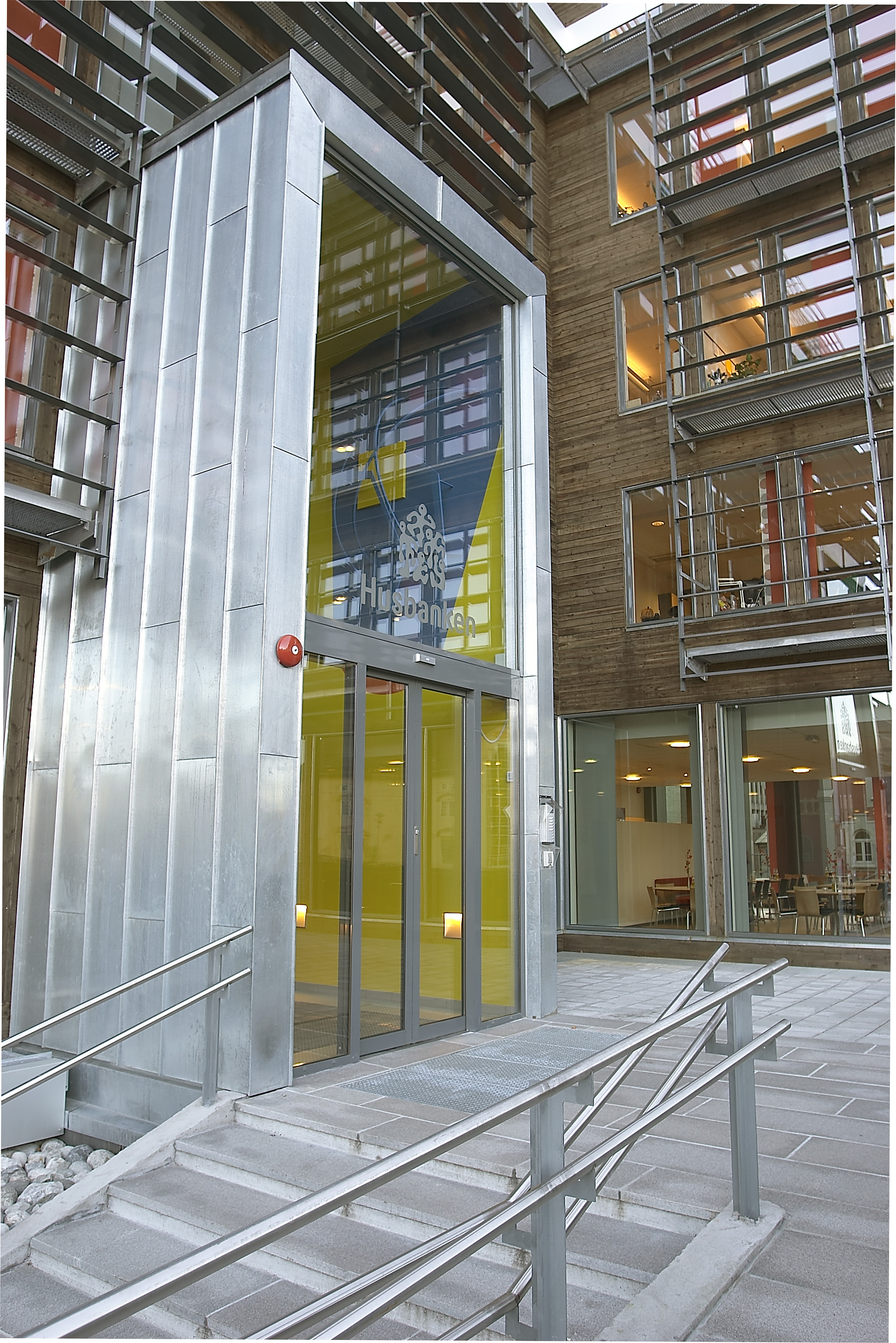 - Inngangspartiet, sammen med skulpturer på utsiden og en del veggkunst, bl.a. på styrerommet, er resultatet av en konkurranse om kunstnerisk utsmykning. I utgangspunktet var jeg meget skeptisk til vår fargeholdning mot det syrlig grønne, men mange synes det er blitt en spennende kontrast. For meg er det to forskjellige verdener. Men inngangen er noe du går igjennom - ser - og legger bak deg når du kommer inn.