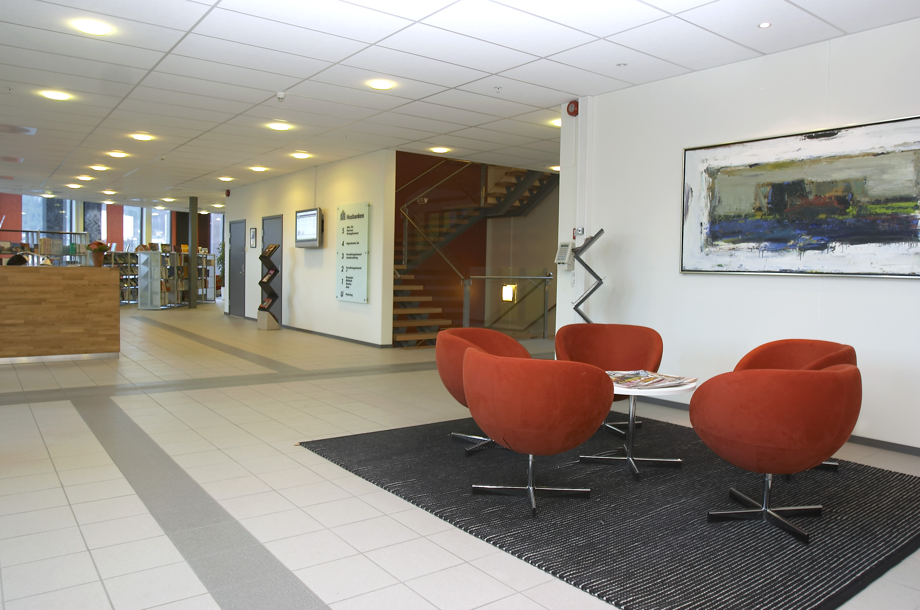 - Husbanken ønsket å gjøre det trivelig i sitt nye bygg. Vi valgte en nøytral ramme, men med varme innslag i gult og rødt der hvor det er sosiale møteplasser. Fargene er friske og intense nok til å gi det lille ekstra, men likevel avdempede, tidløse og holdbare over tid. I tillegg valgte vi eik på enkelte gulv, bl.a. i styrerommet, foruten bjørk i møbler på arbeidsplassene. Materialenes farvelød gir mye stofflighet og varme til et ellers nøytralt miljø med hvite vegger og grå linoleumsgulv.