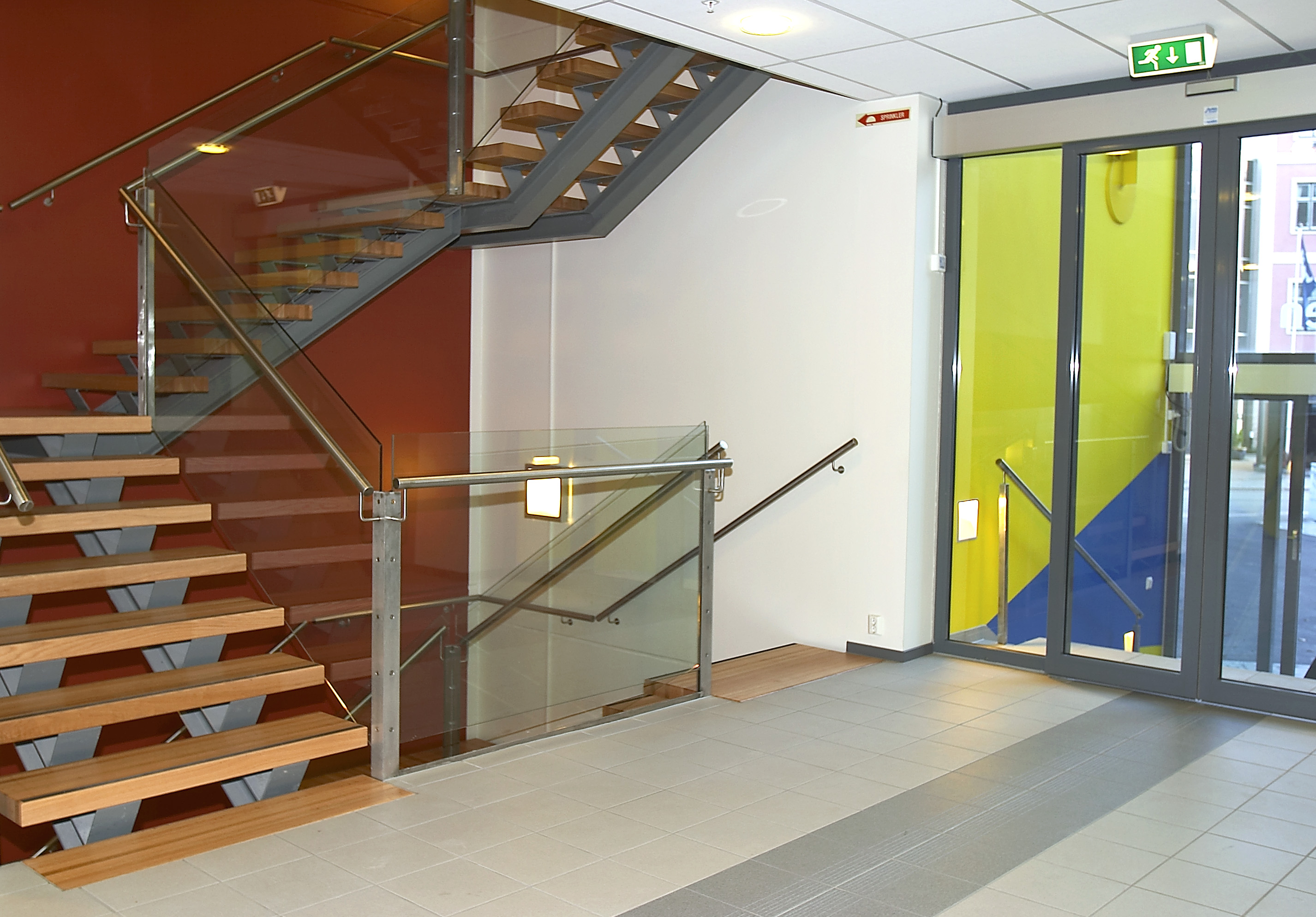 - Allerede når man kommer inn i bygget får man en fargeopplevelse med kjølig blått og syrlig grønt i inngangspartiet og en varm rød trappeoppgang?