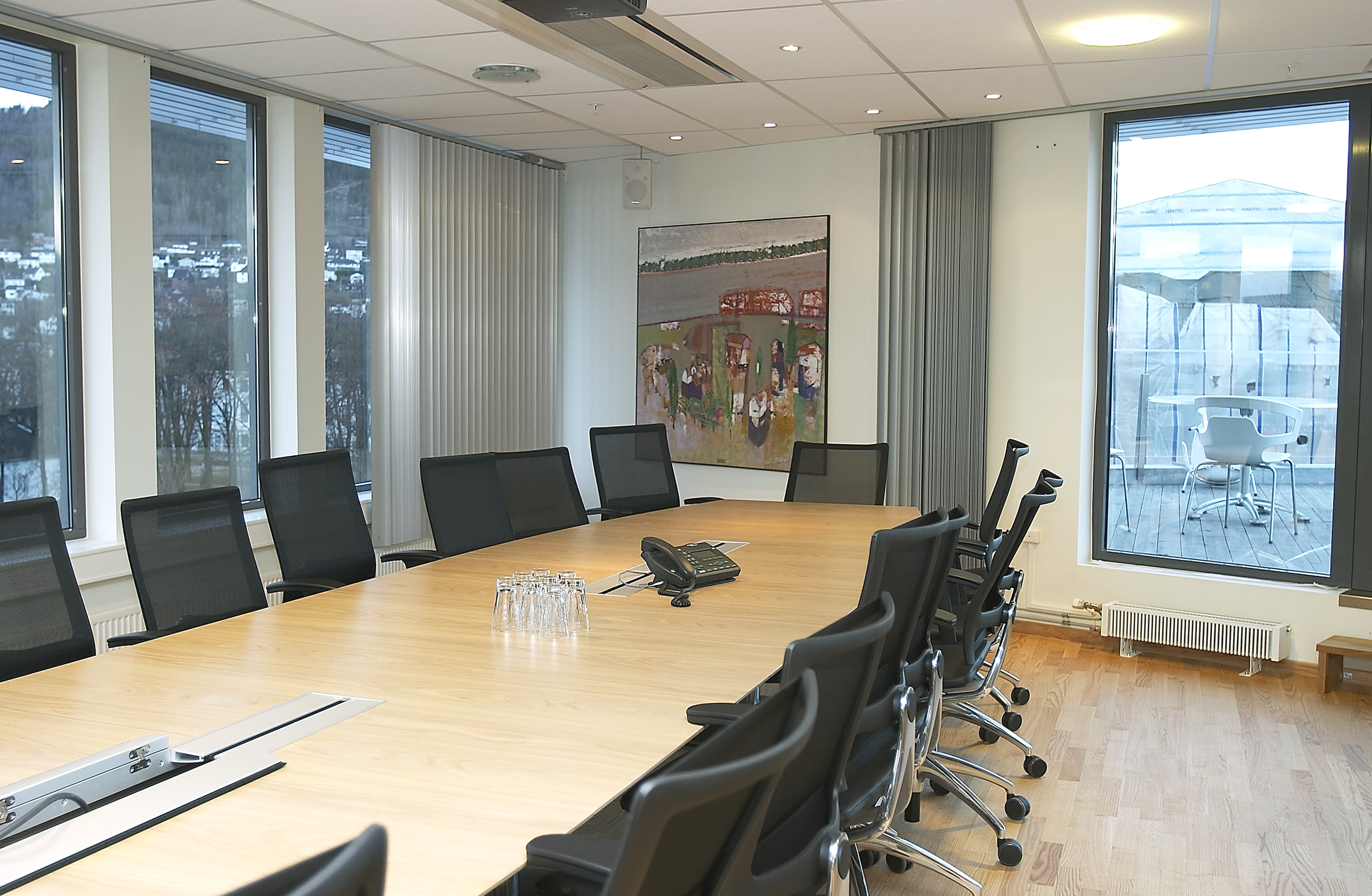 Til solavskjerming er det brukt både lamellgardiner og paneler. Disse fanger opp fargeholdningen i bygget samtidig som de supplerer utvendig avskjerming.