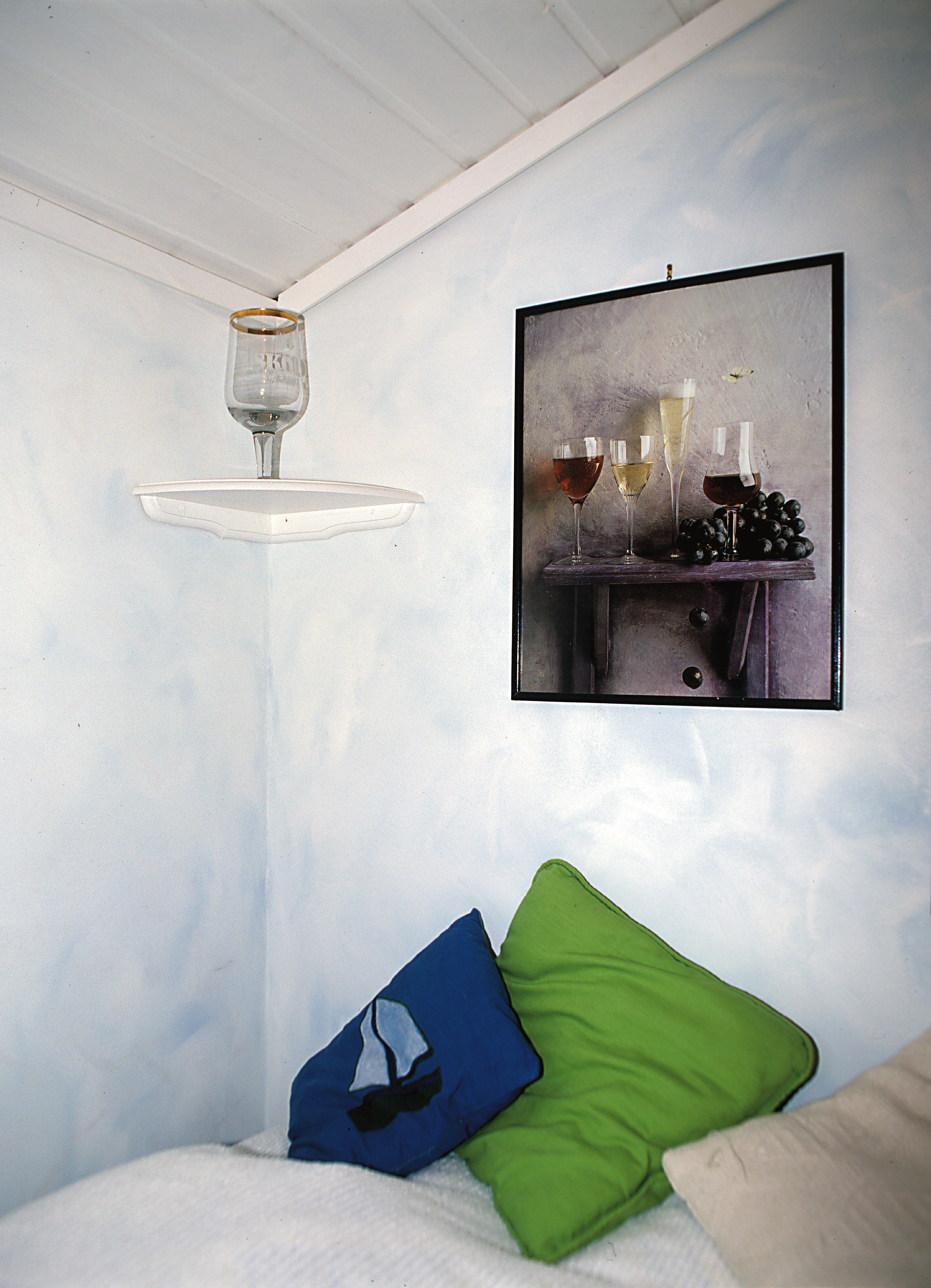 Fra gangpartiet i 2. etasje går man inn i dette gjesterommet hvor det i motsetning til trapperommet er valgt å bruke en helhetlig maleflate. Det er først påført en hvit vannbasert heftgrunning. Deretter er det brukt to sandeffektmalinger samtidig. Dette er en maling som gjør det mulig å helle to farger i karet samtidig uten at de flyter sammen. Man dypper da penselen midt i karet slik at man får begge fargene på penselen. Fargene her er hvit og blå, den blå i fargekode S 3020-R80B. Viltstrykingen er her dratt godt ut for å få effekten lysest mulig. Kraftigere effekt får man ved mindre bearbeiding av de to fargene.