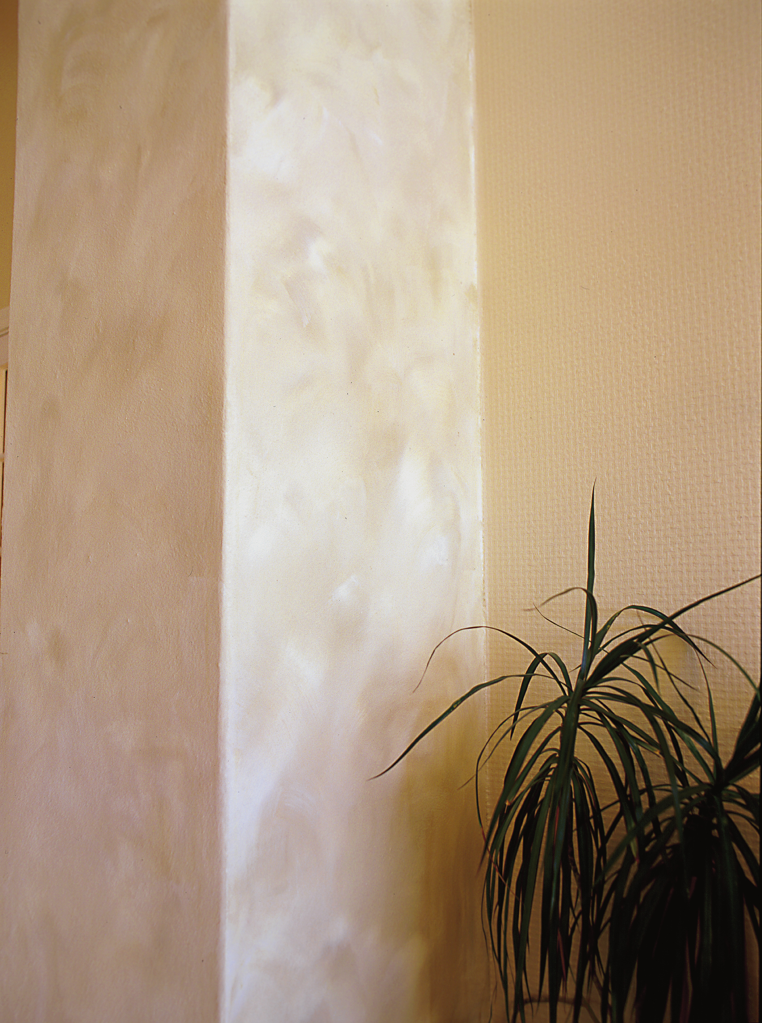 I stuen avløses en tradisjonelt malt glassfiberstrie med et parti mur. Muren er først heftgrunnet; deretter er det benyttet sandeffektmaling hvor viltstrykingen er foretatt med to farger samtidig: S 1002-Y og S 2020-Y30R. Også her er det brukt en bred pensel til viltstrykingen. Utseendet blir mykt sandet i tillegg til fargespillet.