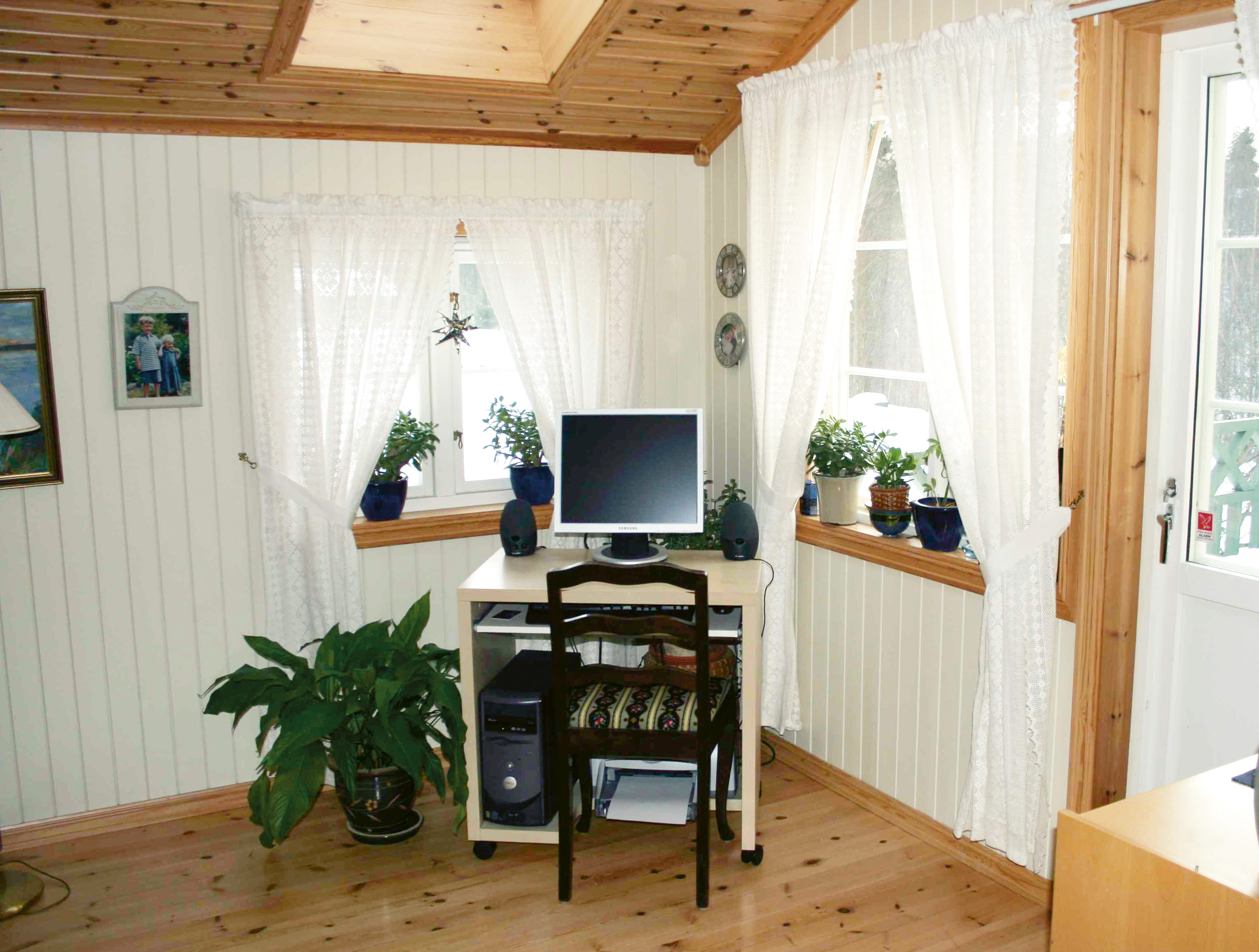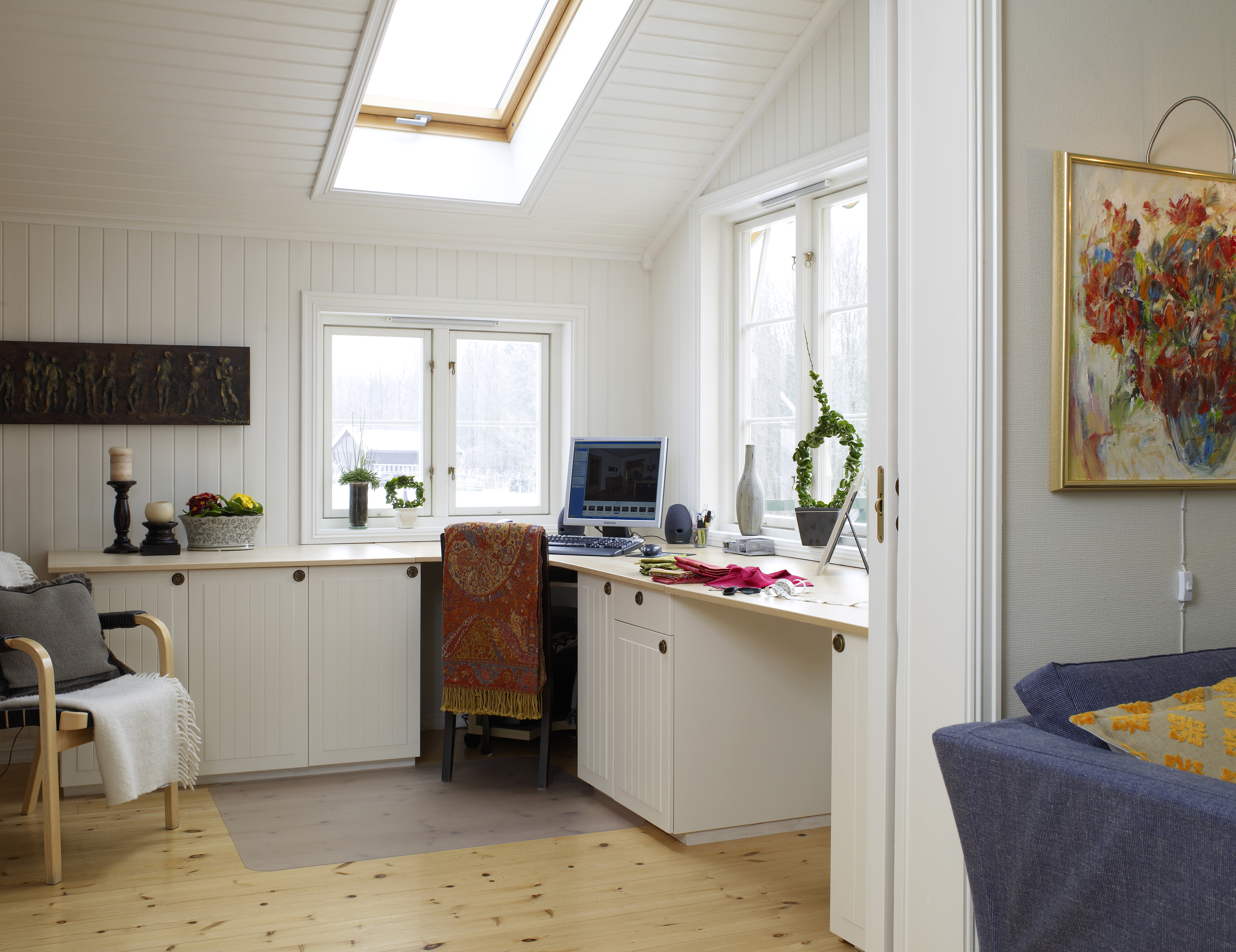 Fra bare å ha et lite bord til PC'en, har rommet nå fått mye plass både til arbeid og oppbevaring. Her er til og med et intergrert strykebrett i en skuff. Møbleringen er en kombinasjon av Ikea kjøkkenskap og bordplater til kontormøbler. For å få skapene, som er 60 cm dype, til å passe sammen med de 80 cm dype bordplatene, ble bordplatene lagt på gulvet og tegnet rundt, og skapene så satt innenfor disse rammene.