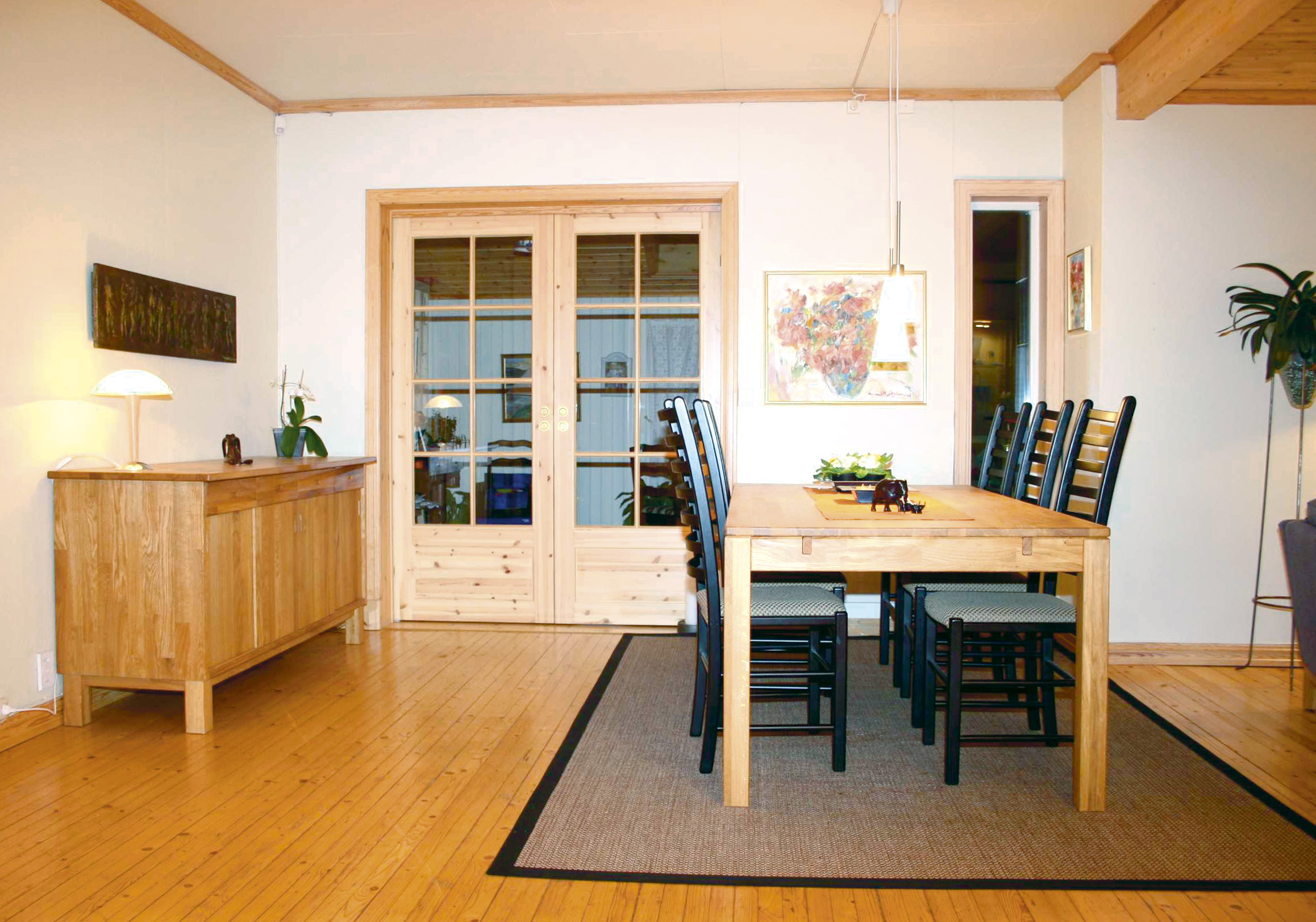 Spisestuen ble flyttet inn der det før var TV-stue. Dette ble også mer praktisk, da rommet er vegg i vegg med kjøkkenet. Endeveggen ble både dekorativ og nyttig da Oddmund bygde ferdige Ikea kjøkkenskap sammen med en selvkomponert tallerkenhylle. De dype underskapene rommer mye. Overskapene med glassdører har fått hver sin spot, som er med på å lyse opp rommet, og fremhever vakre bruksgjenstander. Listene til tallerkenhyllen er festet med skruer fra innsiden av skapene. Skapene går egentlig ikke helt opp til taket, men Oddmund har kledd dem inn både på toppen og sidene. Slik blir de en naturlig del av rommet, noe som forsterkes ved at alt er malt i samme farge som veggene, bare blankere.