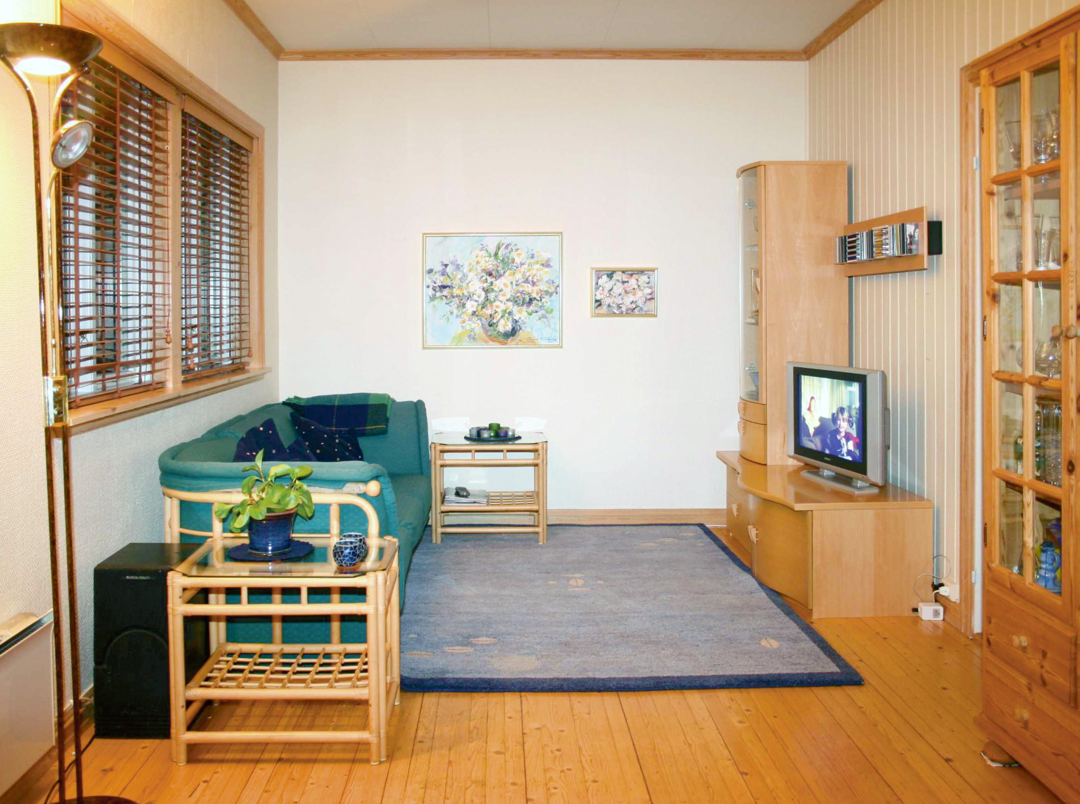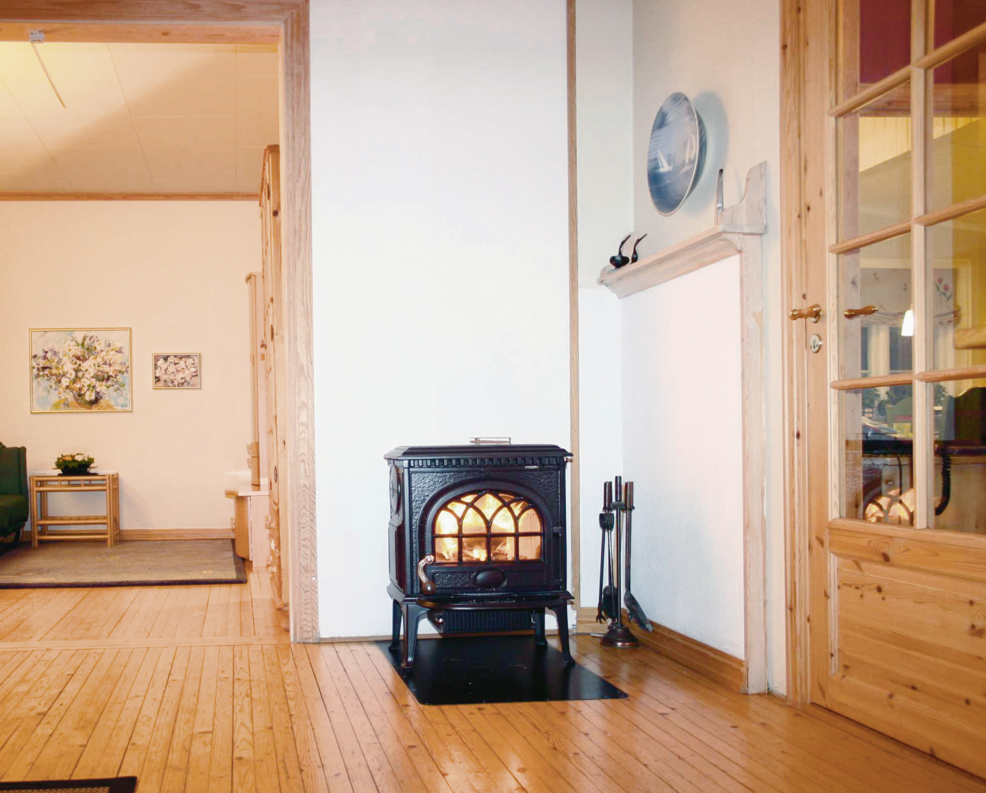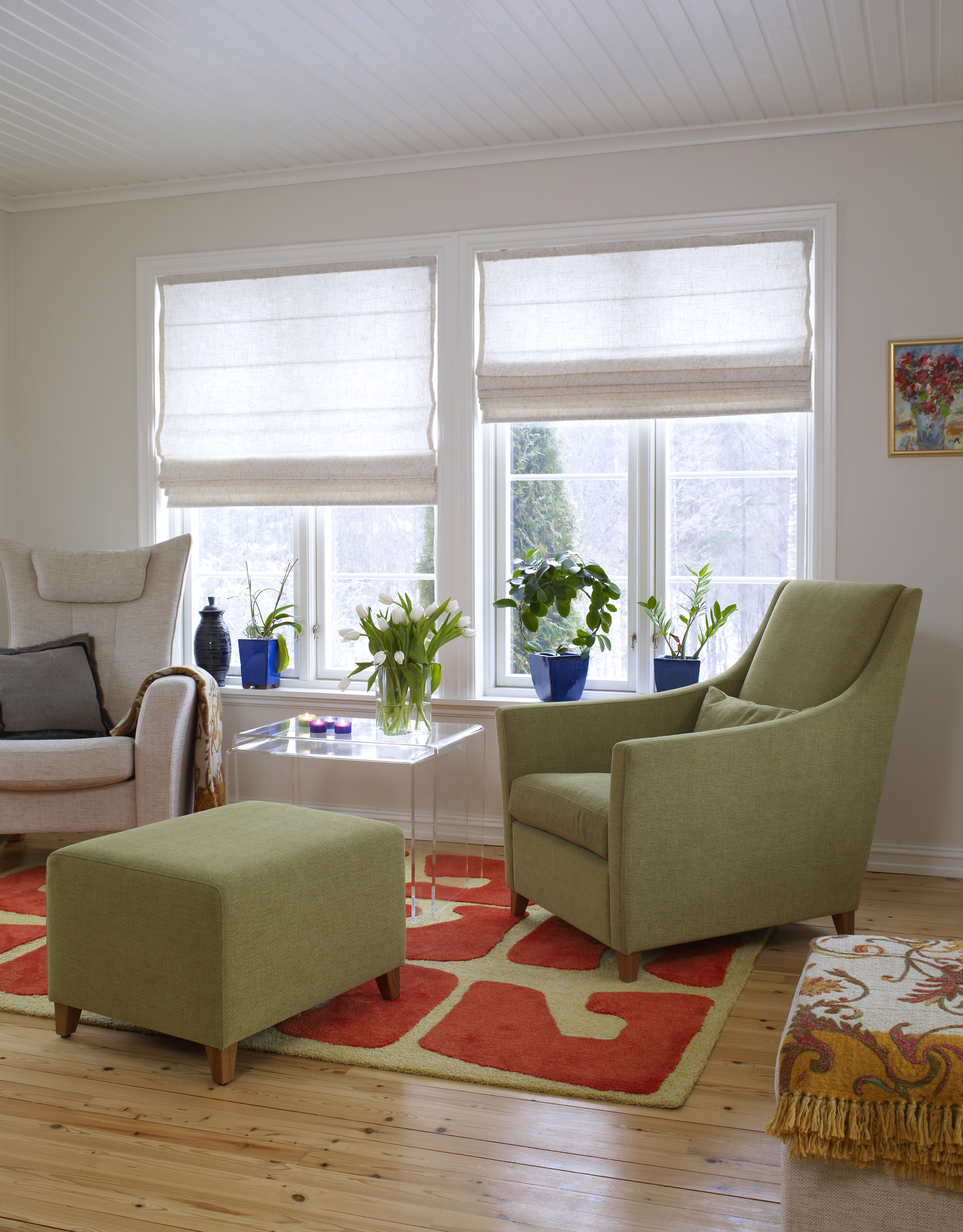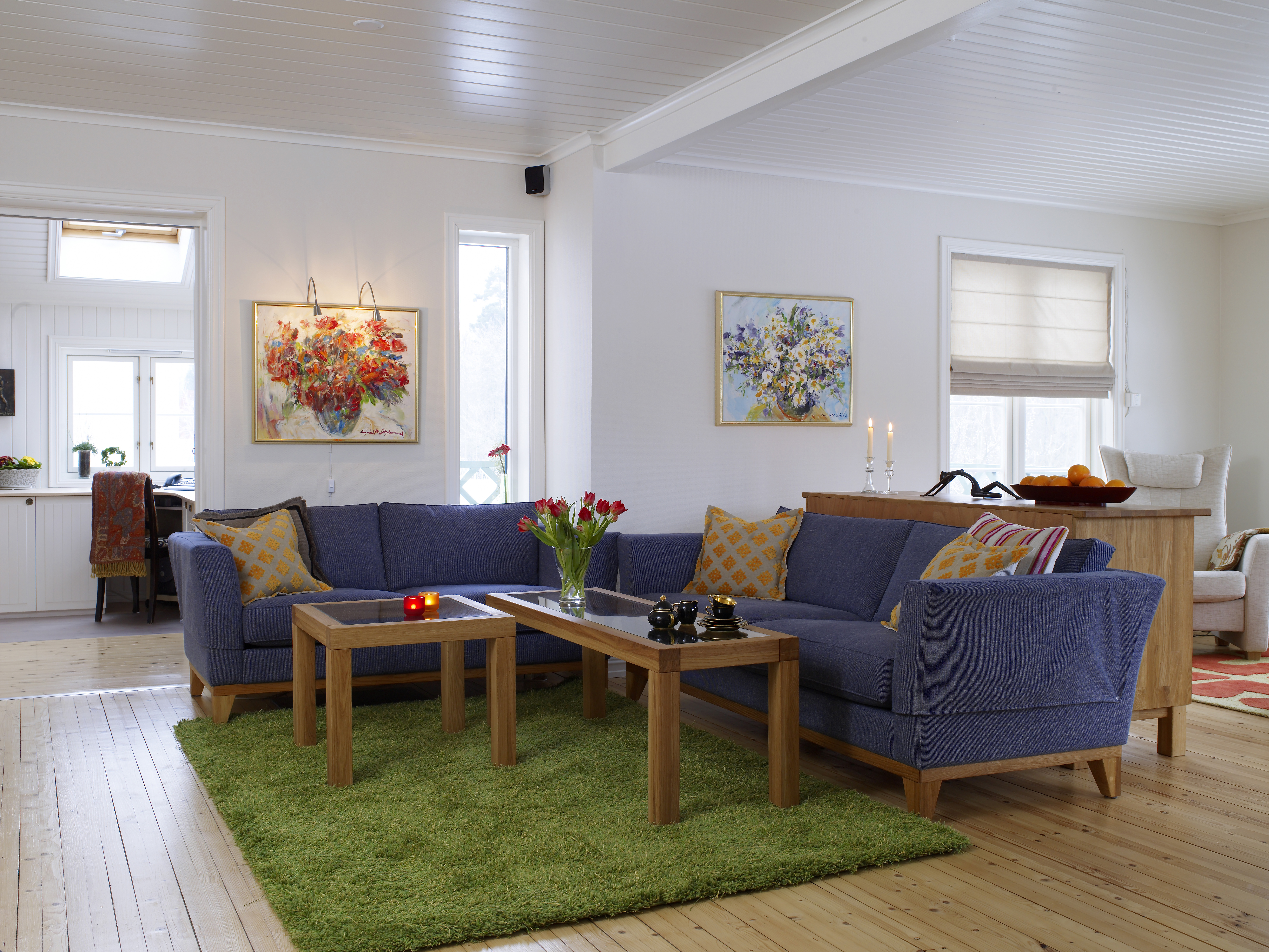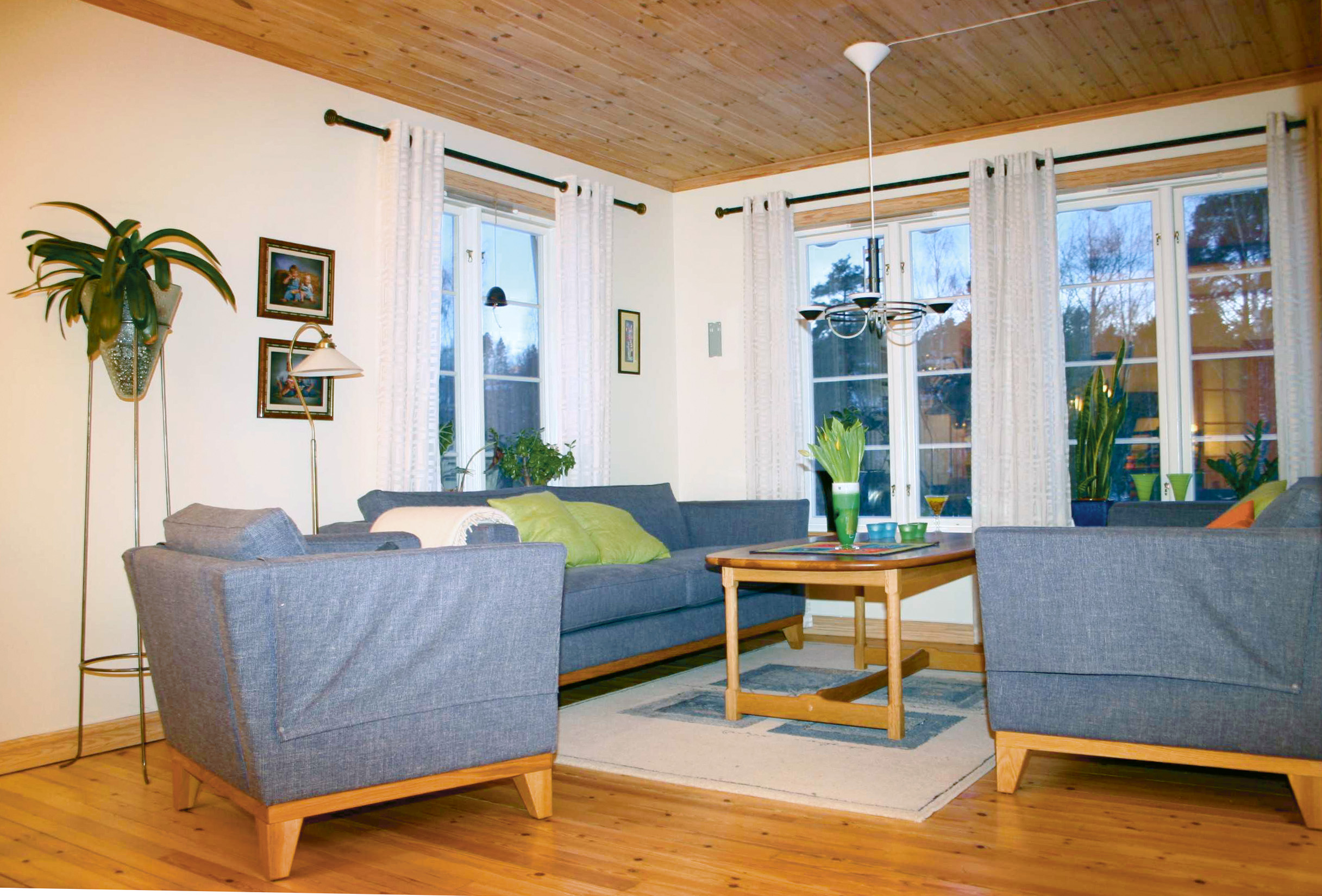 Stuen er i dag delt i to avdelinger, skilt med en buffet. Der det er mest vinduer, er det laget en ren kosekrok med gode stoler. Vår og og vinter er det særlig deilig å sitte i denne lyseste delen av stuen, hvor solen skinner inn av tre vinduer. For bedre å fremheve vinduenes form, har de fått liftgardiner, som er lite dominerende og gir et rolig inntrykk.