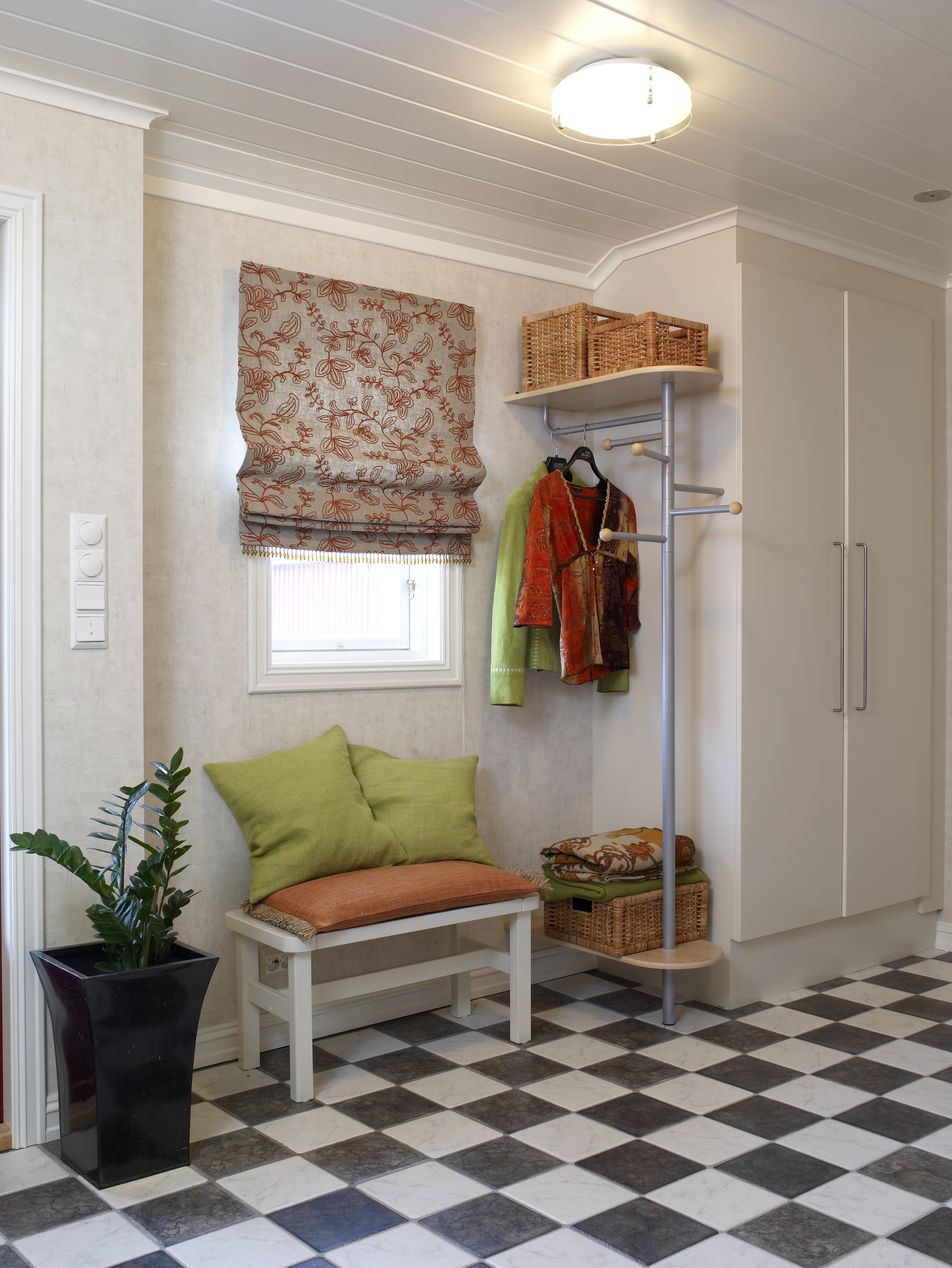 I gangen ble det gjort en kraftig opprydning både i møbler og farger. Et trangt vindfang ble revet og innlemmet i hovedrommet, som fikk en ny og bedre isolert inngangsdør.