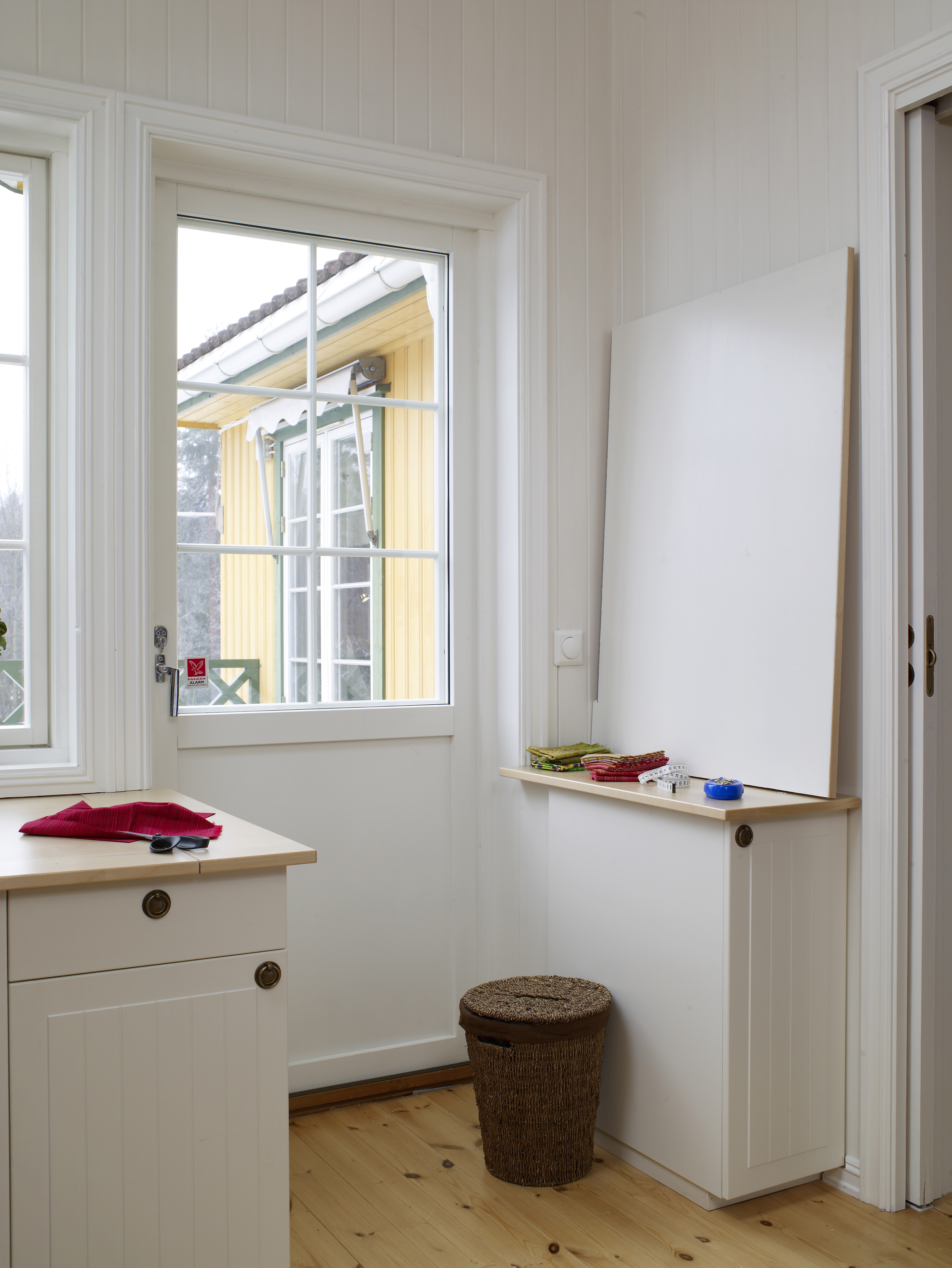 Skapene ble satt i system ved at nye skapfronter ble kjøpt på Ikea, mens skapstammene ble ført helt opp til taket. Slik blir ikke skapene bare store kasser, men en del av rommet, og danner en hyggelig nisje til sittegruppen. Vinduet fikk en mønstret liftgardin som dekorativt element.