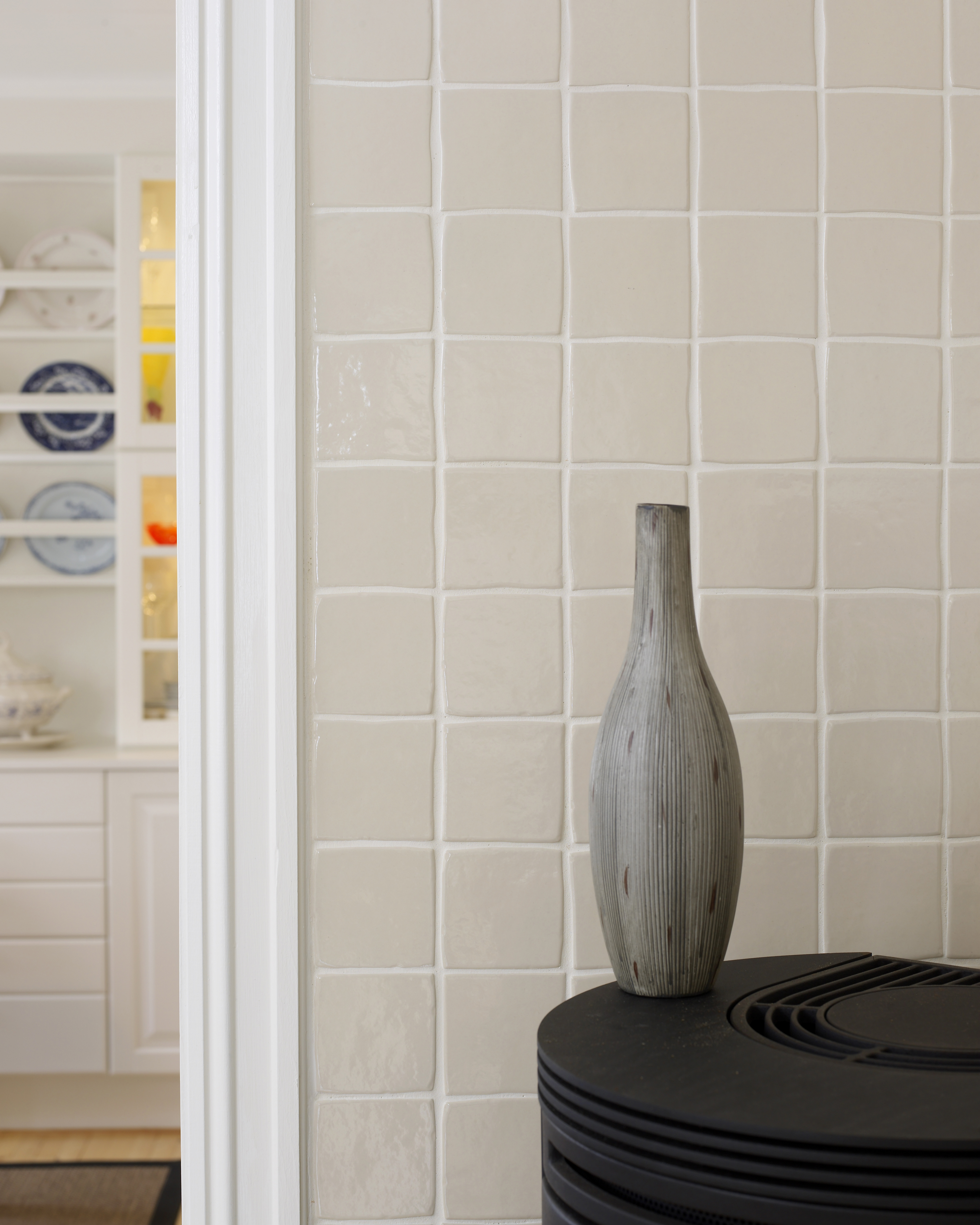Håndtakene ble byttet til en mer gammeldags stil, samme som i spisestuen. For et helhetlig inntrykk er alt malt i samme farge som veggen, bare blankere. At skråtaket, som før var i furu, er malt hvitt, gjør mye for rommets størrelse og følelsen av lys og luft.