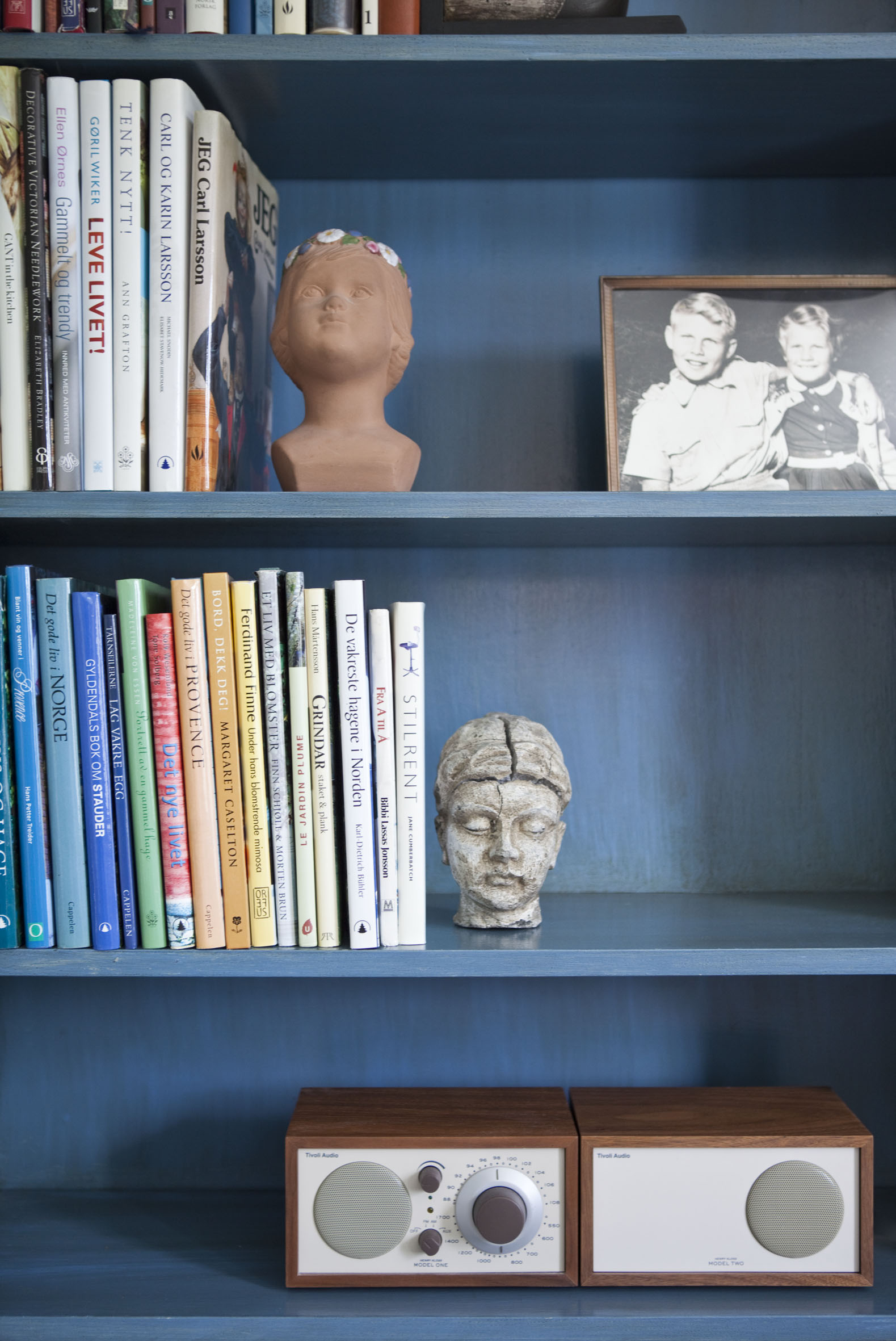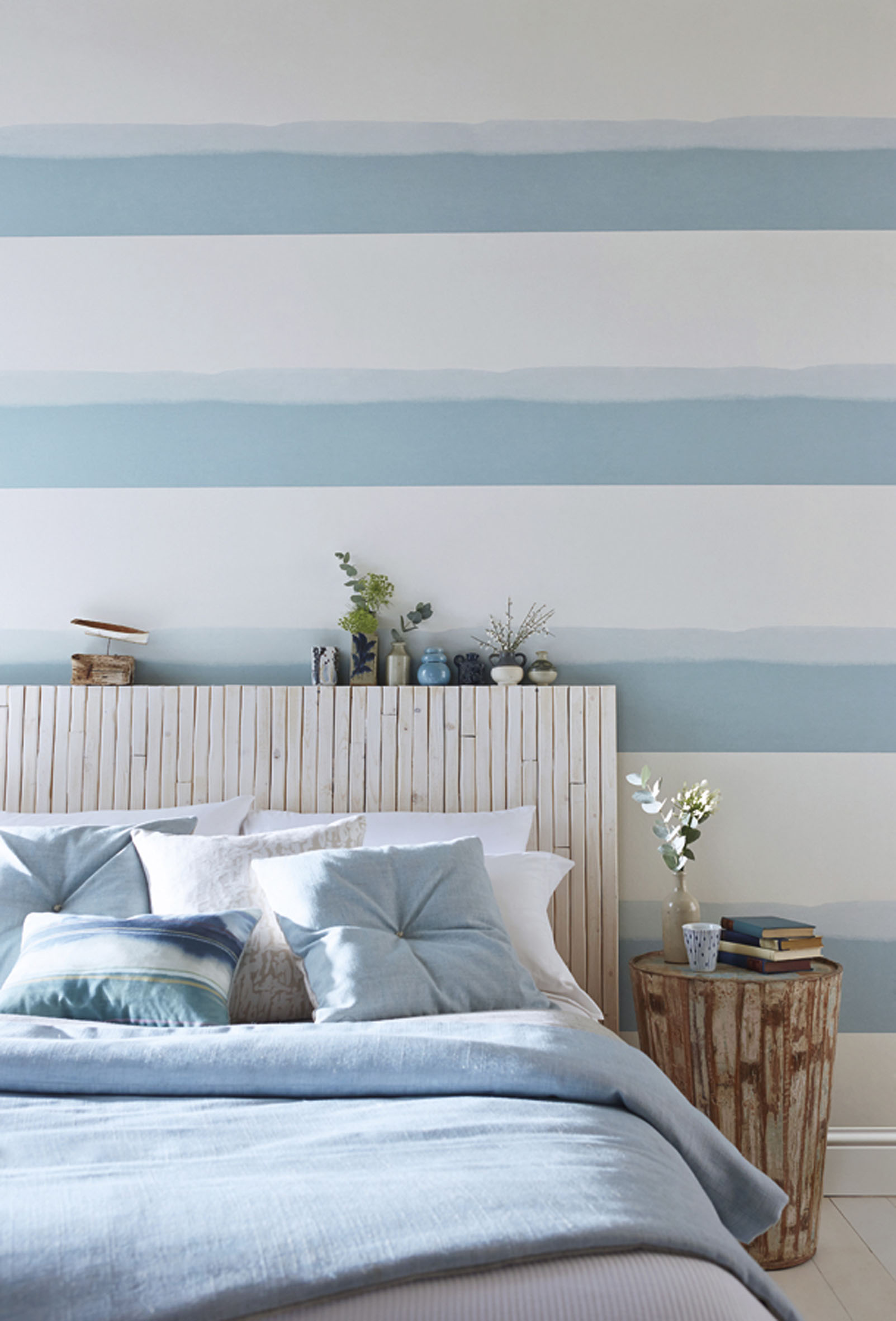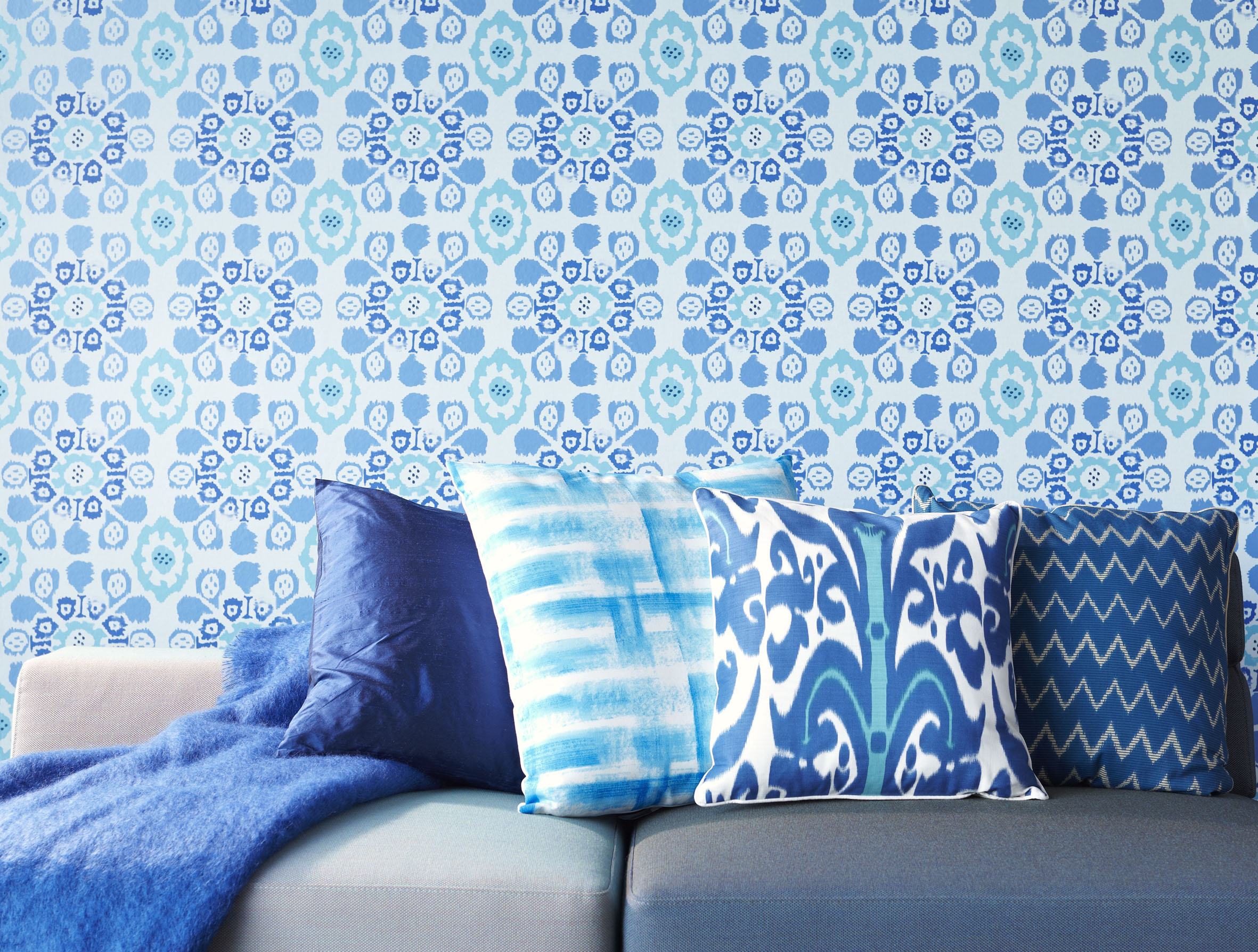 Med blå motiver som seilbåter og hustak, vil du kunne drømme deg bort til behagelige dager. Blått er en kald farge som gir distanse.