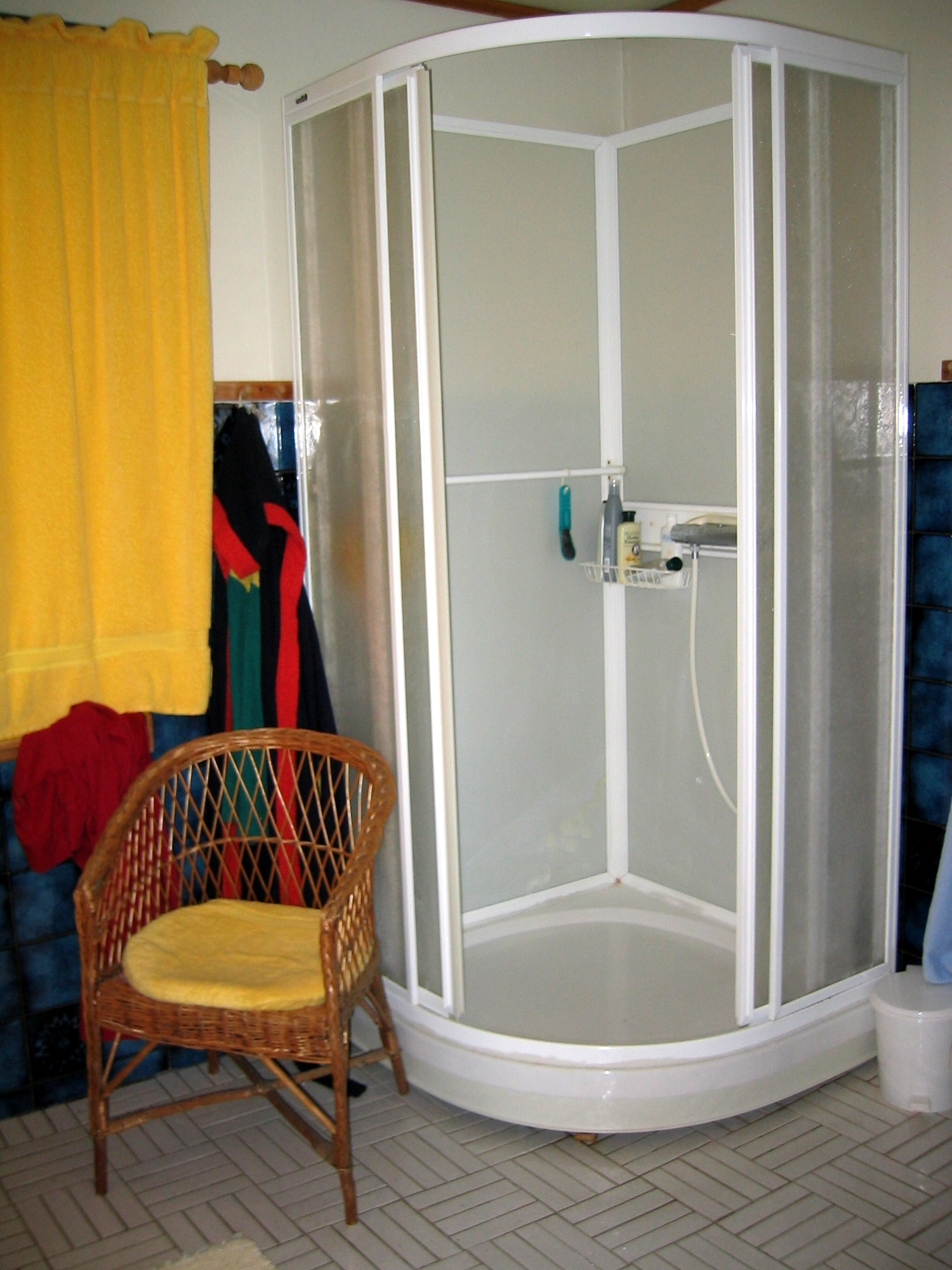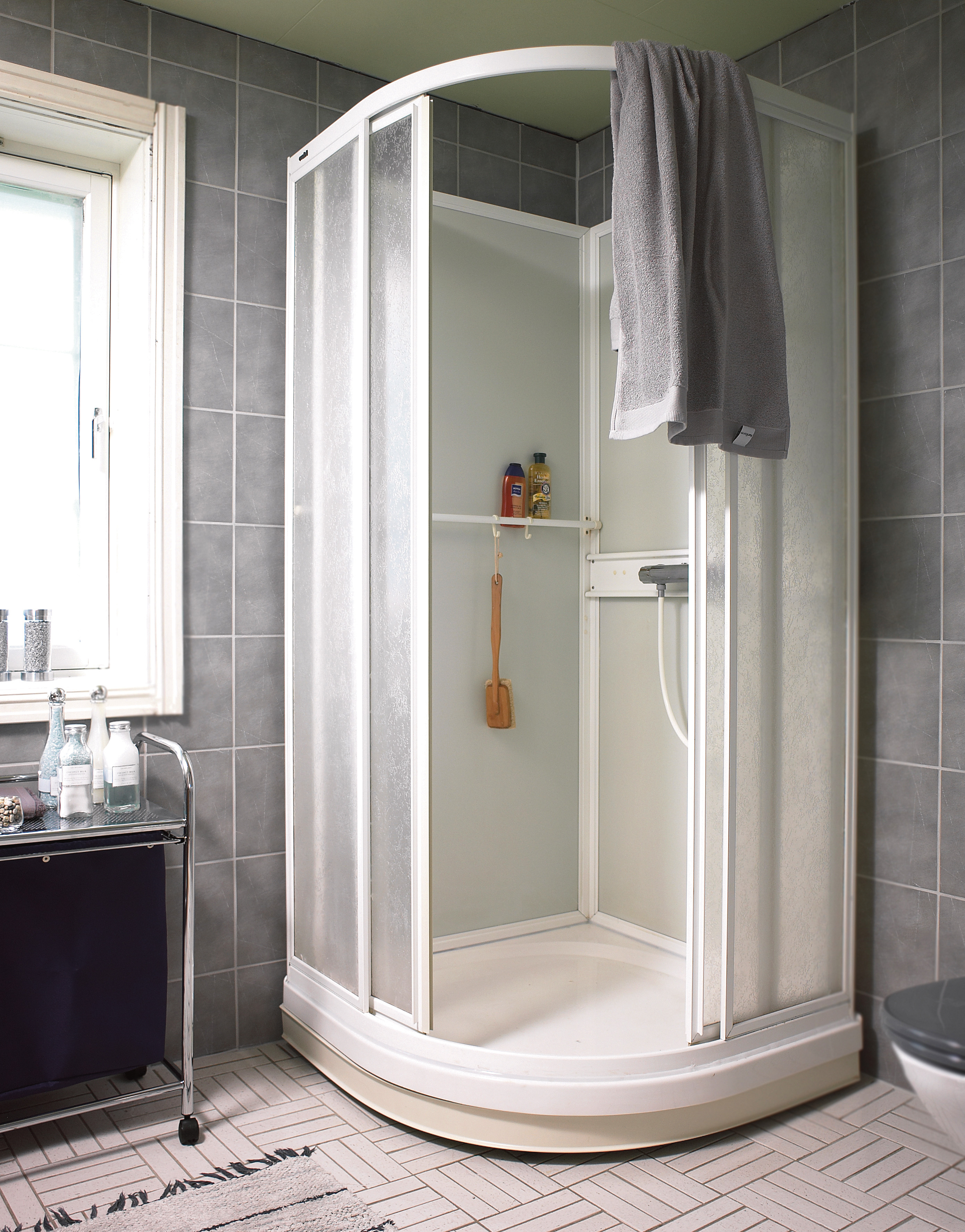 Gulvflisene og dusjkabinettet er beholdt. Kabinettet var nytt for noen år siden. Under gulvflisene ligger de opprinnelige varmekablene. De fungerer fortsatt utmerket. Elektrikeren sjekket bare at alt virket som det skulle, og skiftet kontrollpanelet. Til og med taklistene er de samme som før!