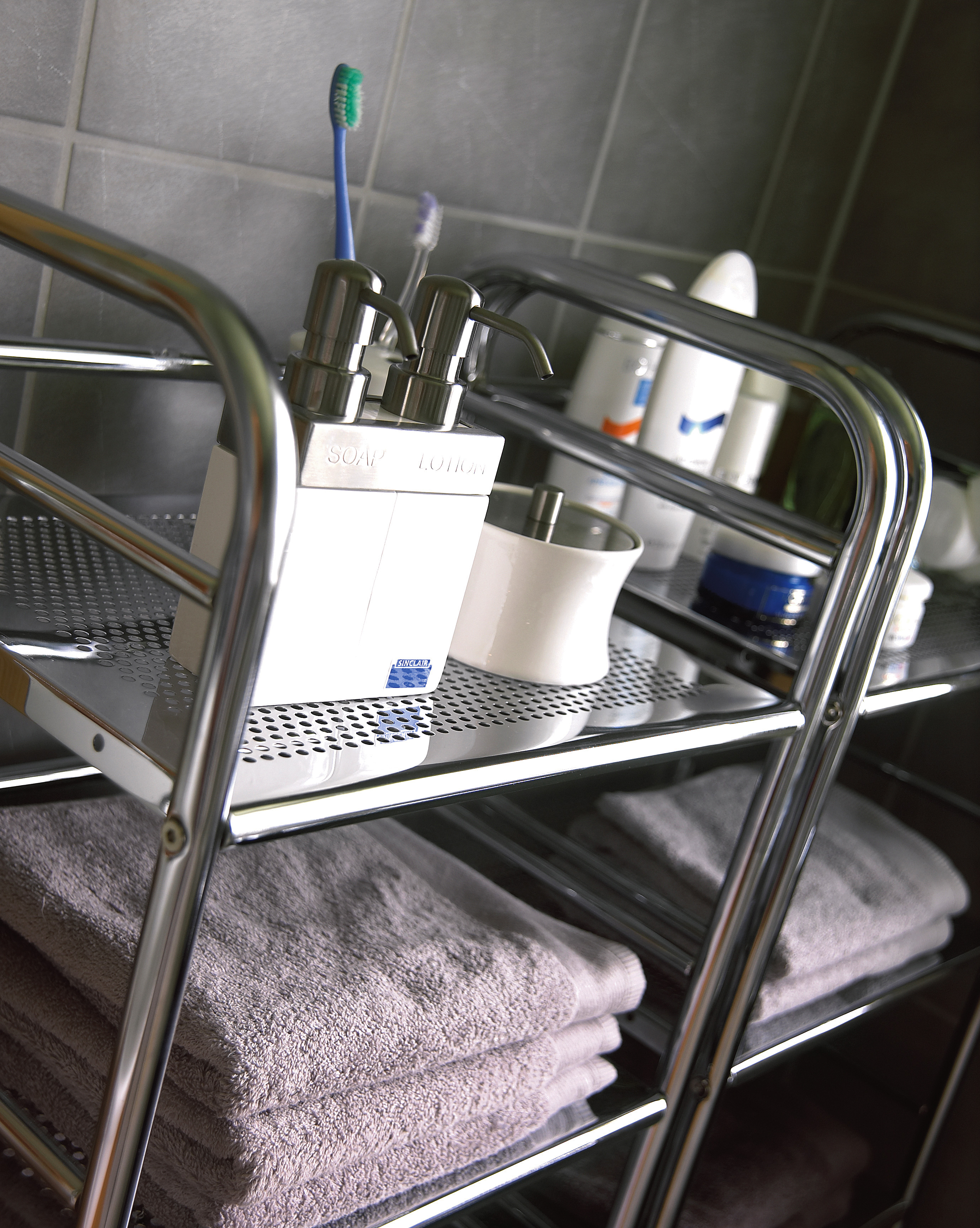 Enda en synlig forandring er at glasset foran det store baderomsvinduet nå er frostet - med folie. Tidligere måtte det alltid henge en gardin foran glasset, fordi det er innsyn direkte fra veien i boligfeltet. Den gamle dobbeltservanten med hel benk var god å ha den gangen mange skulle på badet samtidig. Nå gjør en enkel, topp moderne servant nytten. Det store speilet gir enda mer lys i rommet. Trillevognene, med trådskuffer for håndduker og andre ting, gir en luksusfølelse. Både på grunn av utseendet og fordi de sparer plass. Mottoet for hele ombyggingen har vært at rommet skulle bli rent og klassisk.