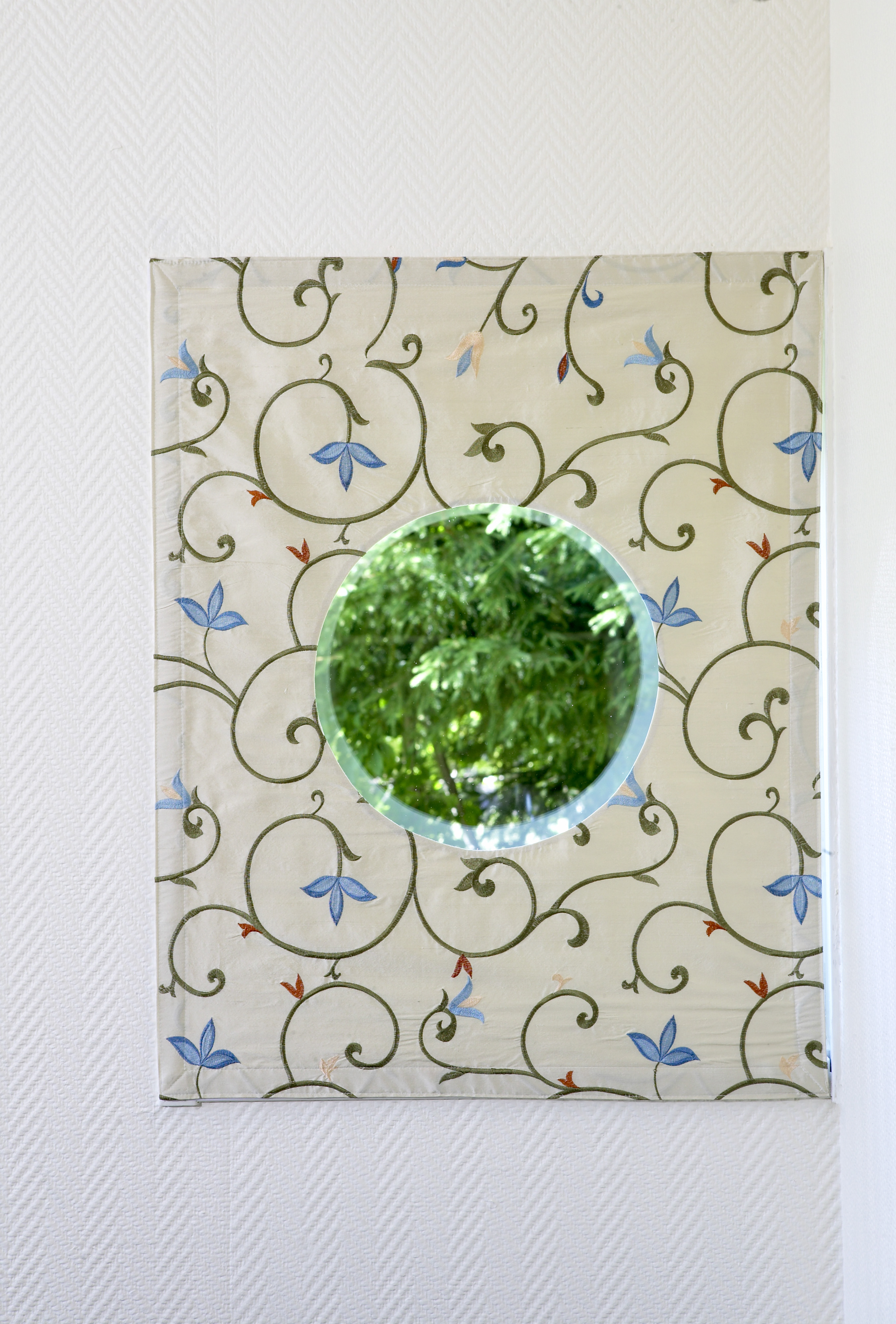 Ved hjelp av ett nesten heldekkende tekstil har interiørarkitekten forvandlet det lille vinduet til et dekorativt bilde. Med lysinnslipp! Et vakkert tekstil som matcher resten av interiøret ble sydd i samme størrelse som vindusomrammingen og festet med borrelås. Lysåpningen og den lyse bunnen i tekstilet sørger for at lyset likevel slippes inn.