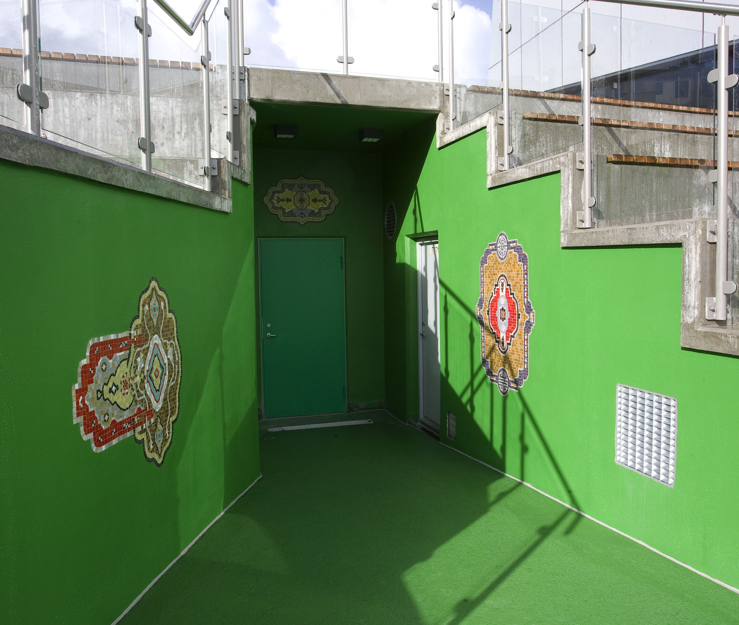 – Men hver inngang i amfiet skulle være noe spesielt – et løft, noe spennende – i det ellers grå amfimiljøet. Det behøvdes friske, eksotiske farger – farger glassmosaikken ikke har.