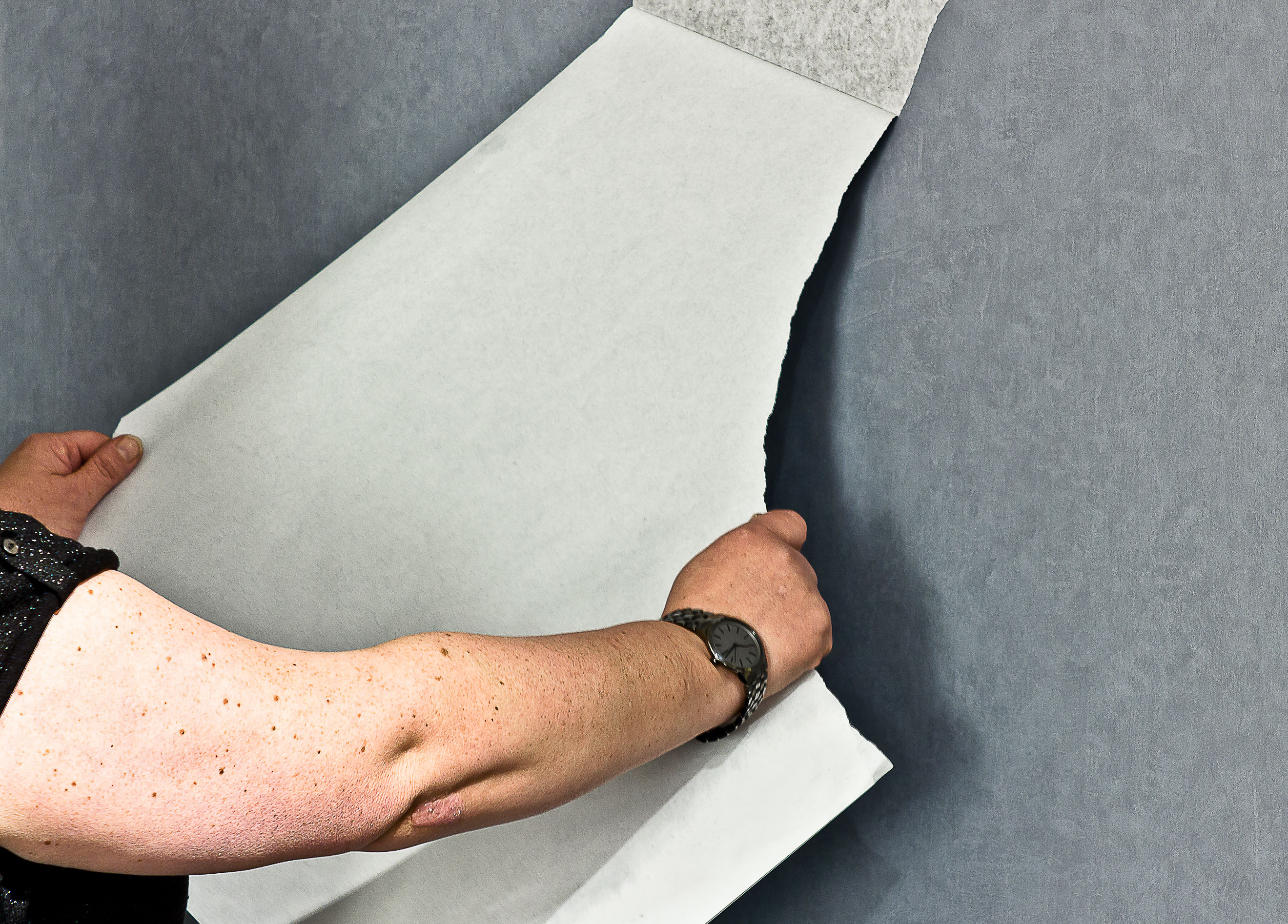 – Alle våre vinyltapeter er spaltbare, og det er bare å rive av det øverste sjiktet, sier Bergestuen.