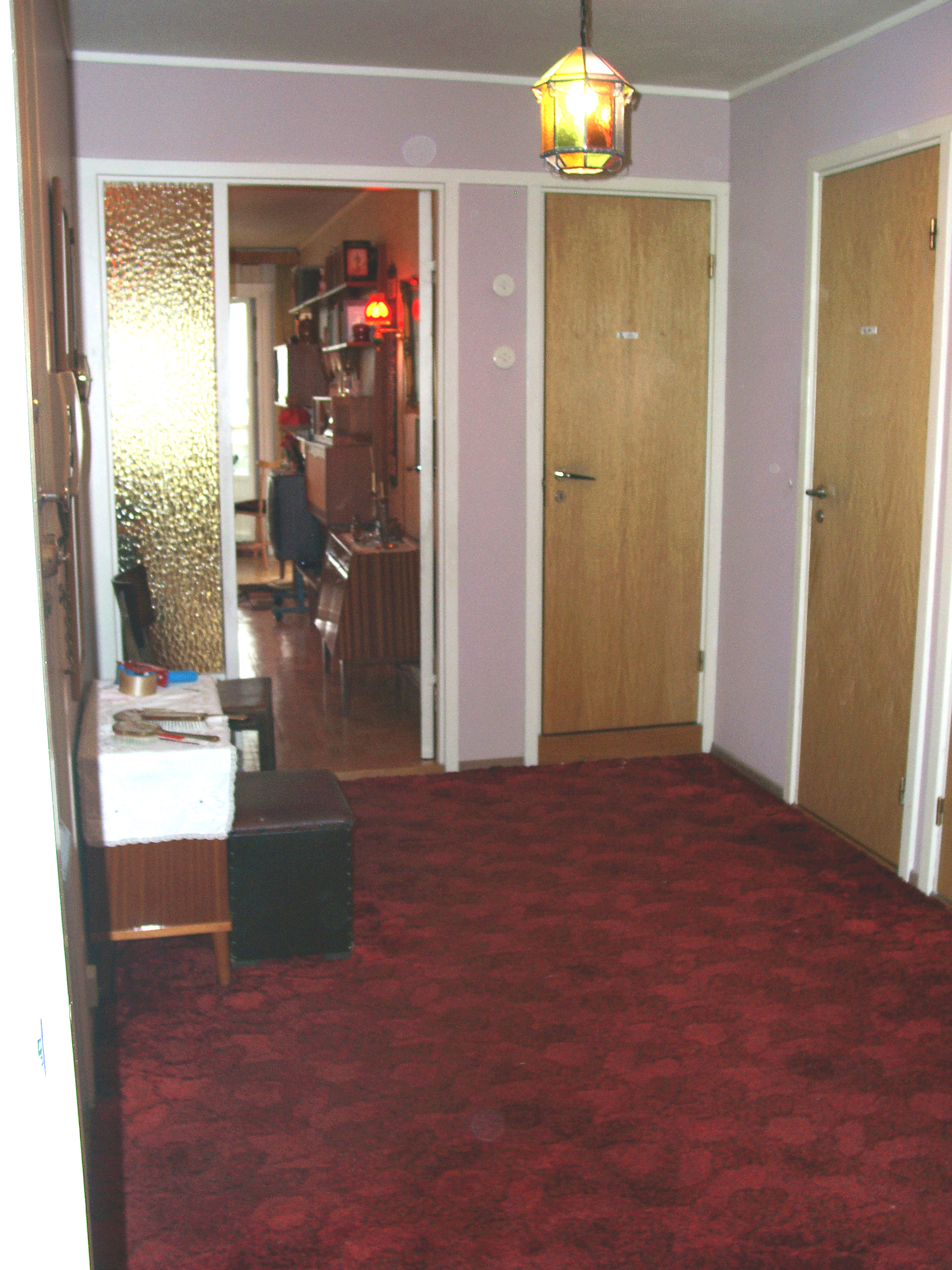 Løsningen lå i et nytt og fargerikt teppe som fikk spille hovedrollen i rommet. Veggene ble malt hvite og de syv dørene fikk hver sin farge, valgt etter rutene i teppet. Det ble montert lyslister i taket med spot over hver dør. Spotene gir rommet godt lys, markerer dørene og bidrar til å understreke fargespillet.