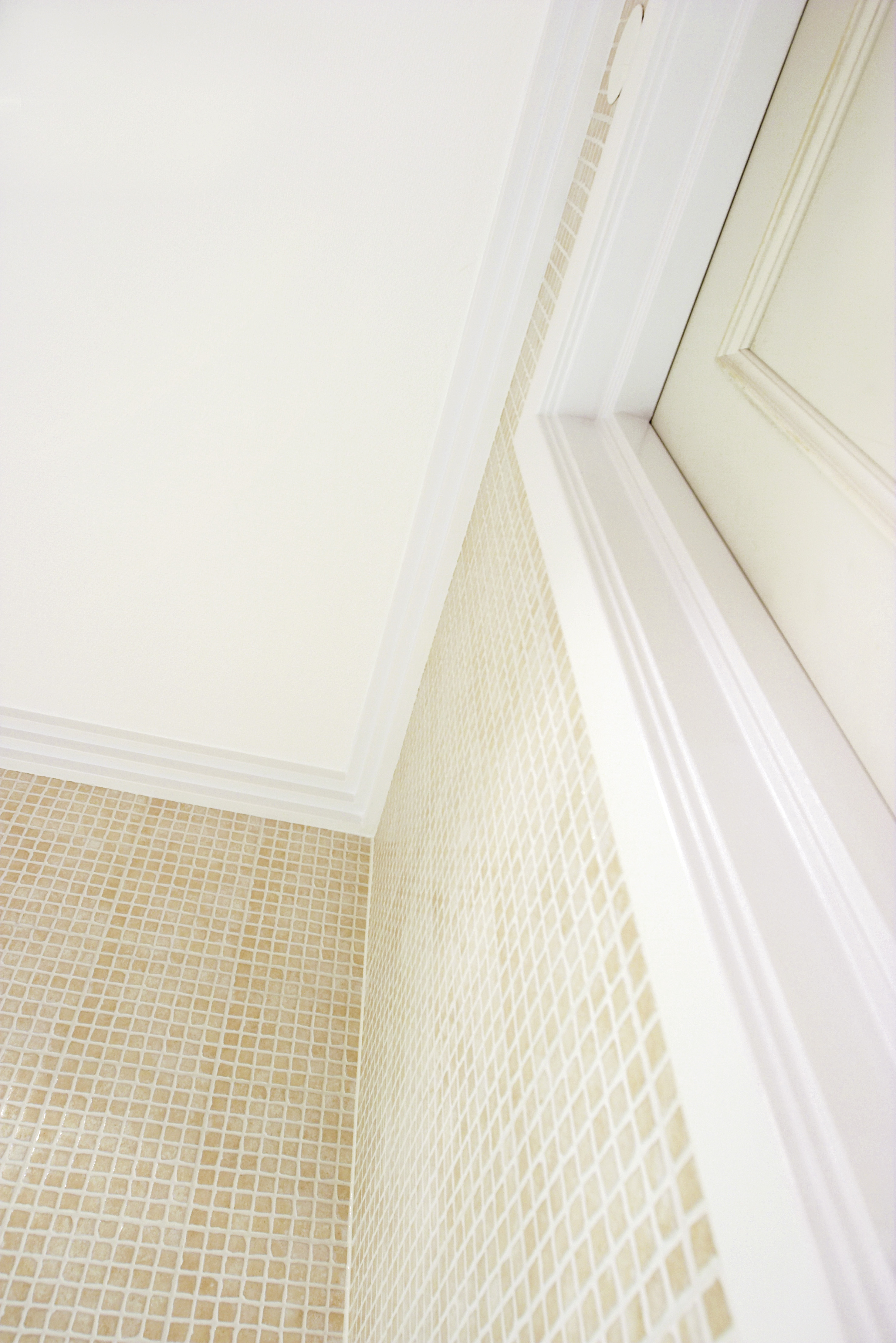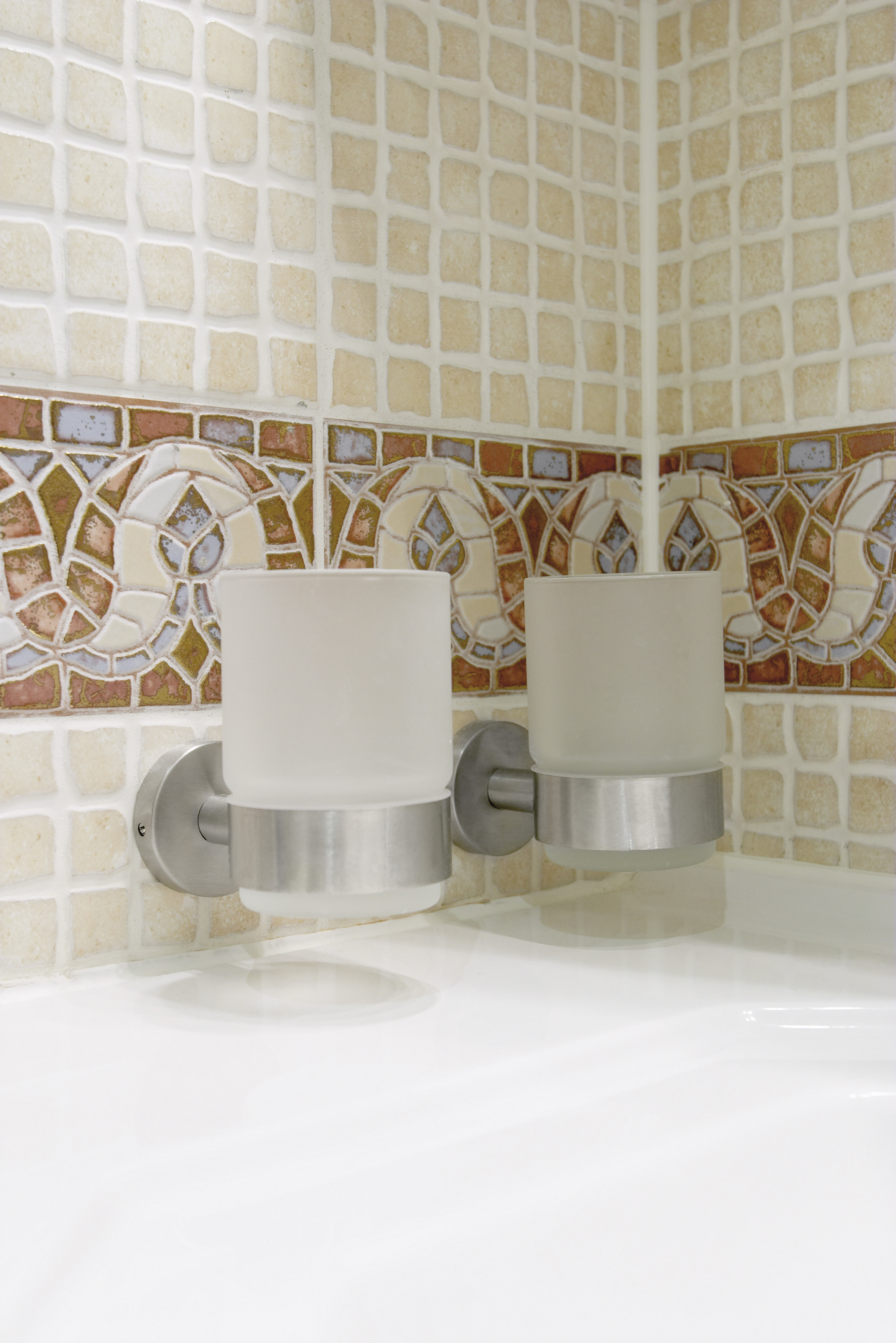 Rolf røsket ut de mørke platene på veggene og erstattet dem med beige, små fliser, nærmest mosaikkfliser. - Jeg syntes det var så fint at de var litt uregelmessige, sier han. For å stramme opp inntrykket litt og også gjøre veggen litt mer "levende" kostet han på seg en flisebord - og et matchende bilde i fliser midt på den ene veggen. Også på gulvet ble det lagt nye fliser.