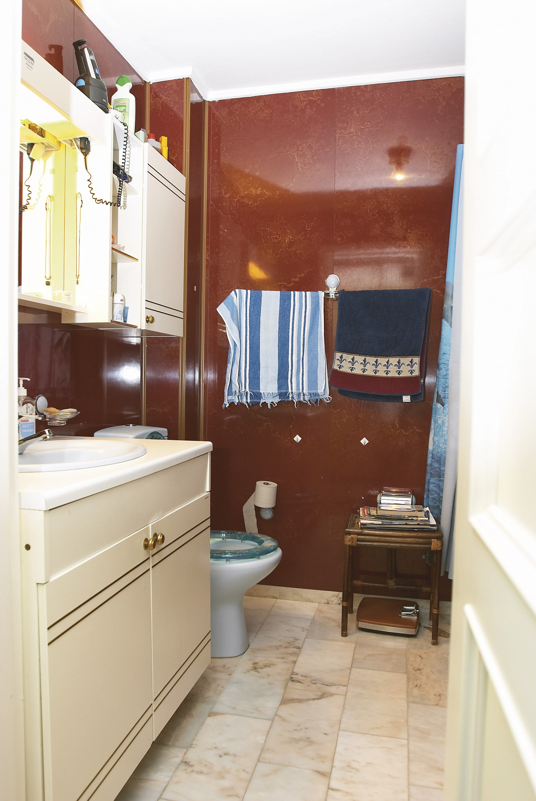 Det var ikke fritt for at det nyanskaffede badekaret ruvet litt i det trange badeværelset. Rolf valgte derfor en mindre servant og en ny, nettere type baderomsinnredning. Speildører foran baderomshyllene og innebygget lys i glasskapene er plassbesparende samtidig som det gir et lettere, luftigere inntrykk.