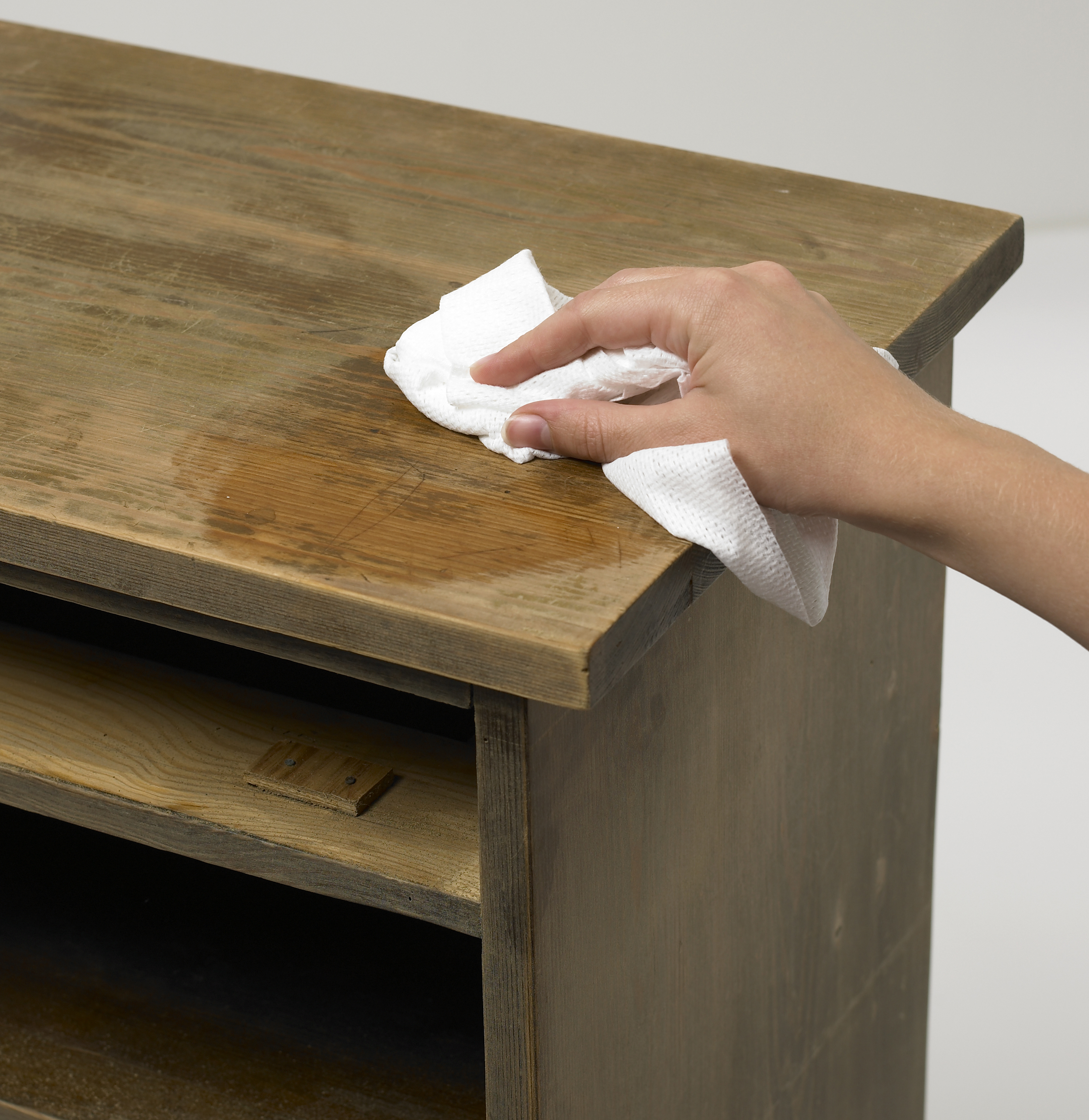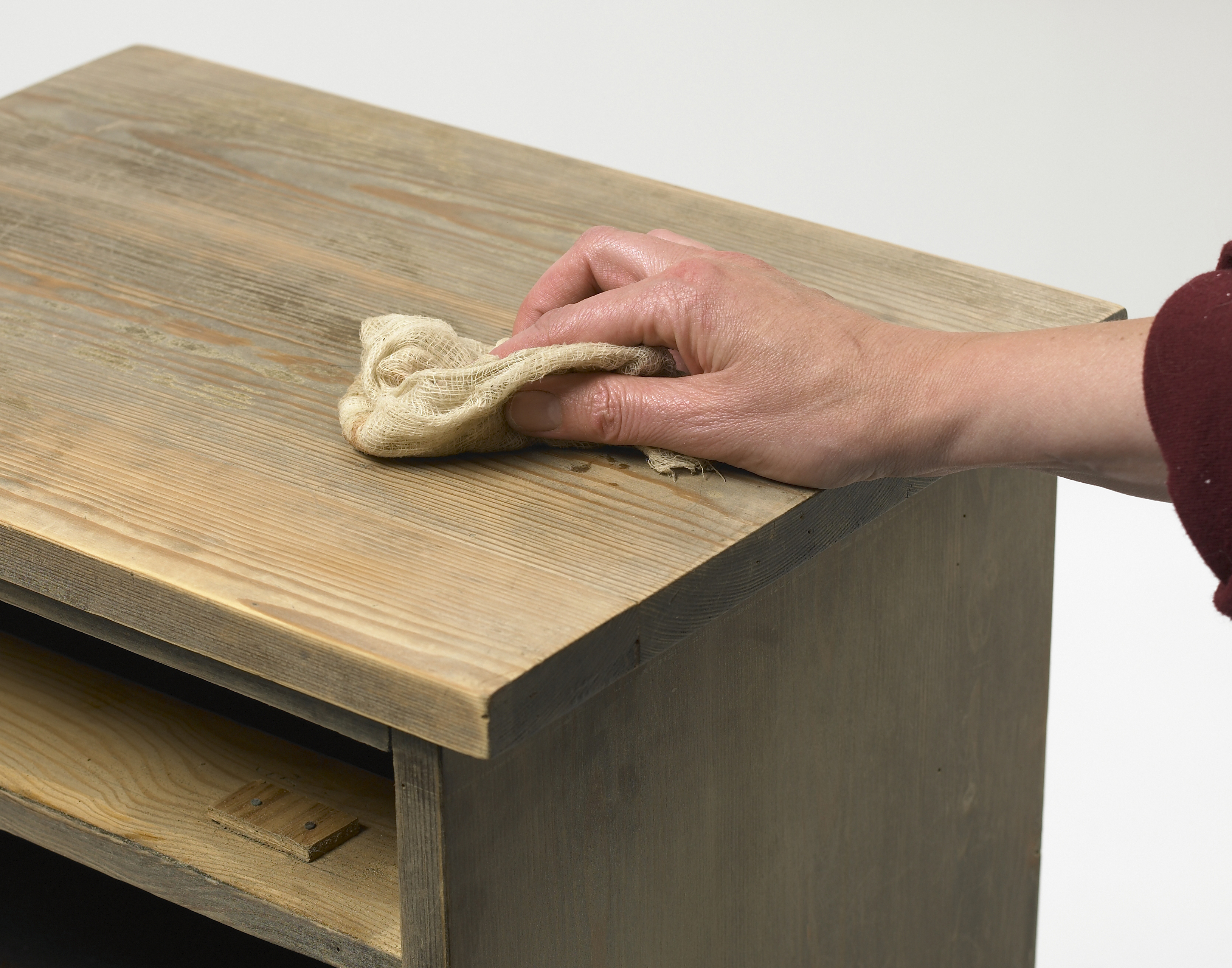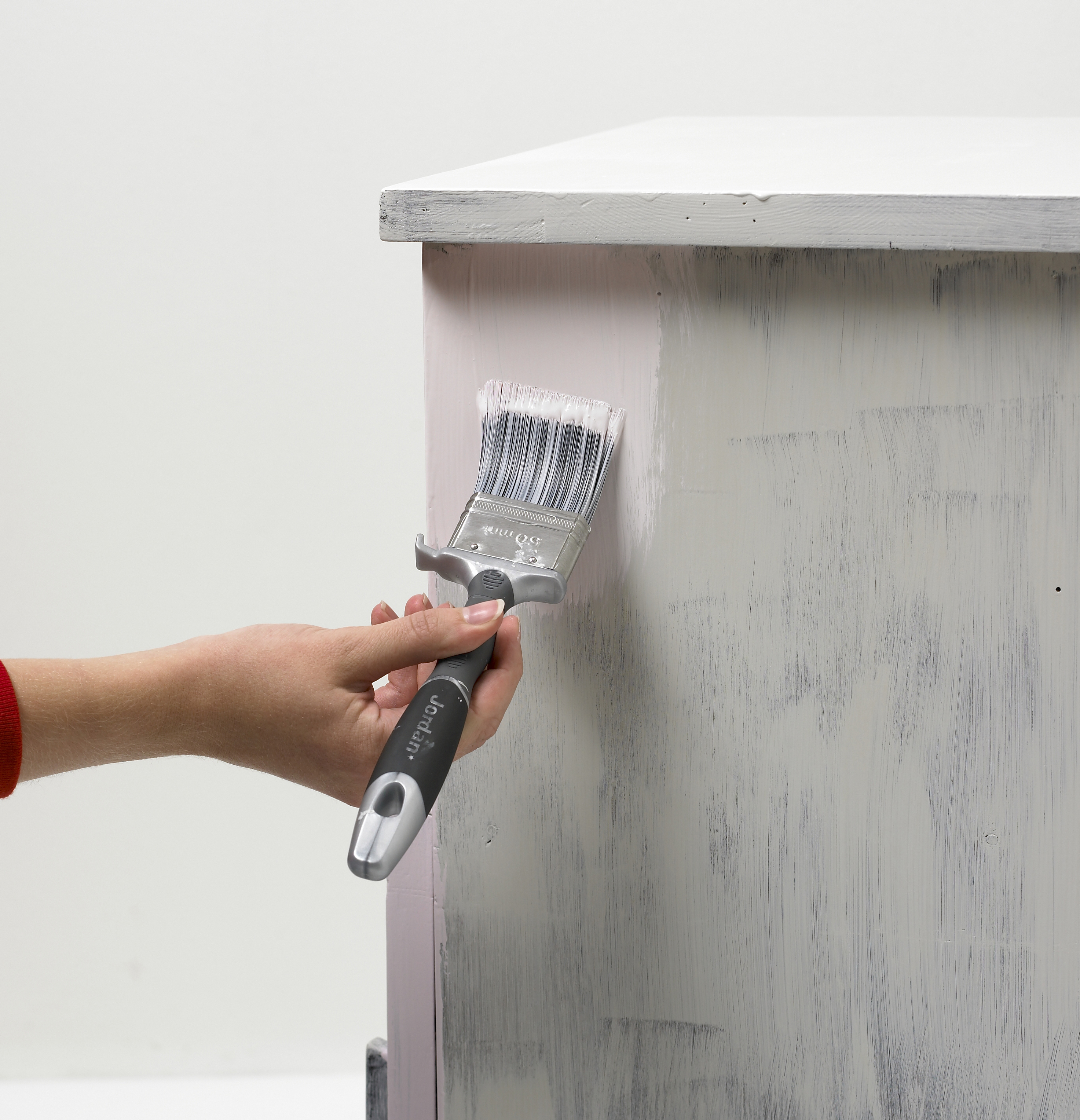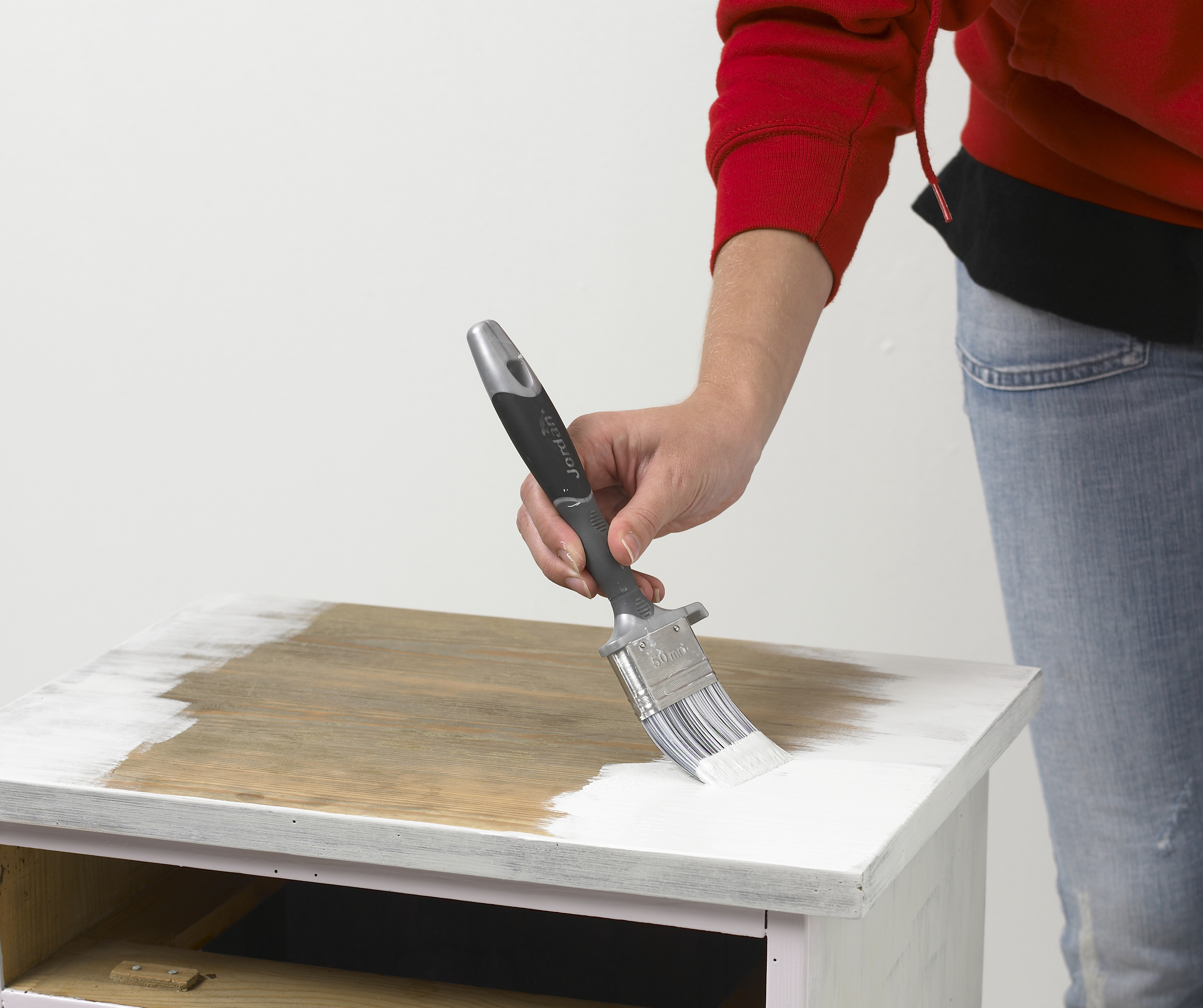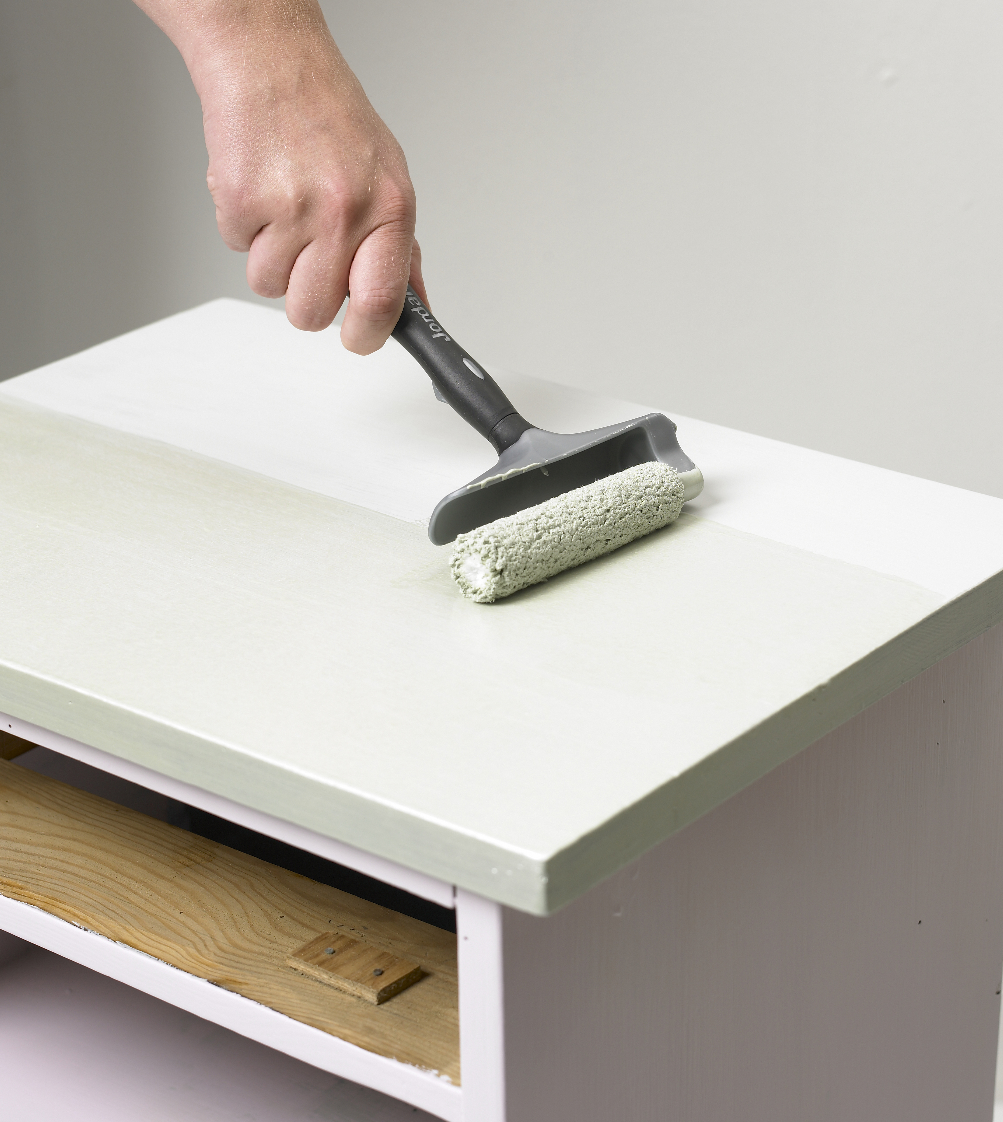 I vårt tilfelle var overflaten jevn og fin, men hvis møbelet har mye hakk og skader, kan det være lurt å gå over med litt sparkel før man maler. Husk å benytte en sparkelmasse beregnet for treverk. Etter at sparkelen er påført, puss ned, og avstøv overflaten. Det bør også grunnes over flekken.