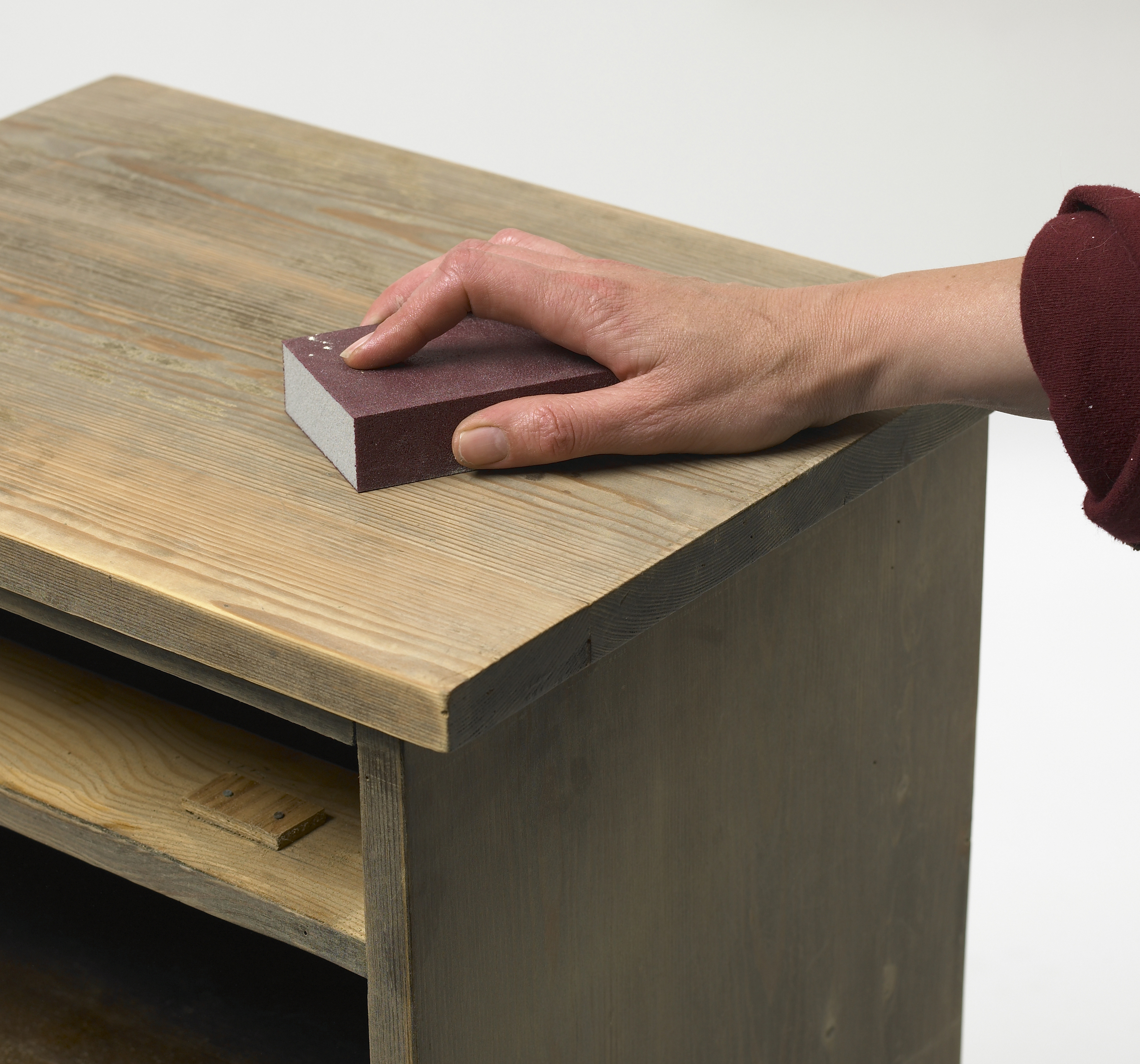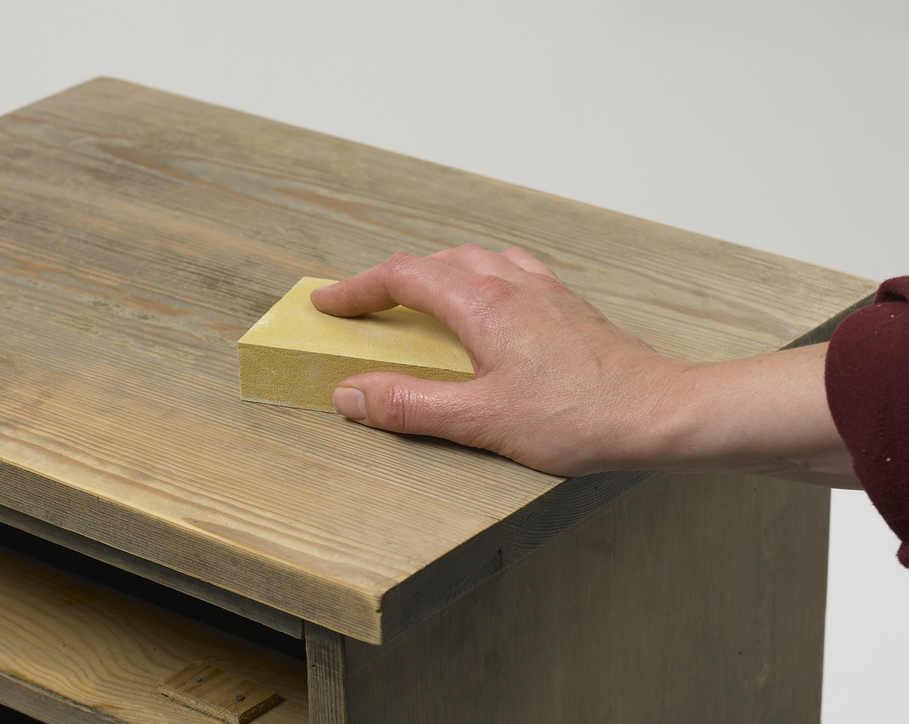 Puss ned overflaten i treverkets lengderetning. På den måten får man en pen overflate, og god heft til videre behandling. For å få et best mulig resultat begynte vi med 150 korning, og avsluttet med 180.