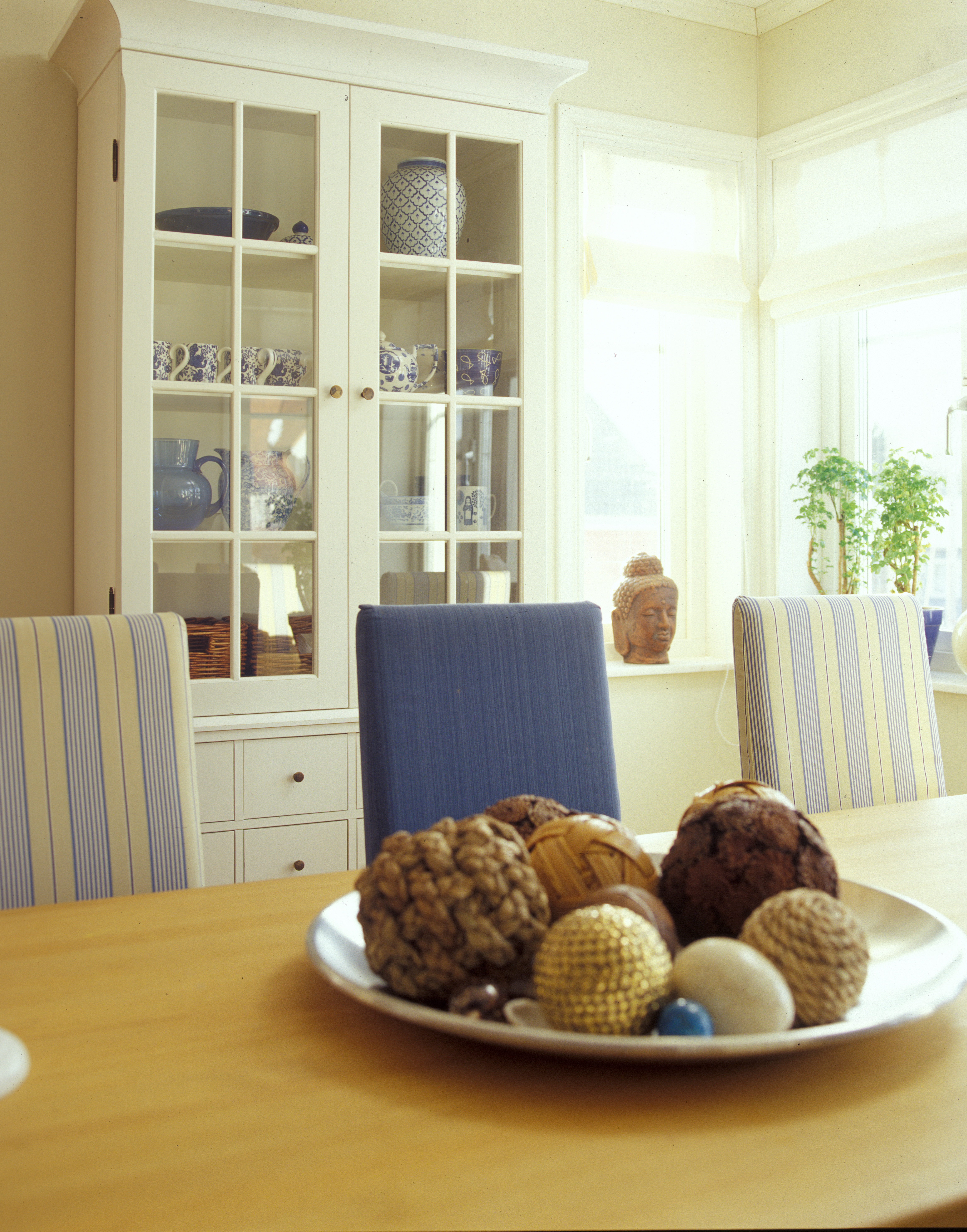 Et helt hus: Med blått i flere rom Før/etter - hytter og hjem Camilla DelbekkPublisert 14.04.2002 Hent ideer fra et helt hus. Her har vi fargesatt og innredet et typisk ferdighus. Dessuten er flere av rommene innredet på to måter. Her finner du sikkert noen spreke tips. La deg inspirere! Innhold Følg Dele Innhold Følj Følg ifi.no på Facebook, TikTok og Instagram.Registrer deg her og motta vårt nyhetsbrev, med nye artikler og nyttige tips 2-3 ganger i måneden. Motta nyhetsbrev Dele Send til epost Cancel Send Annonse Stikkord for fargesetting av hele huset: Glad i blått. Maksimalt tre farger i ett rom. Farger fra samme fargekart. Samme hovedfarge i flere rom. Kvalitet i materialvalg og møbler. ©ifi 2002 Relaterte emner Før/etter - hytter og hjem Annonse Dett har vi brukt: Se fasit for blått barnerom her. Se fasit for grønt barneom her. Utvendig: Vegg: Butinox dekkbeis, HerregårdshvitLister: HelhviteGrunning: Butinox oljegrunningAlt fra SCANOX EntréGulv: Marley Wood MPC 3002 (mørk) og Marley Marble MPC - 37, StoreysVegg (blå): Butinox 07, farge 3957-R75B tilsatt HT 20 og RI 6, ScanoxVegg (tapet): Sanderson Clementine WR 8247-1, BORGE (grunnet med Butinox N-4195 Røksopp)Disk: Butinox N-5502-Krem, ScanoxStol: Wo m/Sari rosa stoff, Slettvold Spisetue:Vegg: Butinox 07, N-4195 Røksopp, Scanox Peisestue:Teppe (blått): Trend Sisal blå, Storeys Kjøkken:Blå flis: Caleidos 431726, Höganäs Bardisk/komfyrmøbel: Butinox 07, farge 3957-R75B tilsatt HT 20 og RI 6, ScanoxVegg: Butinox 07, N-4195 Røksopp, ScanoxInnredning: Funksjon (farge Butinox 5502 Krem), Sivesind InteriørKjøleskap: Amana, Inventum Bad: Veggflis: Caleidos 431658, HöganäsGulvflis: Sydney grå-hvit 9000408, Höganäs Panel: Butinox N-5502 Krem (oljebasert), ScanoxHåndklær: Ibiza og Sardinia, Nordisk Fjer Badematte, dusjforheng, kluter: Ibiza, Nordisk FjerGardin: Darcy PR 8256-6, BorgeTak: Panellakk hvit (2 strøk) og 3-Stjernes oljebasert lakk (ett strøk), ScanoxInnredning: Funksjon, Sivesind InteriørServant: AtlanticBlandebatteri: TaraBegge fra Gustavsberg Soverom: Vegg: Medina WR 8414-10, Borge (grunnet med Butinox N-5501 Latte, Scanox)Gardin: Pasa 14456 (foret), BorgeSengetøy: Square blå, Nordisk FjerEkstra putevar: Turiform, Nordisk FjerSengehimmel: Ikea Vær klar over at fargene på skjermen avviker fra originalene.Enkelte produkter kan være utgått.Produkter som ikke er listet opp i fasit er privat eie. Les også: Legg til huskeliste Se huskelisten din Hei, denne artikkelen er over 2 år gammel, og kan inneholde utdatert informasjon. Finn de siste artiklene om dette emnet. Vi anbefaler Parkett, laminat og klikkvinyl – tre lune gulv å velge mellom Sweet Embrace er Årets farge 2024 fra Nordsjö Nye taklister i rekordfart Hvordan matche et tapet? Mer fra Før/etter - hytter og hjem Vinylfliser i entré Annonse Siste artikler Dette er fargen folket ønsker i 2026 Sjokolade, urter og smørtoner på kjøkkenet Mal panelet etter forholdene, ikke kalenderen Varme farger og myke former: Trendene fra Paris 2026