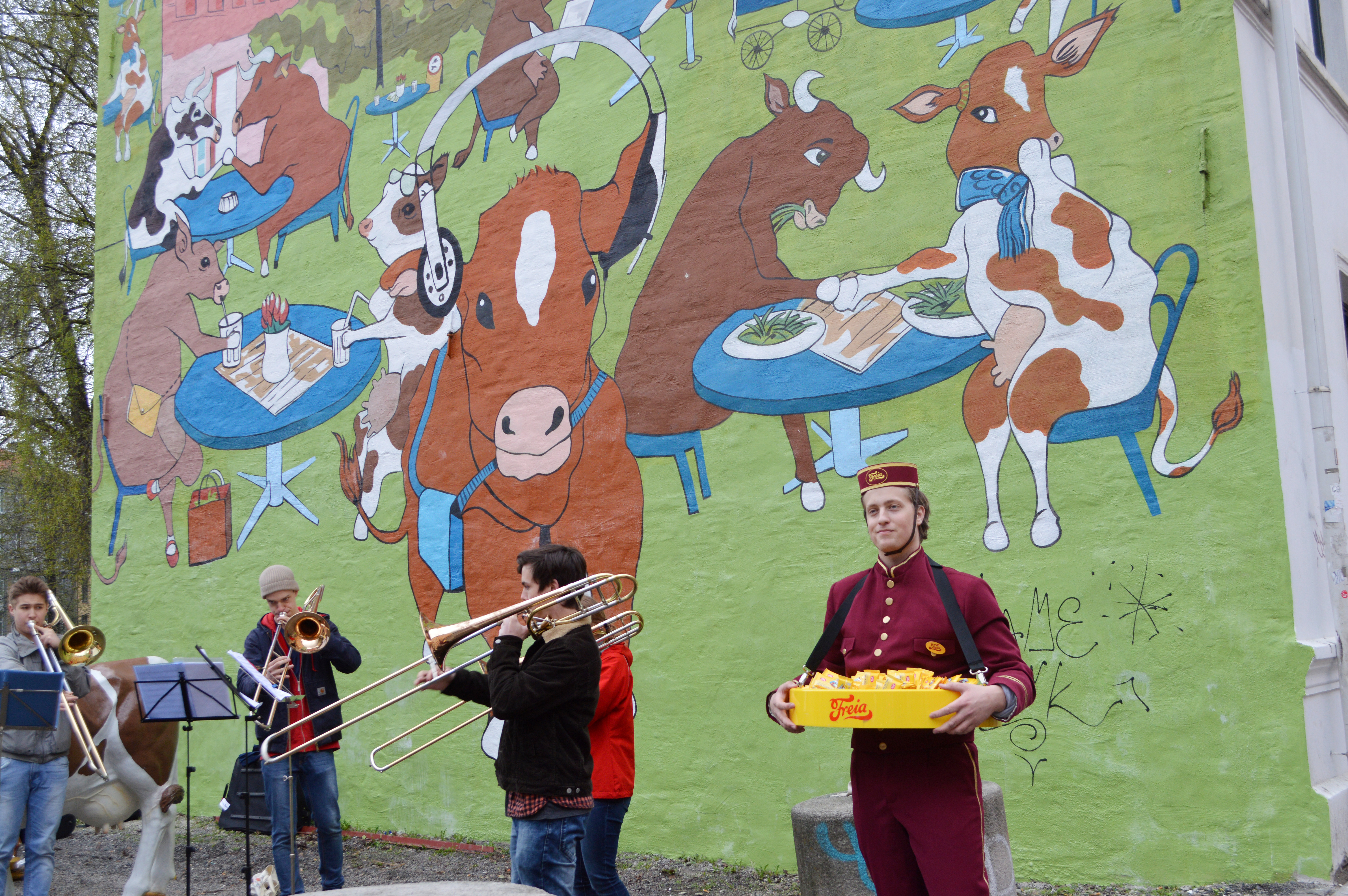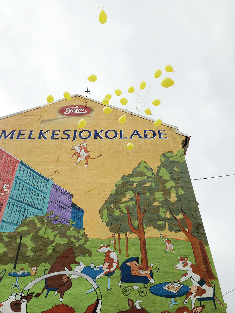 Første gang Freia fikk malt denne veggen var i 2005. Det begynte med at de utlyste en tegnekonkurranse. Freia inngår i Mondelez Internationals portefølje. Den gang het selskapet Kraft Foods, og de inngikk da et samarbeid med Kunsthøgskolen i Oslo. Studenter fra to klasser ble invitert til å levere forslag til ny Freia-vegg.