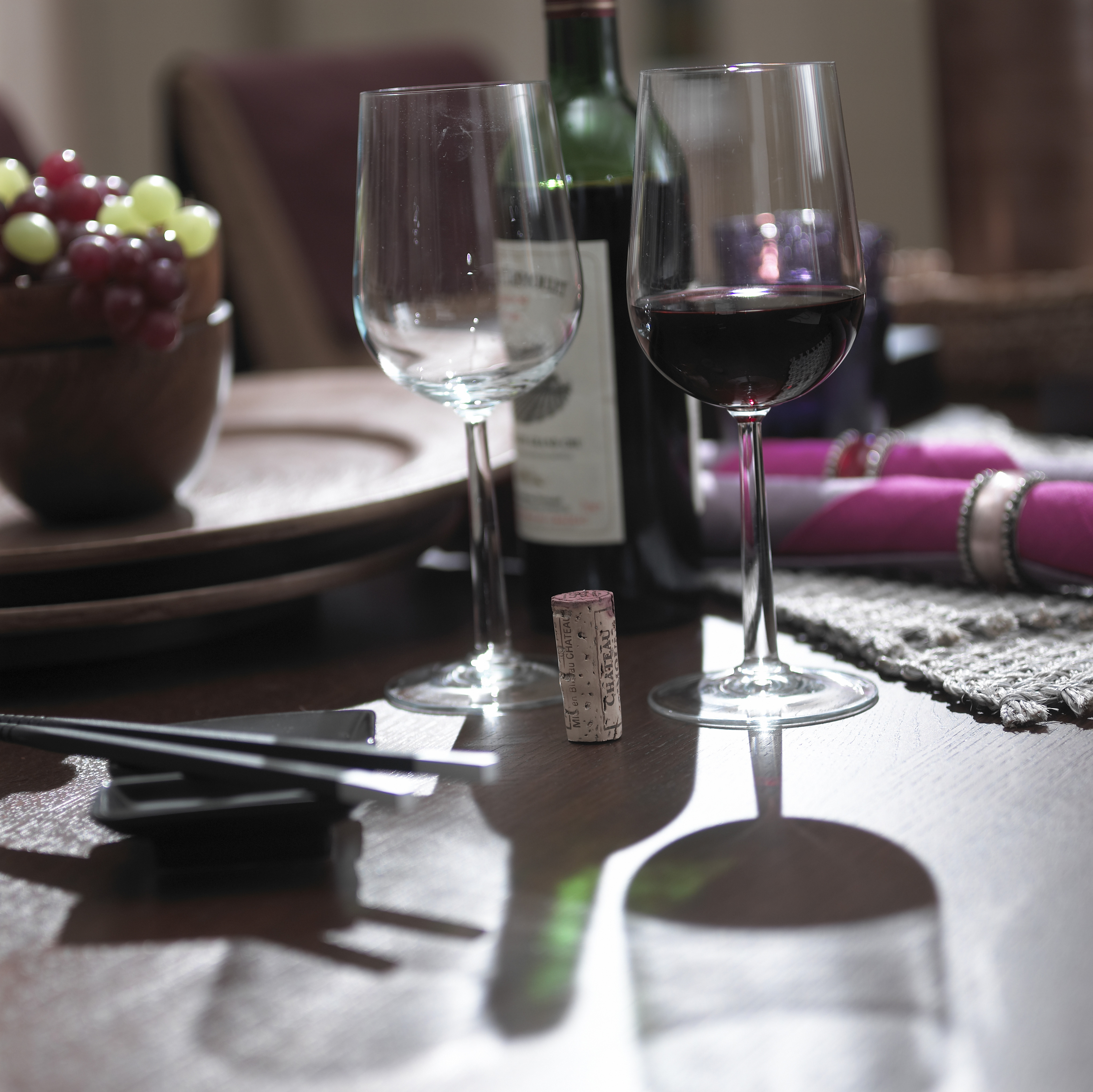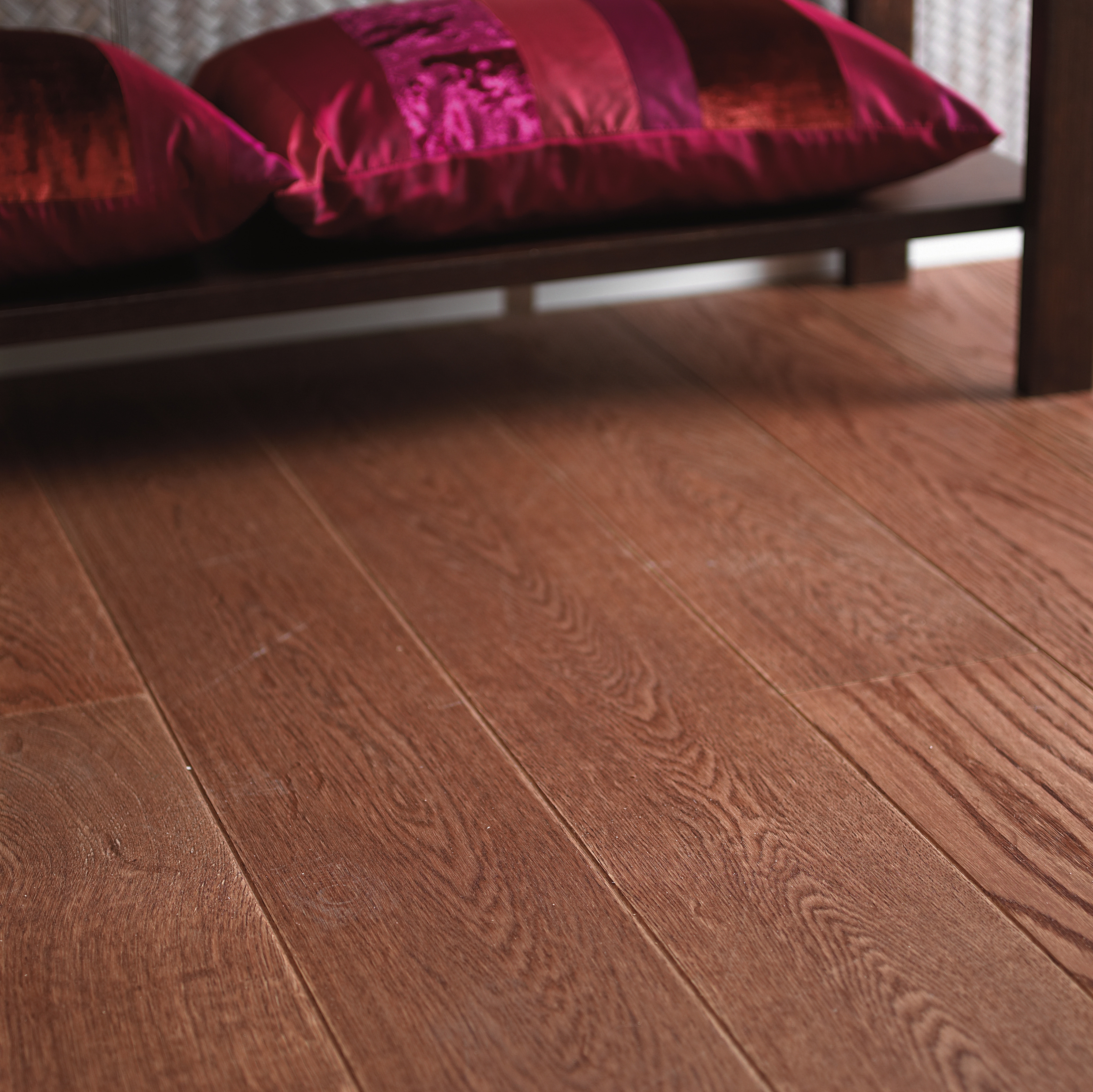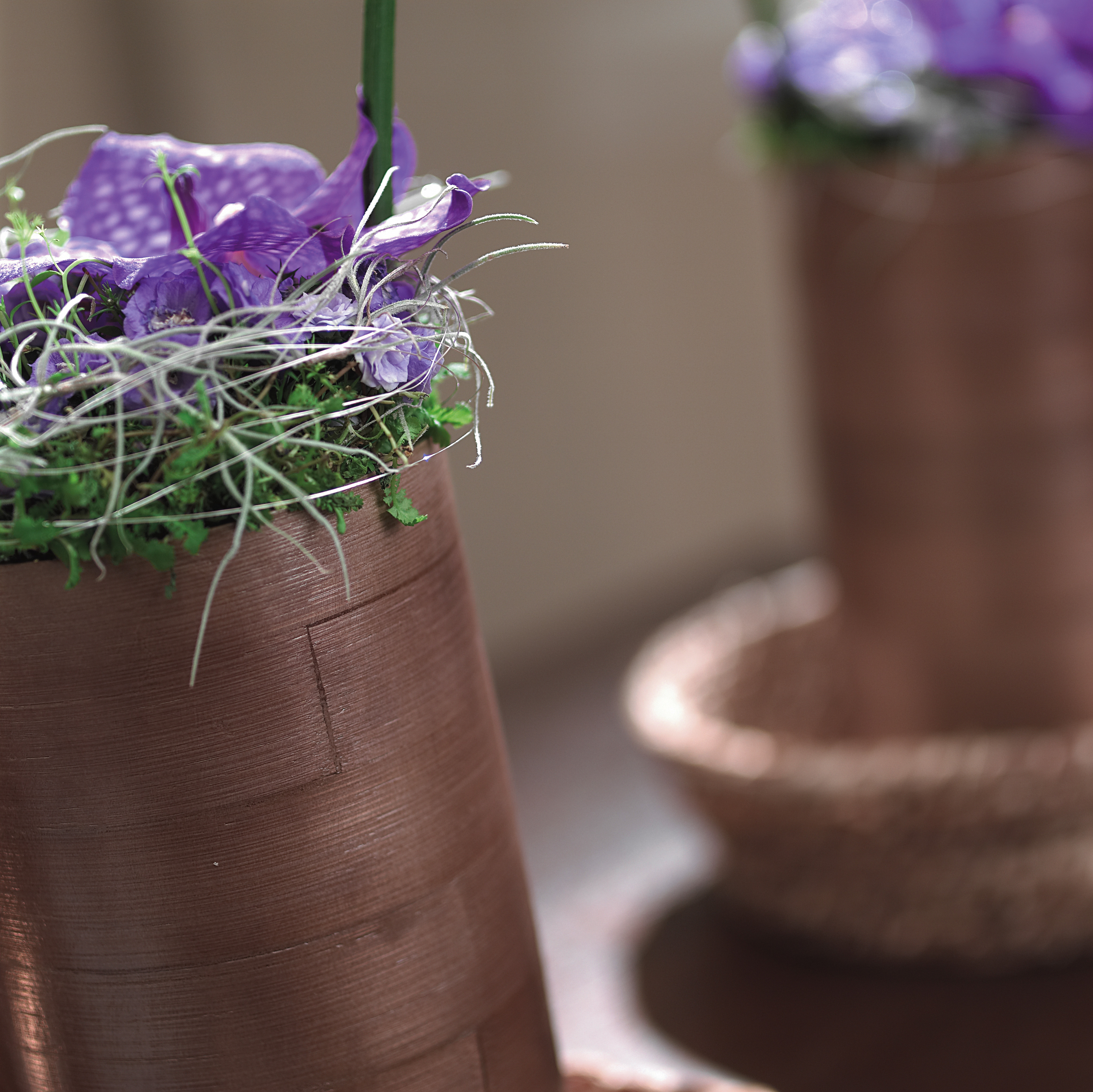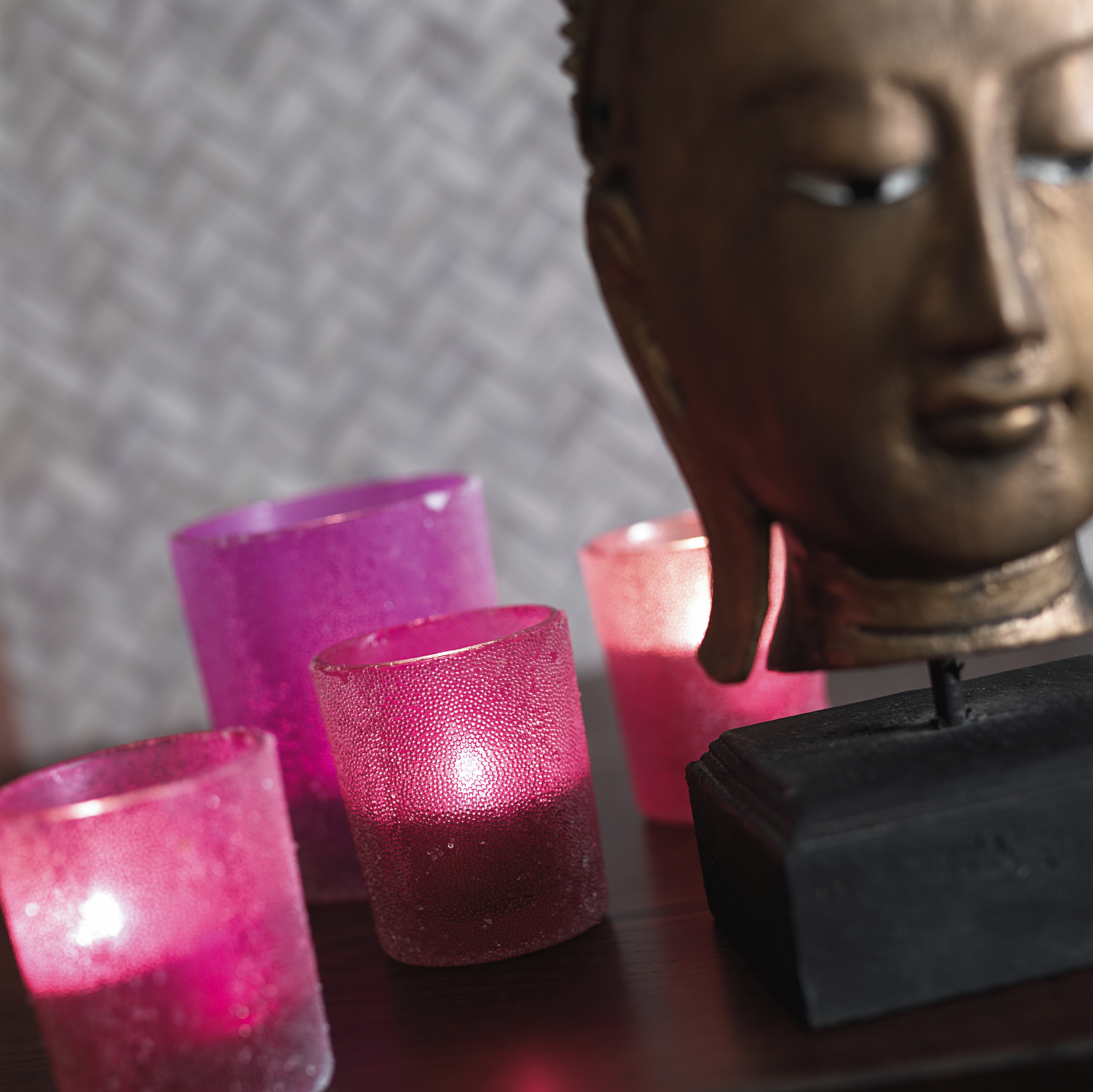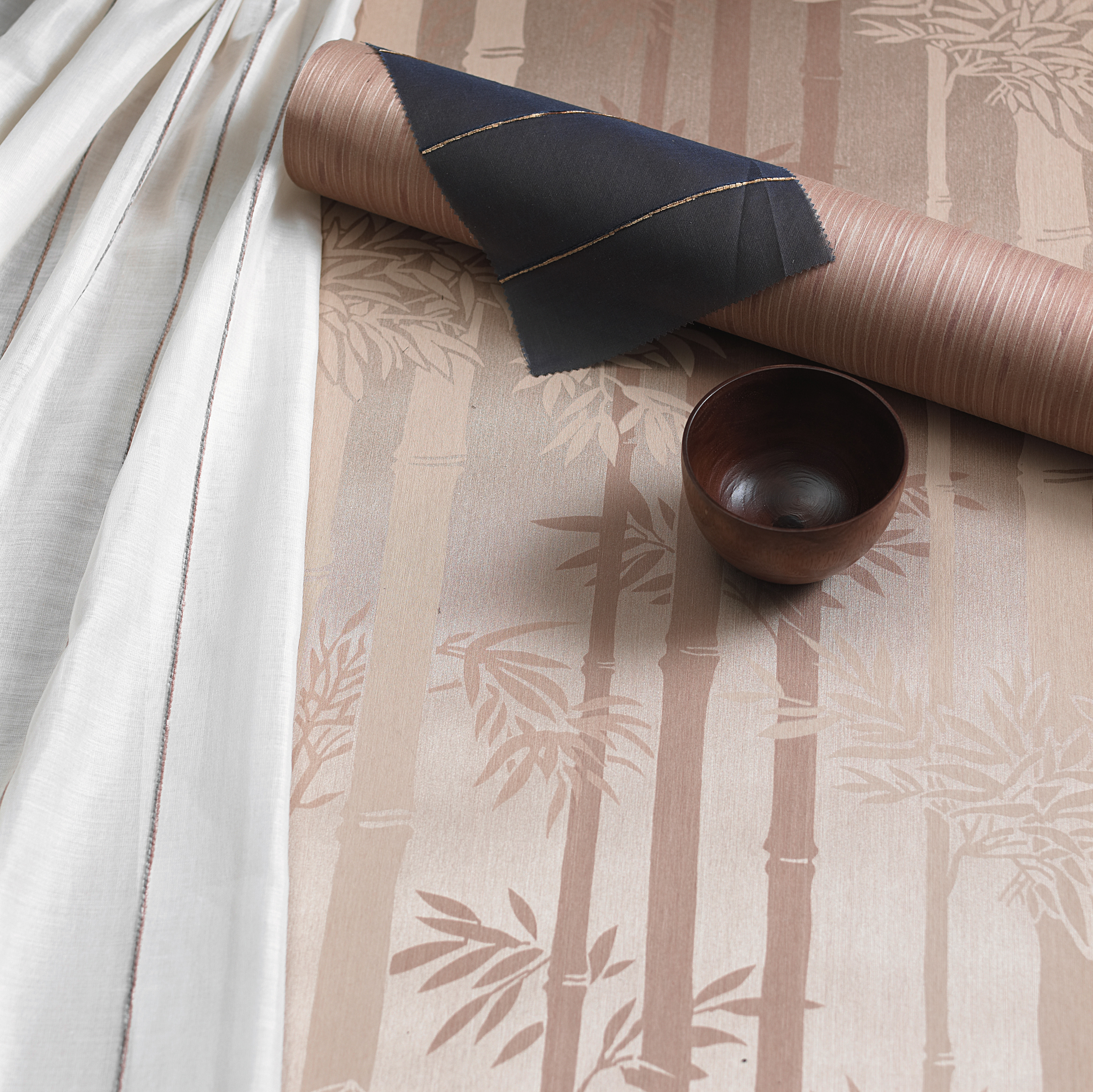 En lys vegg gir dybde og gjør at rommet virker større. Stilen er enkel med rette linjer, inspirert av det asiatiske: Varmt og mørkt treverk, stramme gardiner og bambus. Det er liten kontrast i fargene, men mye struktur og tekstur. Buddha-byste og orkidéer hører til.