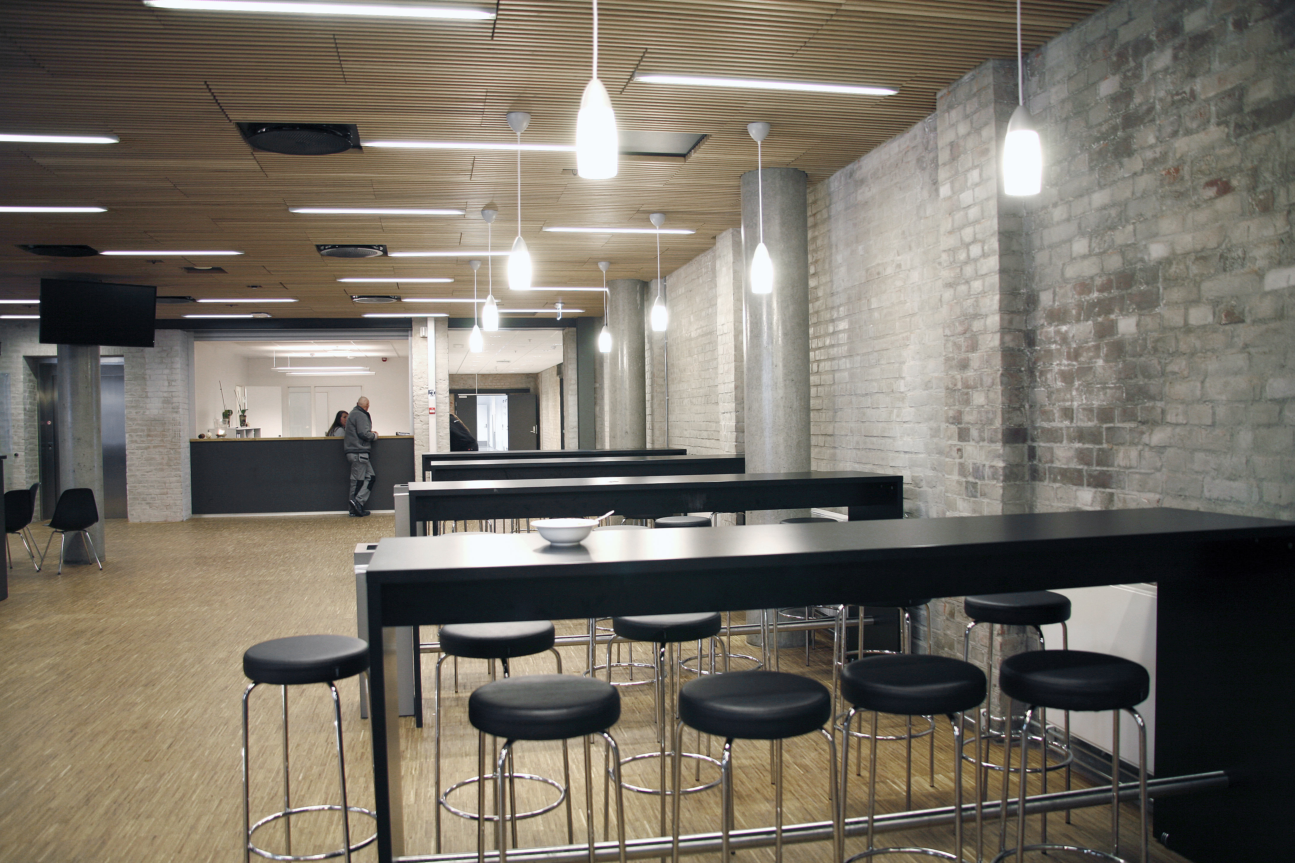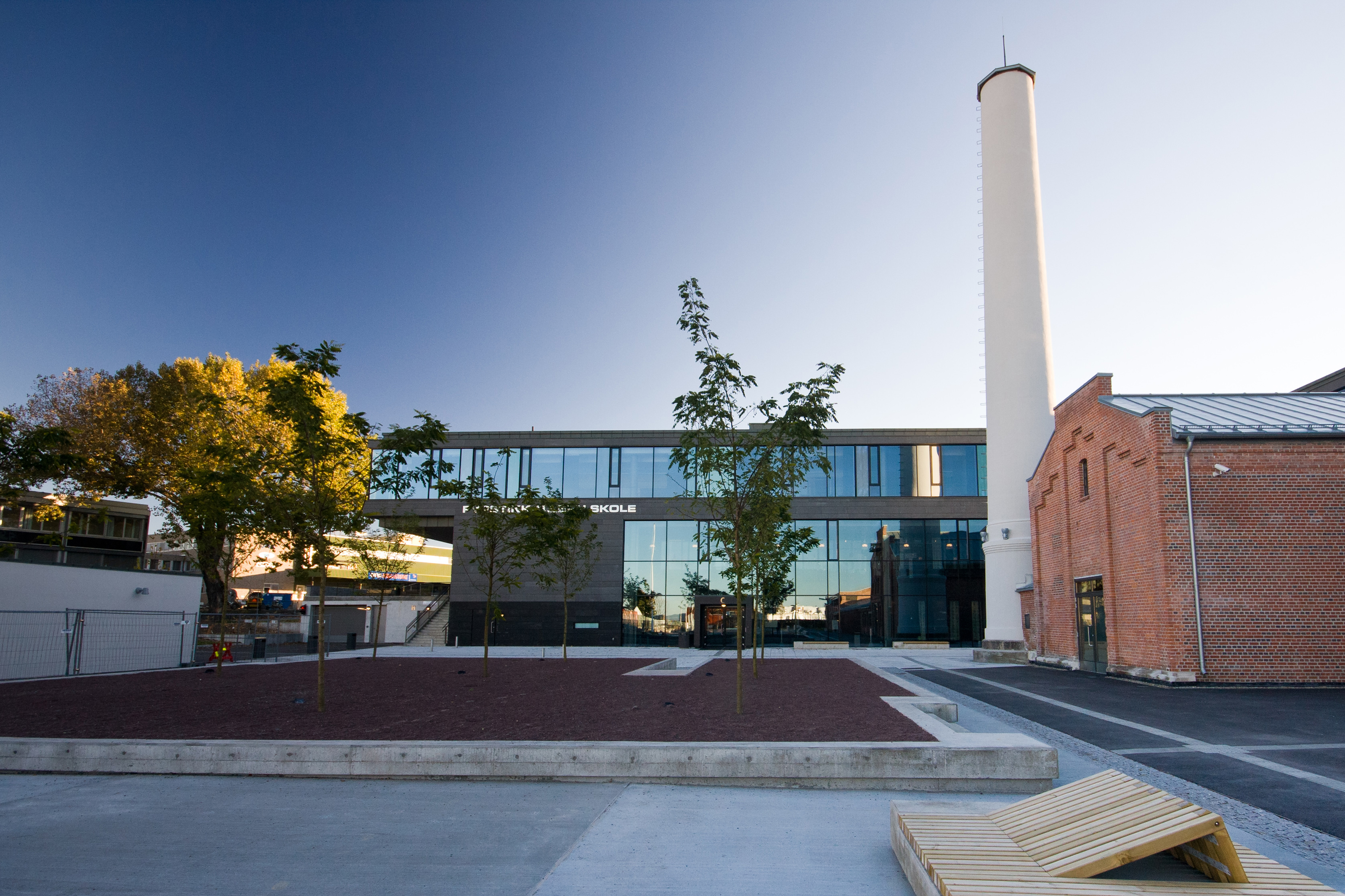 - Et av grepene for å få anlegget til å fremstå som helhetlig var å velge få, holdbare og naturlige materialer som tegl, betong, stein, tre, lakkert stål og gjennomfarget MDF. Fargebruken er dempet, med en palett i sort, grått og hvitt, med innslag av noen grønnfarger. Det er tenkt at inventar, elever og lærere gir farge til huset. Skolen skal stå i mange år, og vi håper at den vil overleve mange tiders trender, sier Lise Larstuvold.