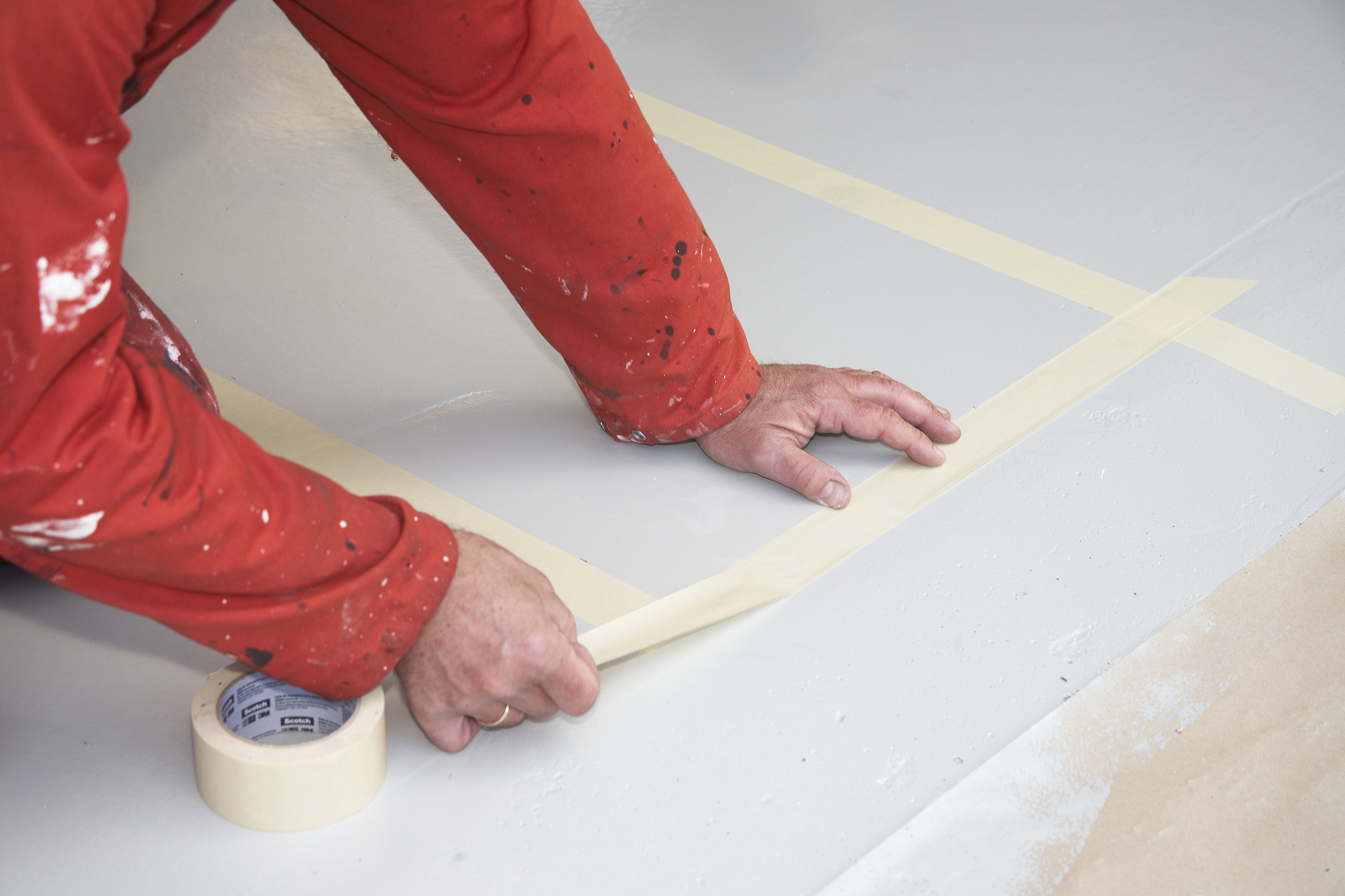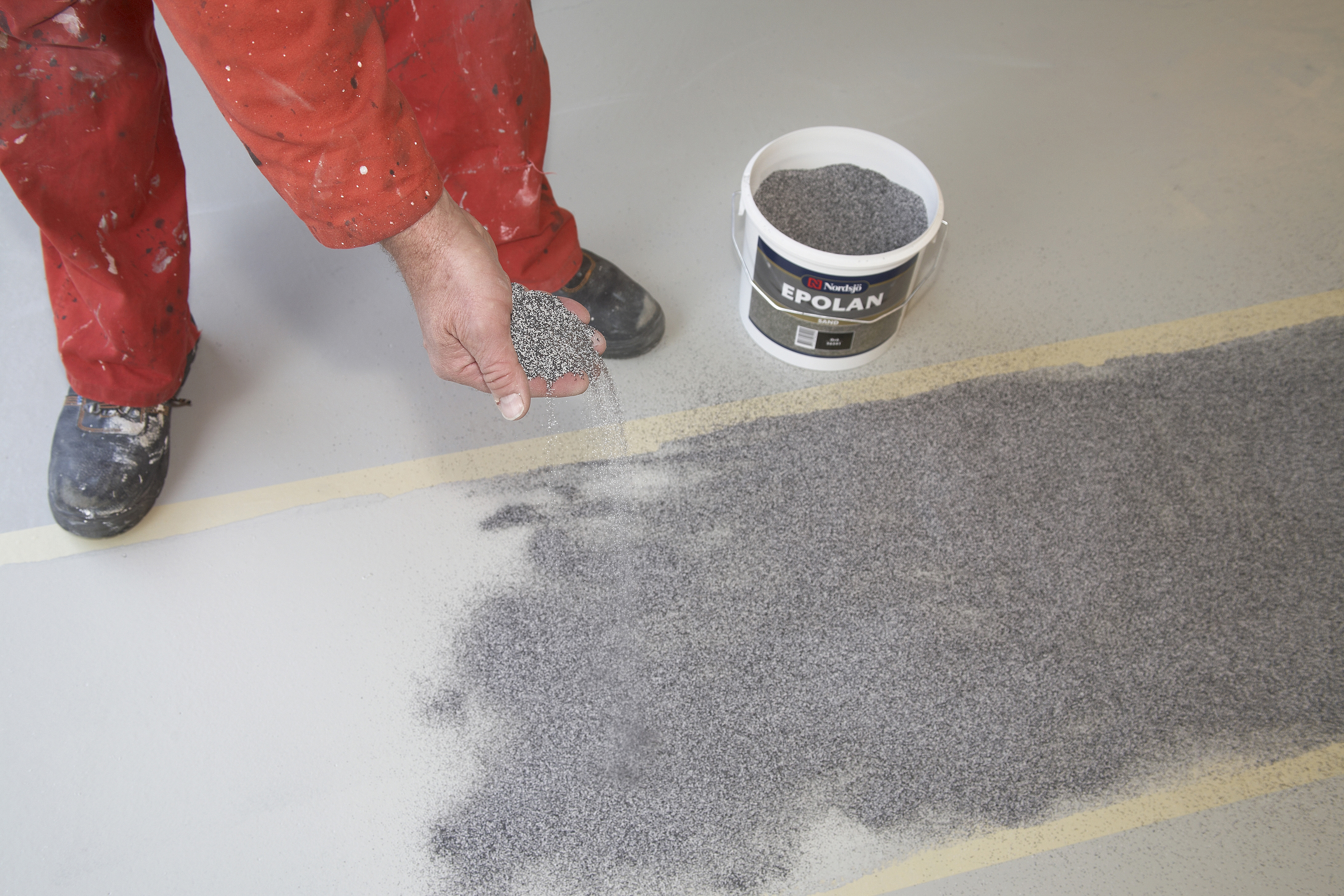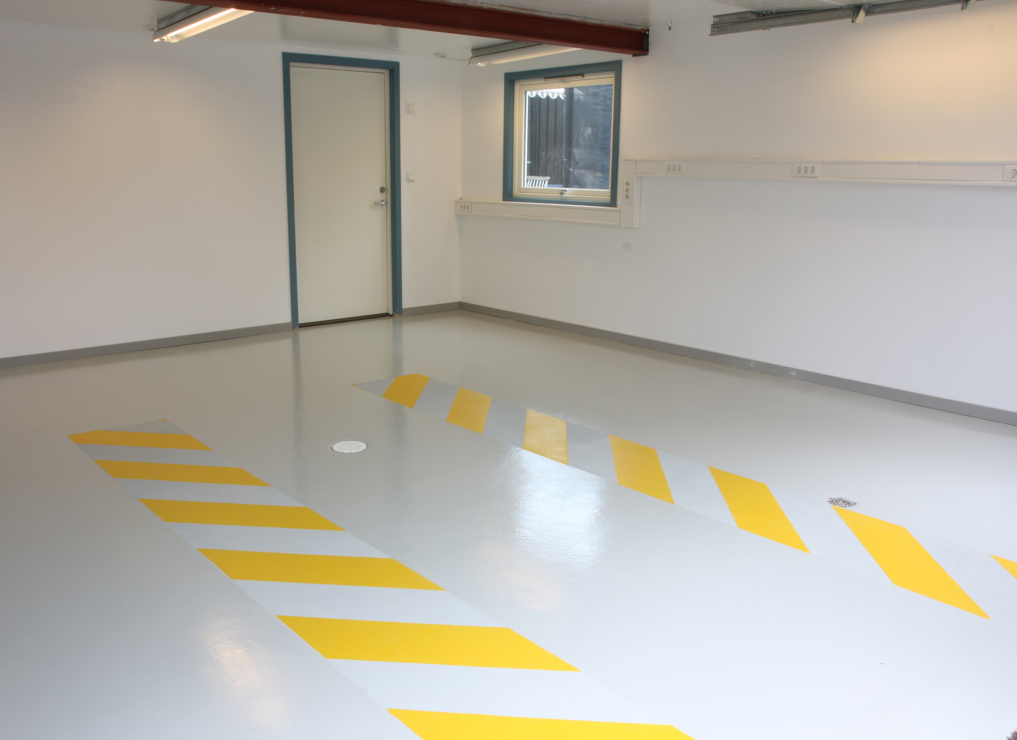 Selve gulvet ble malt i en lys grå farge. Deretter ble det markert to avlange felter med maskeringsteip. De passet med bilens hjulbredde. I feltene ble det strødd en spesialsand. Den festet seg i et ekstra strøk epoksymaling.