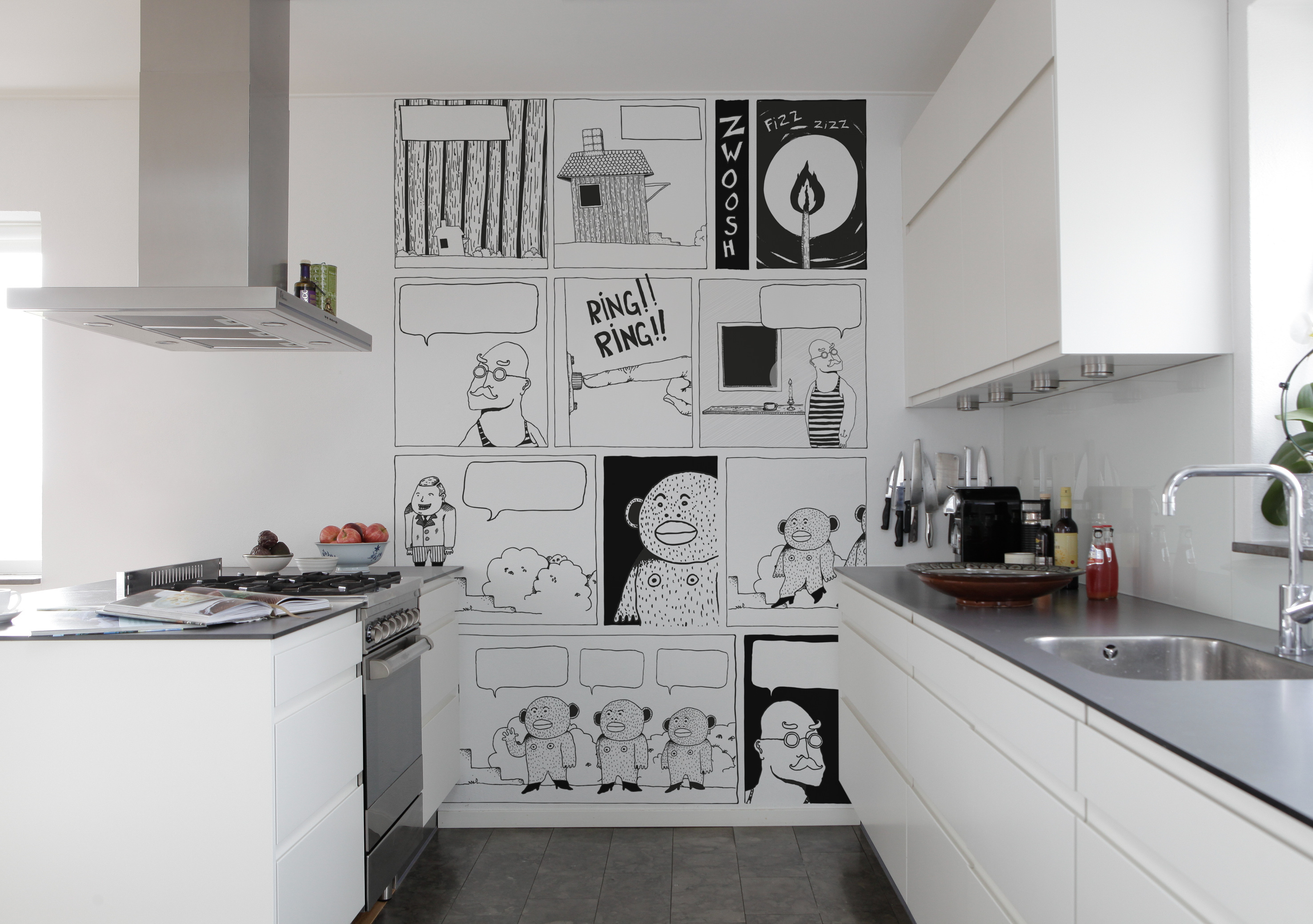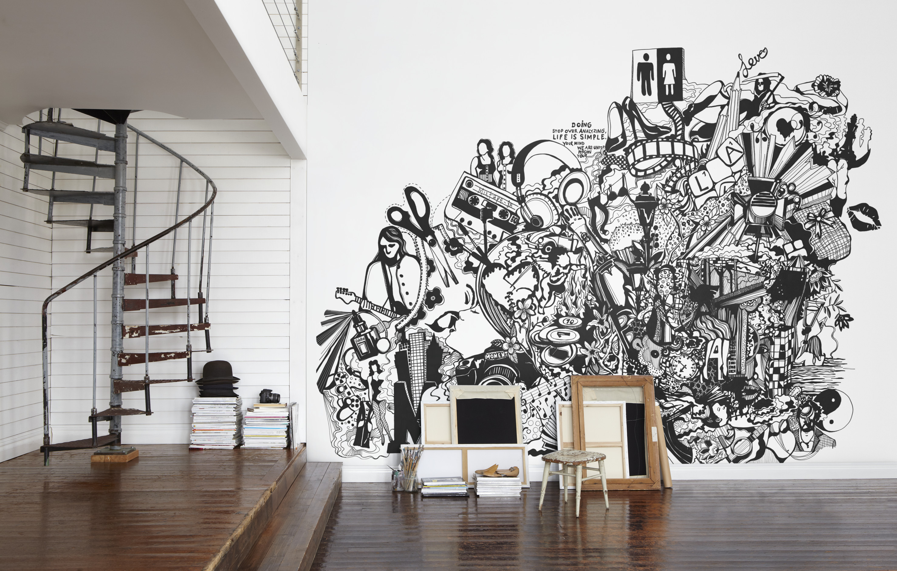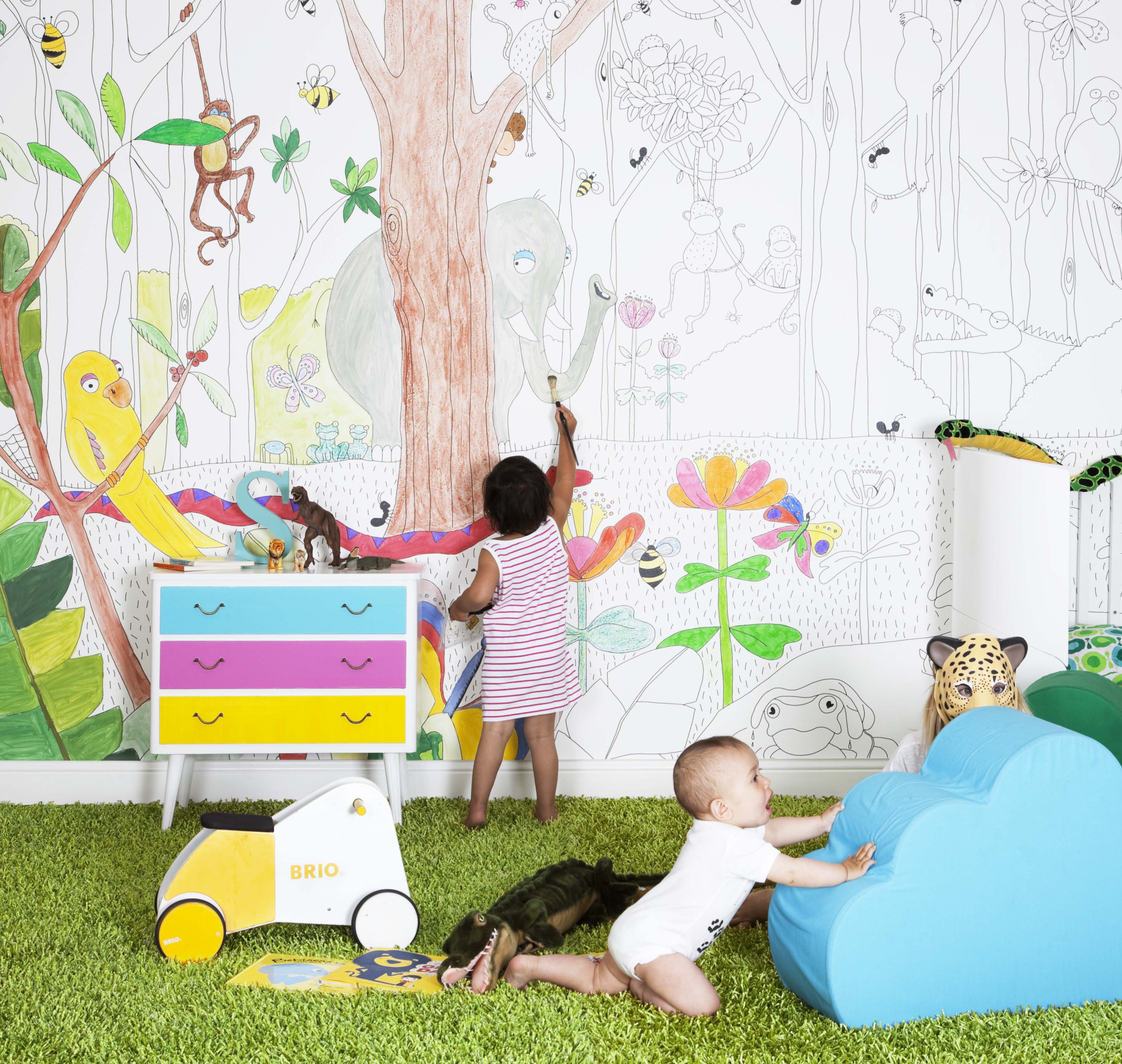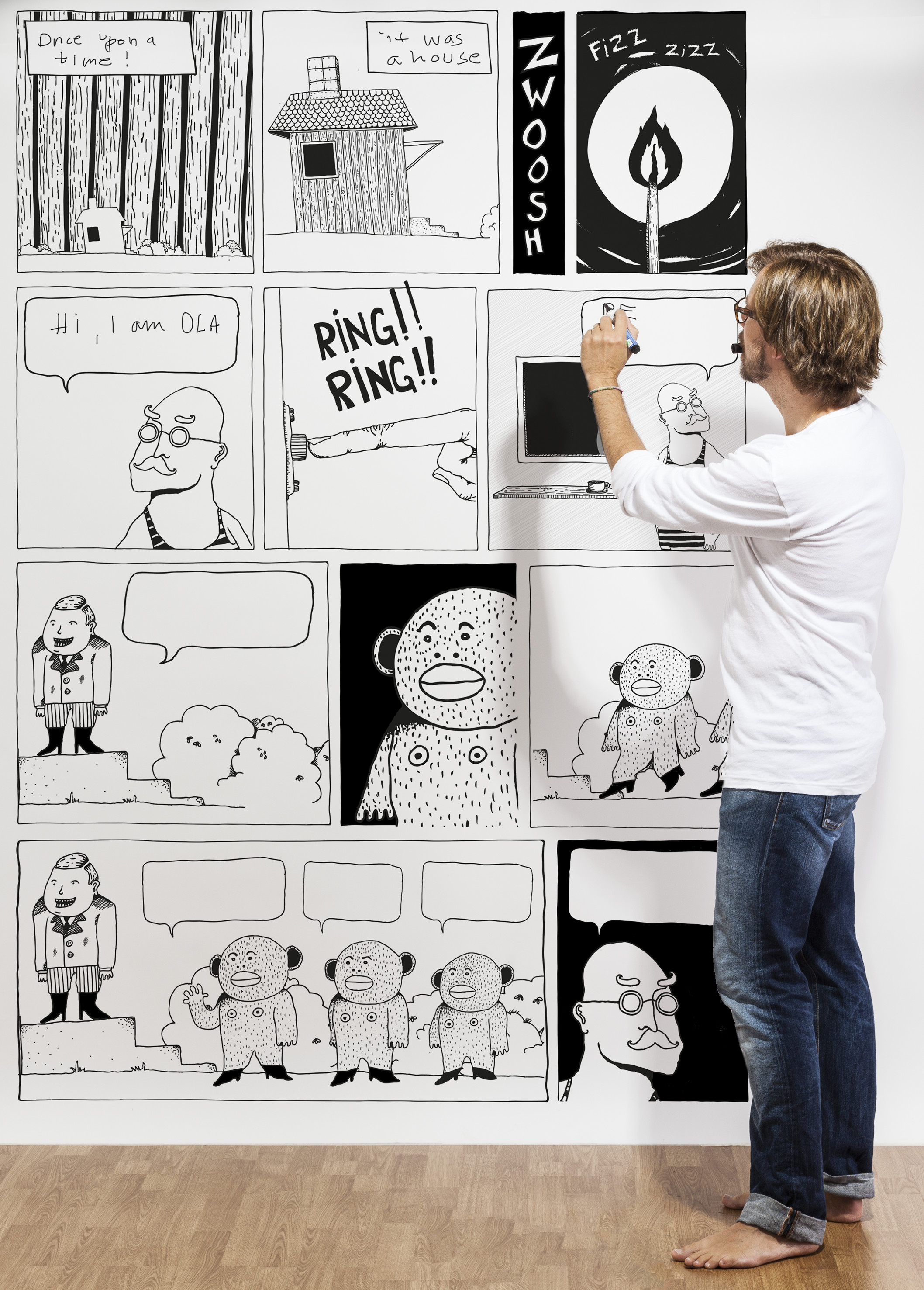 Neste skritt er å sette opp fargeleggingsarkene i storformat på veggen. Flere tapetprodusenter har design som egner seg for fargelegging.