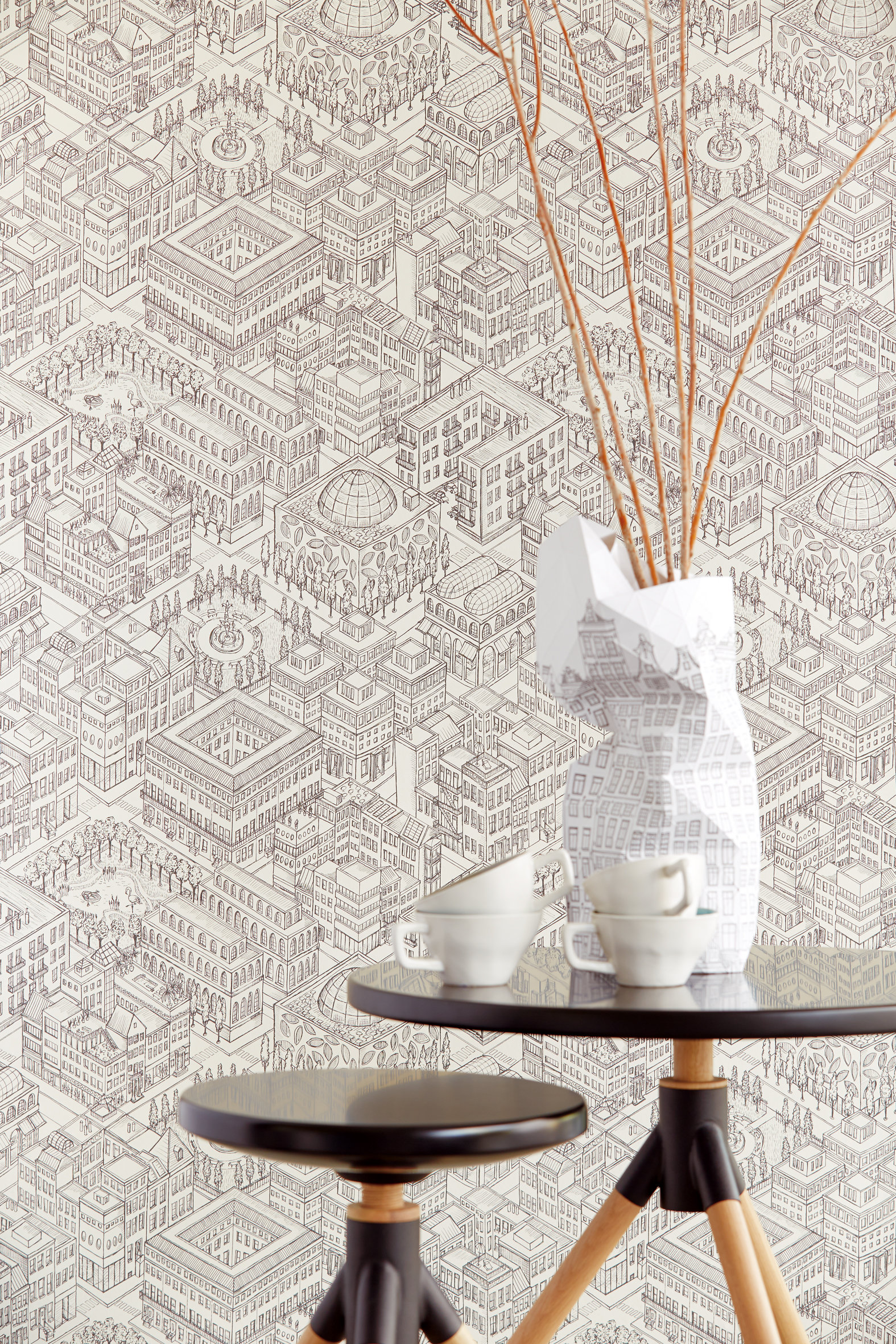 Spesielt løfter han frem tapetboken Script, som inneholder design som kan fargelegges. Et design som finnes i flere versjoner er et tegnet bymotiv, komplett med detaljert tegnete bygninger i firkantete kvartaler, parker med dammer, trær og flamingoer i, mellom et rutenett av gater.