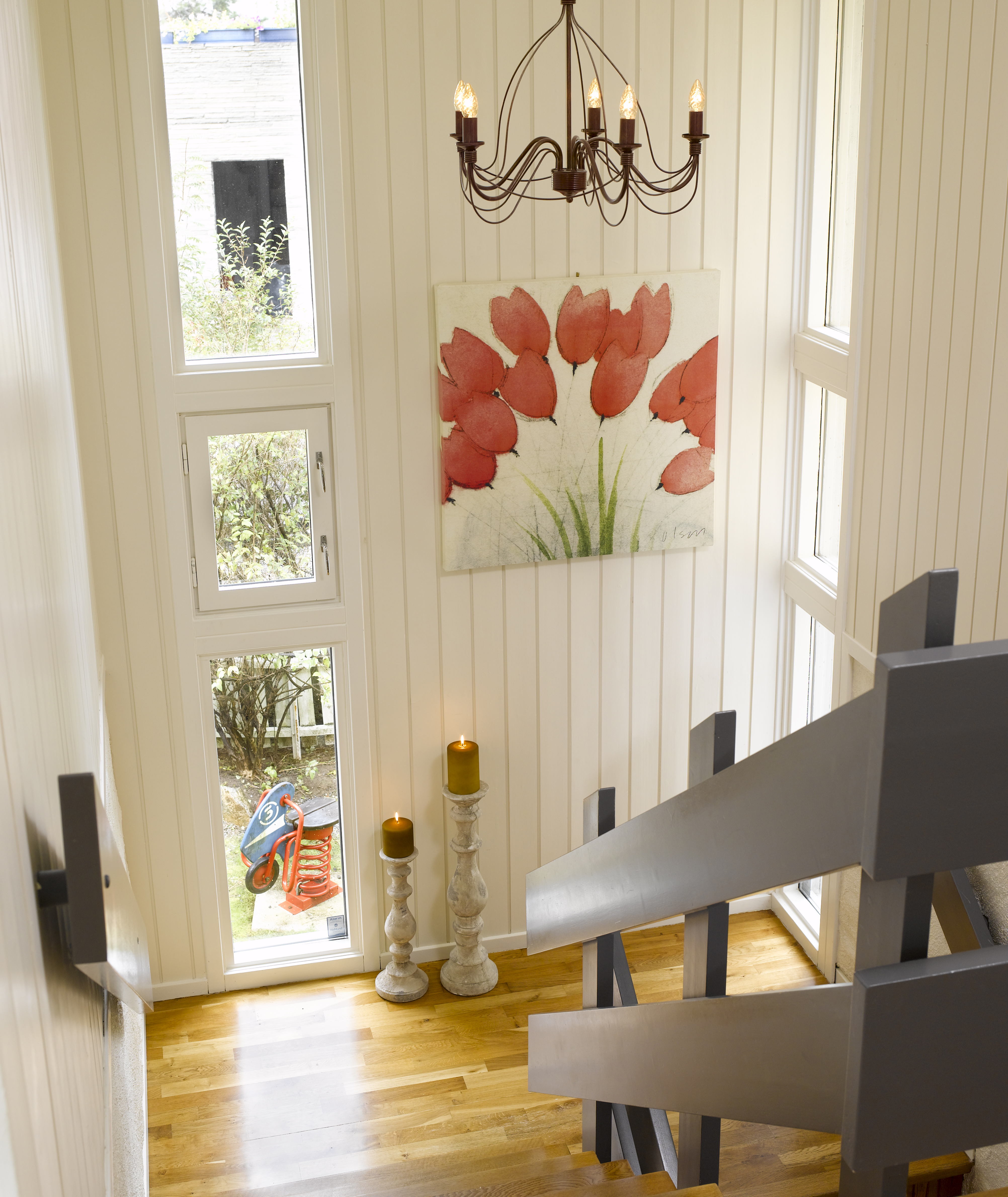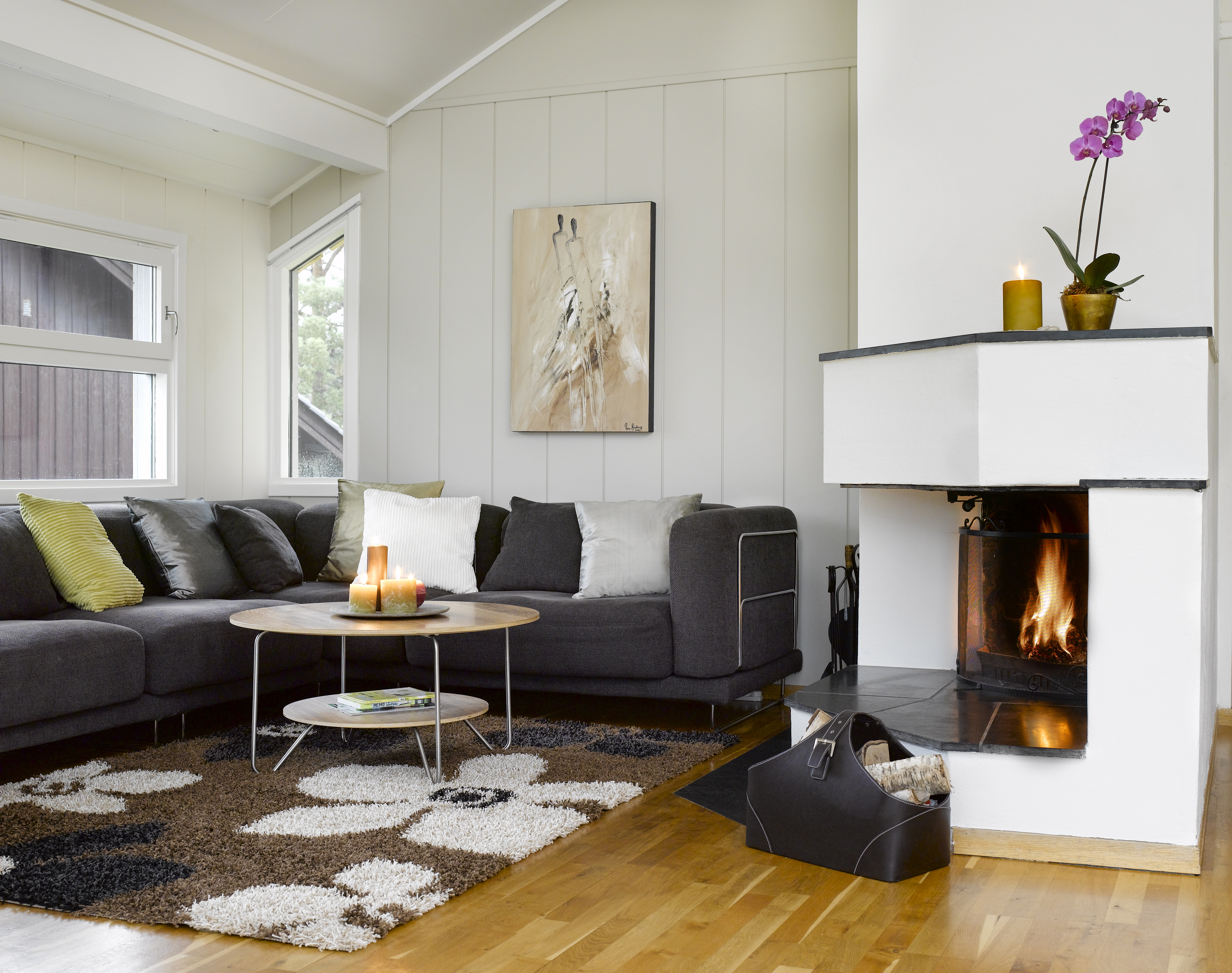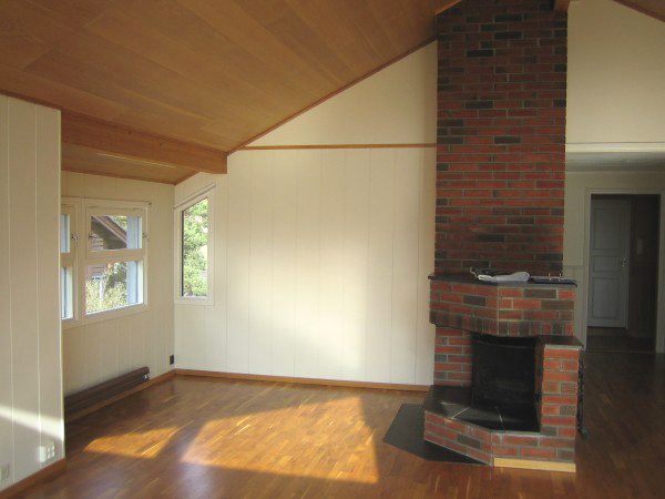 I vårt eksempel har vi laget en fargeplan med utgangspunktet i en lys farge som eierne hadde begynt å male veggene med, S0804-Y30R. Utfordringen var hvilken farger de skulle kombinere med for å oppnå en helhet. Eierne hadde et ønske om å kombinere denne lyse fargen med bruntoner og limegrønn. De ønsket også store kontraster, ikke med sterke farger, men mellom det lyse og det mørke.