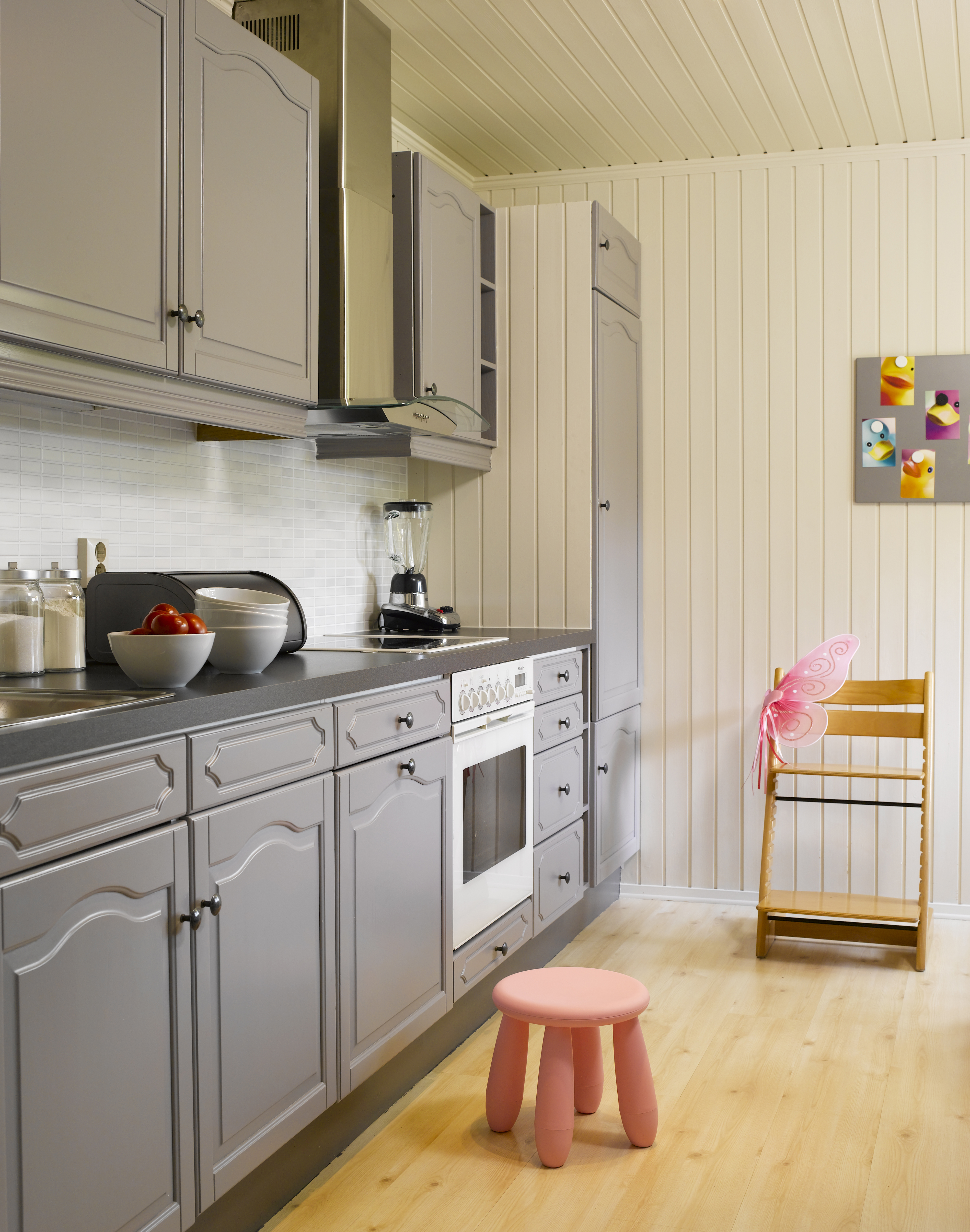 Vi startet med den lyse fargeprøven som hovedfarge og valgte deretter en lys grønn og en skjokoladebrun farge som detaljfarger. Med dette som utgangspunkt valgte vi to gråtoner som sekundærfarger og som ikke "konkurrerer" med den brune og den grønne, men tvert imot fremhever dem på en riktig måte. Gråtoner er også gode farger når vi vil skape kontraster mellom det lyse og det mørke, slik som disse eierne gjerne ville ha det.