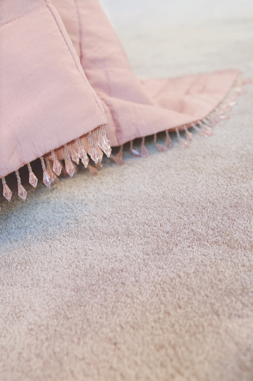 Fargen passer det øvrige interiøret, og har en vakker nyanse som ligger et sted midt mellom rosa og beige. Glansen i materialet danner mønster ettersom føttene stryker over det, og varierer mellom silkeaktig blankt og mørkere matt.