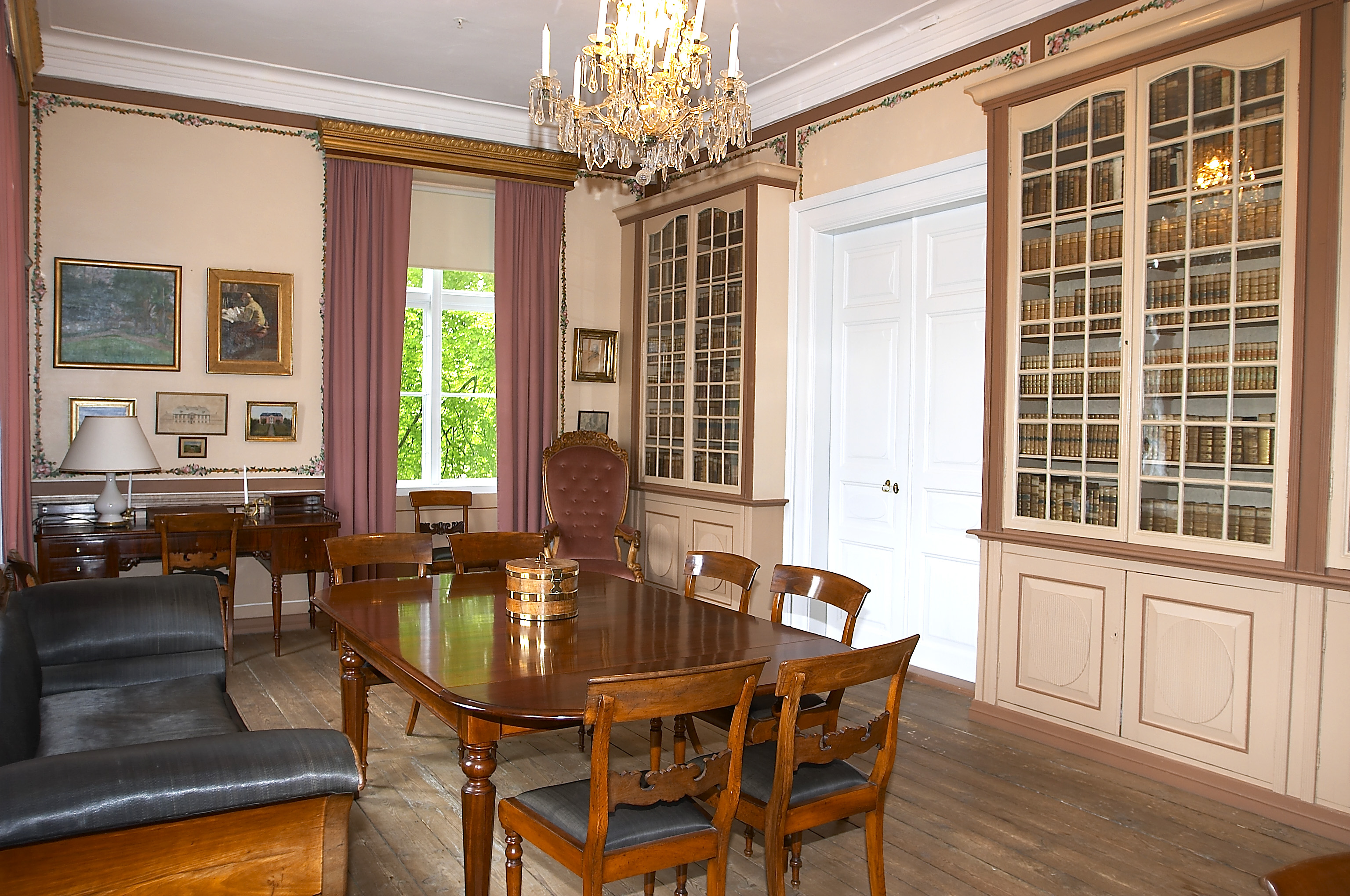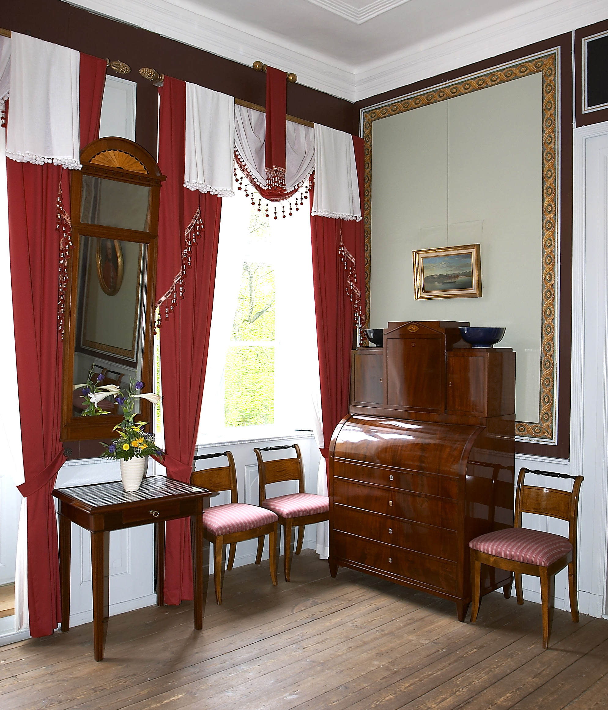 I interiøret er alle malte flater restaurert, enkelte steder også med nye farger. Der det var nødvendig er også møbler restaurert, gardinene er fornyet og originale tapeter er reparert.