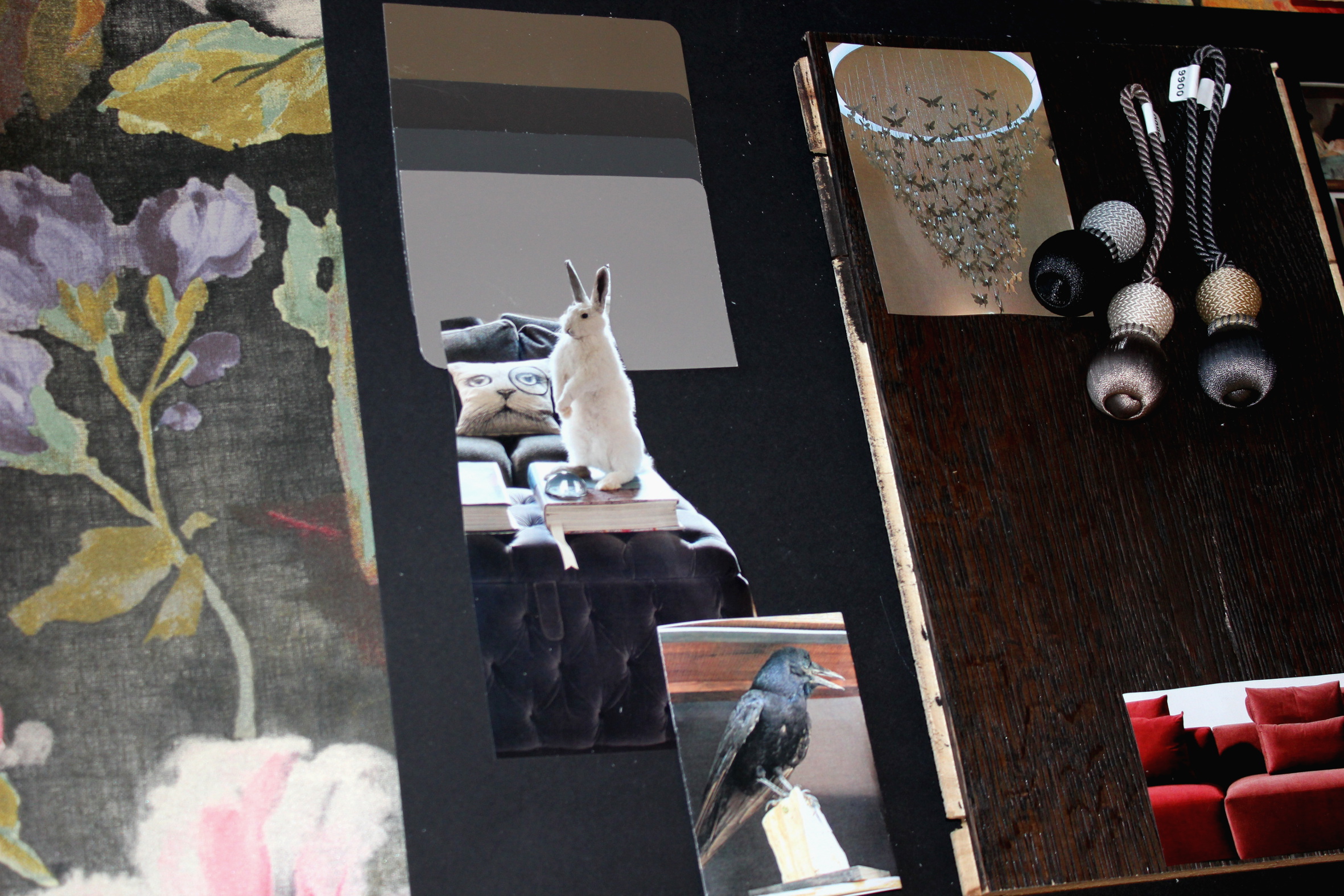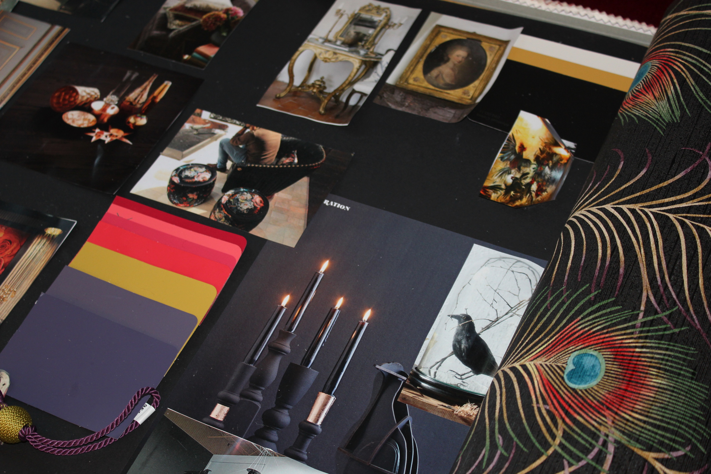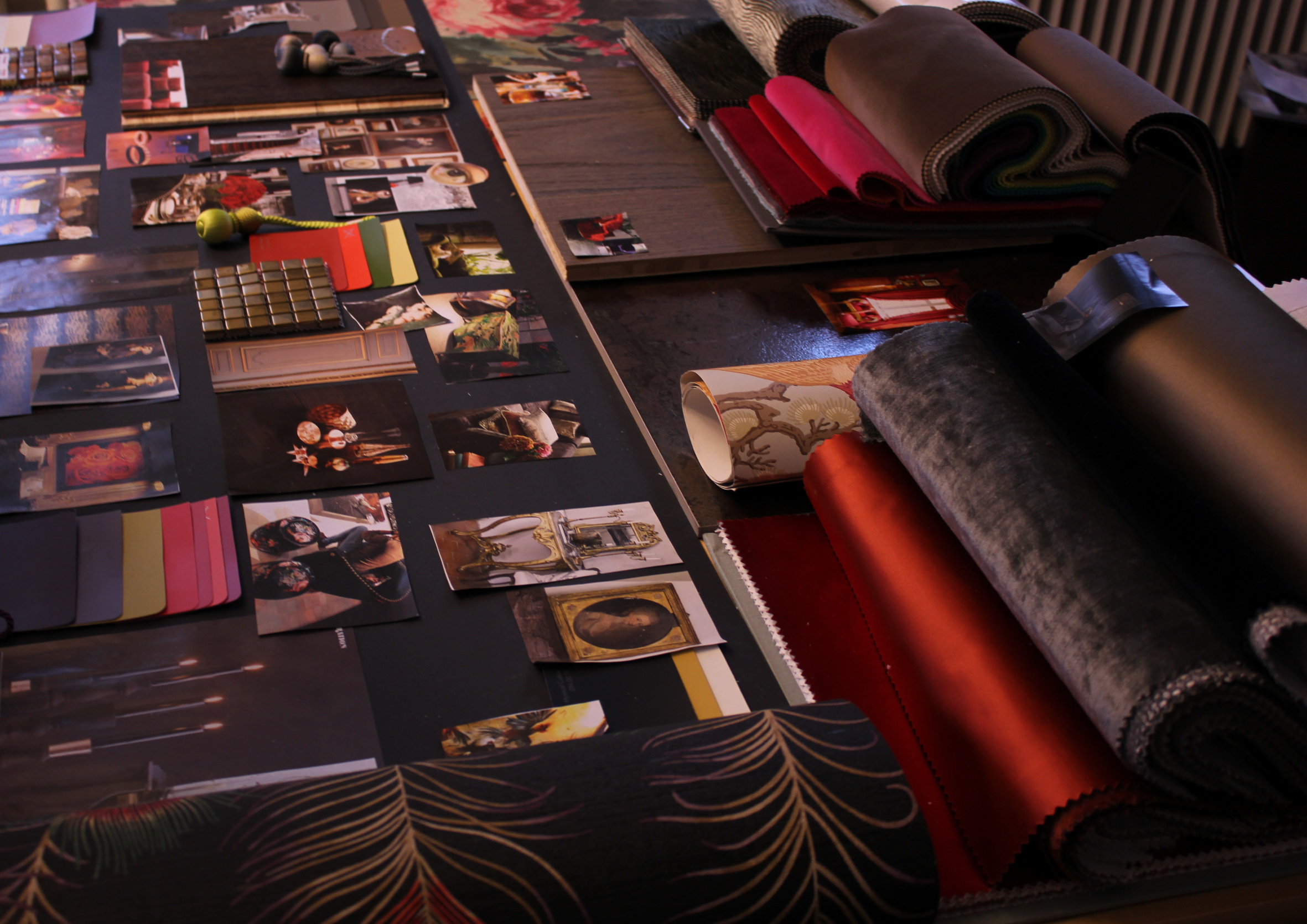 Materialer: fløyel, velur, silke, keramiske fliser, gull, bronse, dyreprint, mørkt tre.
