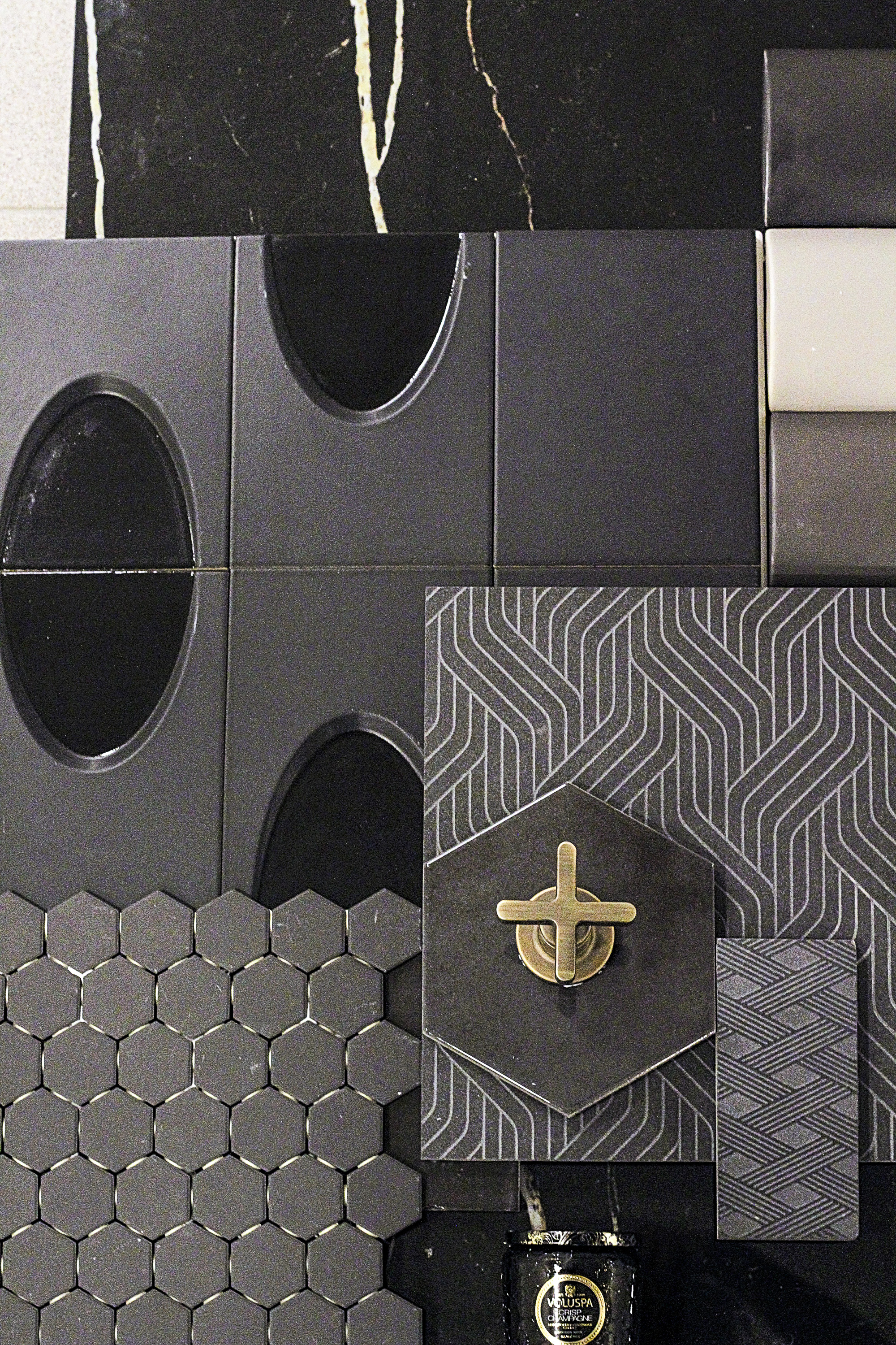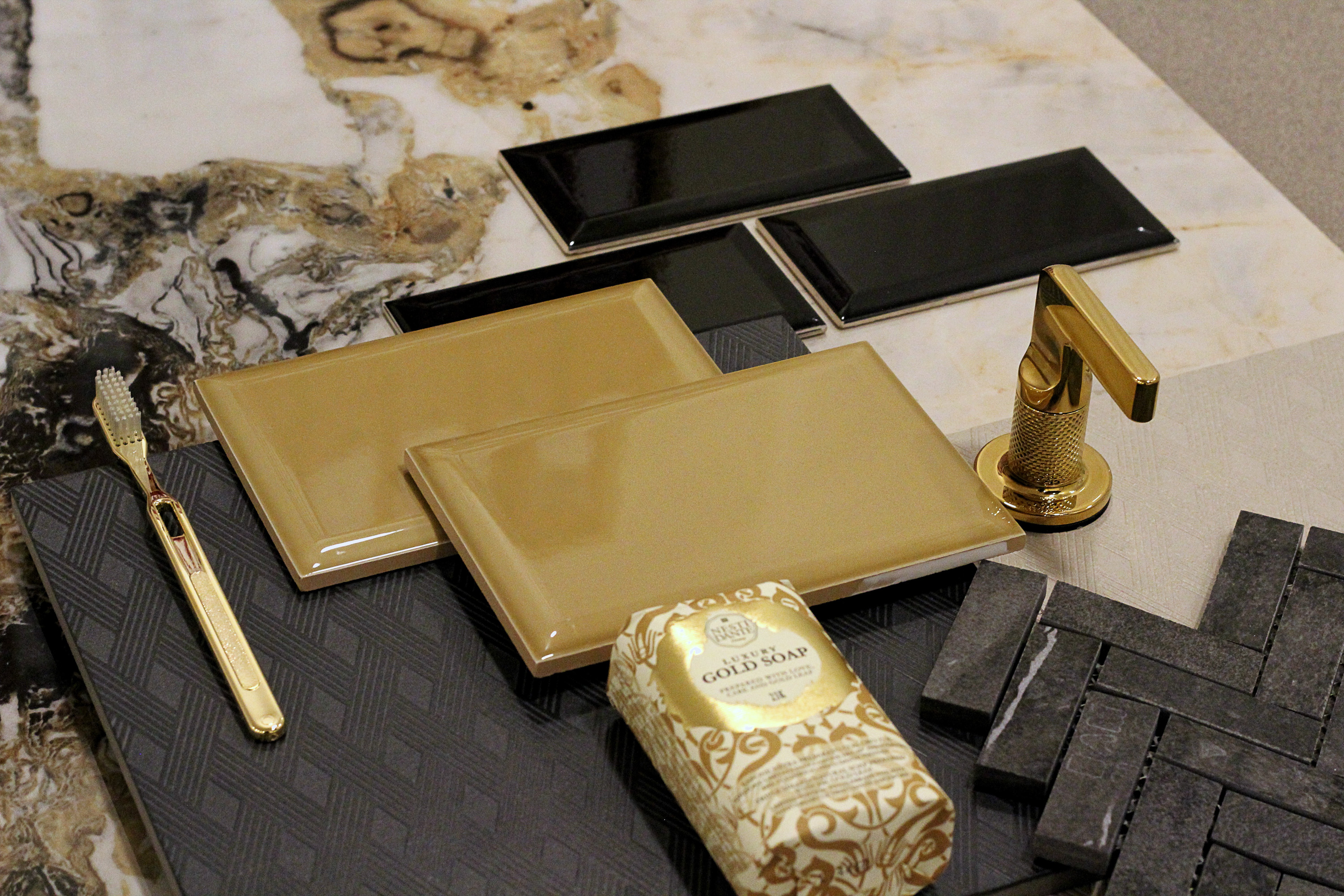 Marmorflisen har elegant mønstring i sort og gull, og de klassiske flisene med fasede kanter gir et elegant inntrykk i både matt og blank utførelse. En flis med et nærmest tekstilt mønster i relieff i overflaten fører tankene mot motehusene i byen.