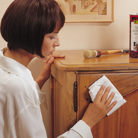 2. Når skapet er rent både utvendig og innvendig, kan man gå over med voks. Liberon Black Bison Antikkvoks fargeløs er et godt produkt til denne bruken. Bruk gjerne den flytende versjonen av produktet, og påfør med en pensel. Det skal kun ligge et tynt lag med voks på overflaten. Hvis det har blitt striper fra penselen eller for mye voks enkelte steder, tørk over med en myk og ren klut før det tørker.