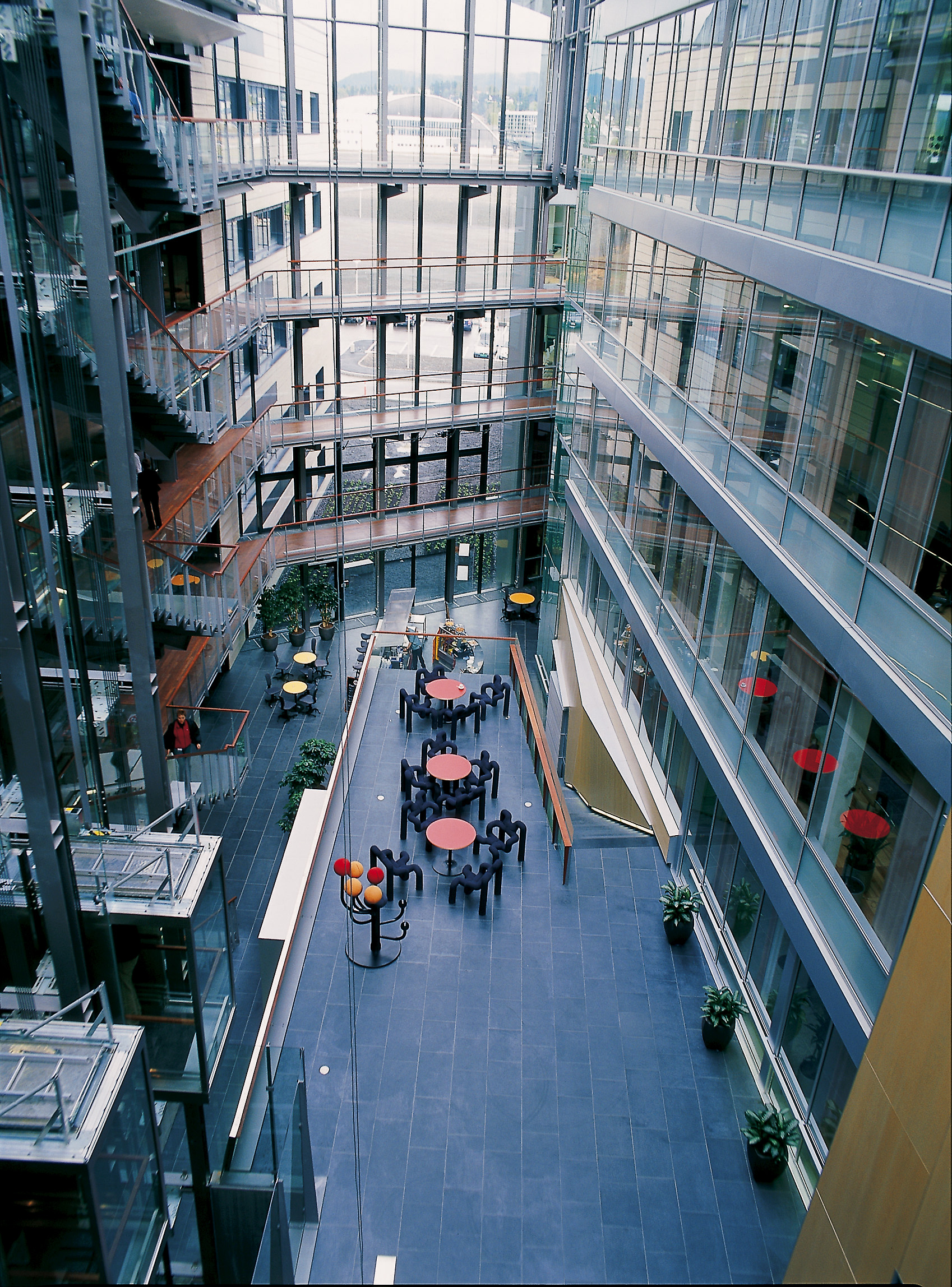 De enkelte bygg - med åpne kontorlandskaper supplert med stille rom for ettertanke, fortrolige samtaler eller møter - avløses av luftige atrier med utsikt til omkringliggende natur og beplantninger. Her finnes små lunger med f.eks. en kaffebar, et tehus, et biljardbord eller annen form for avkobling. Om man da ikke tar en treningsøkt i Spenst, et bedriftskonsept under SATS. Men dette betyr ikke at man slentrer seg gjennom arbeidsdagen. Man ser stadig grupper av medarbeidere samlet med sine papirer eller en PC i ivrig samtale og diskusjon. Ellers er bygget utstyrt med i alt 220 møterom med smått og stort, der executive-rommene er utstyrt for videokonferanser.