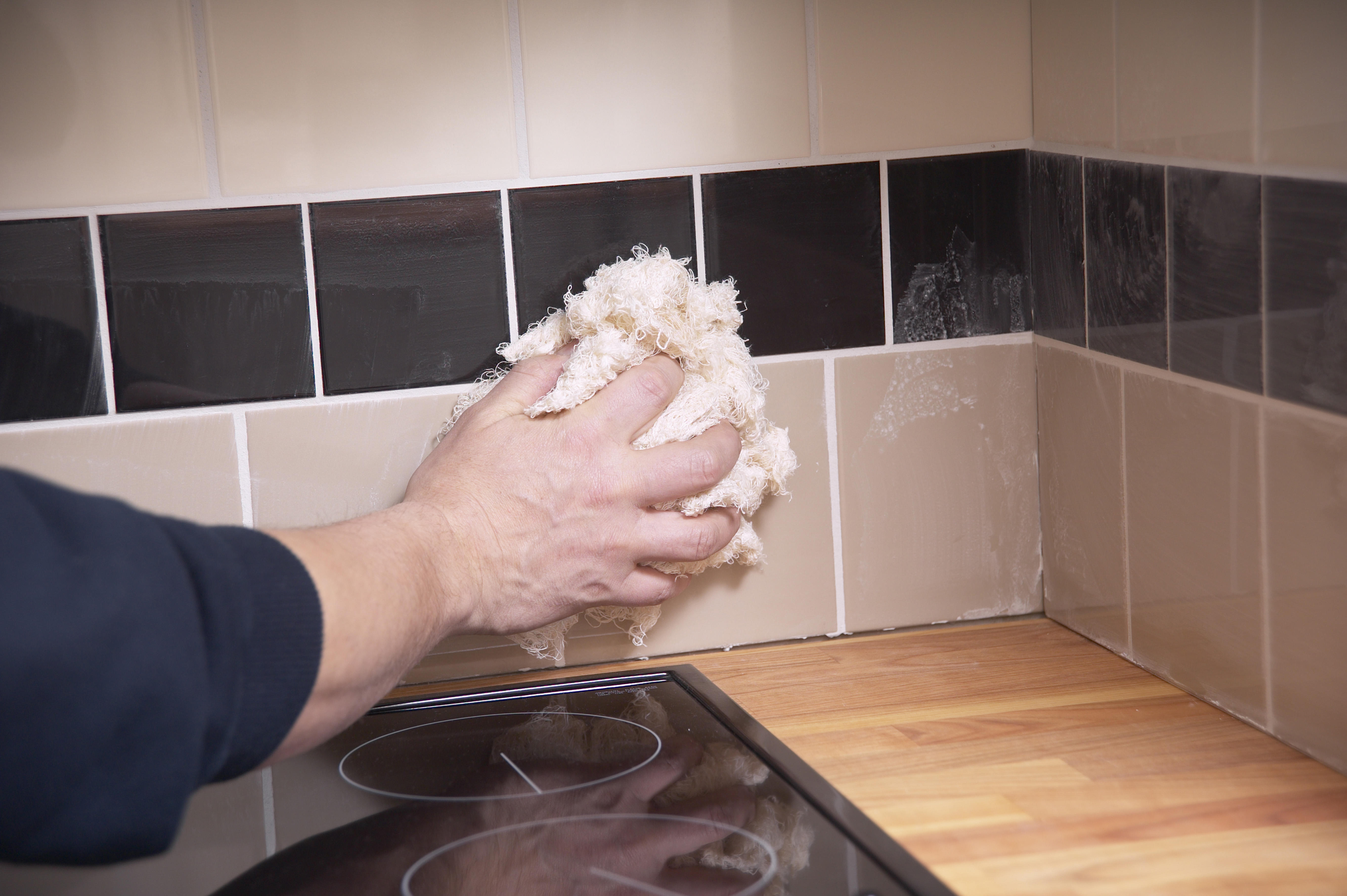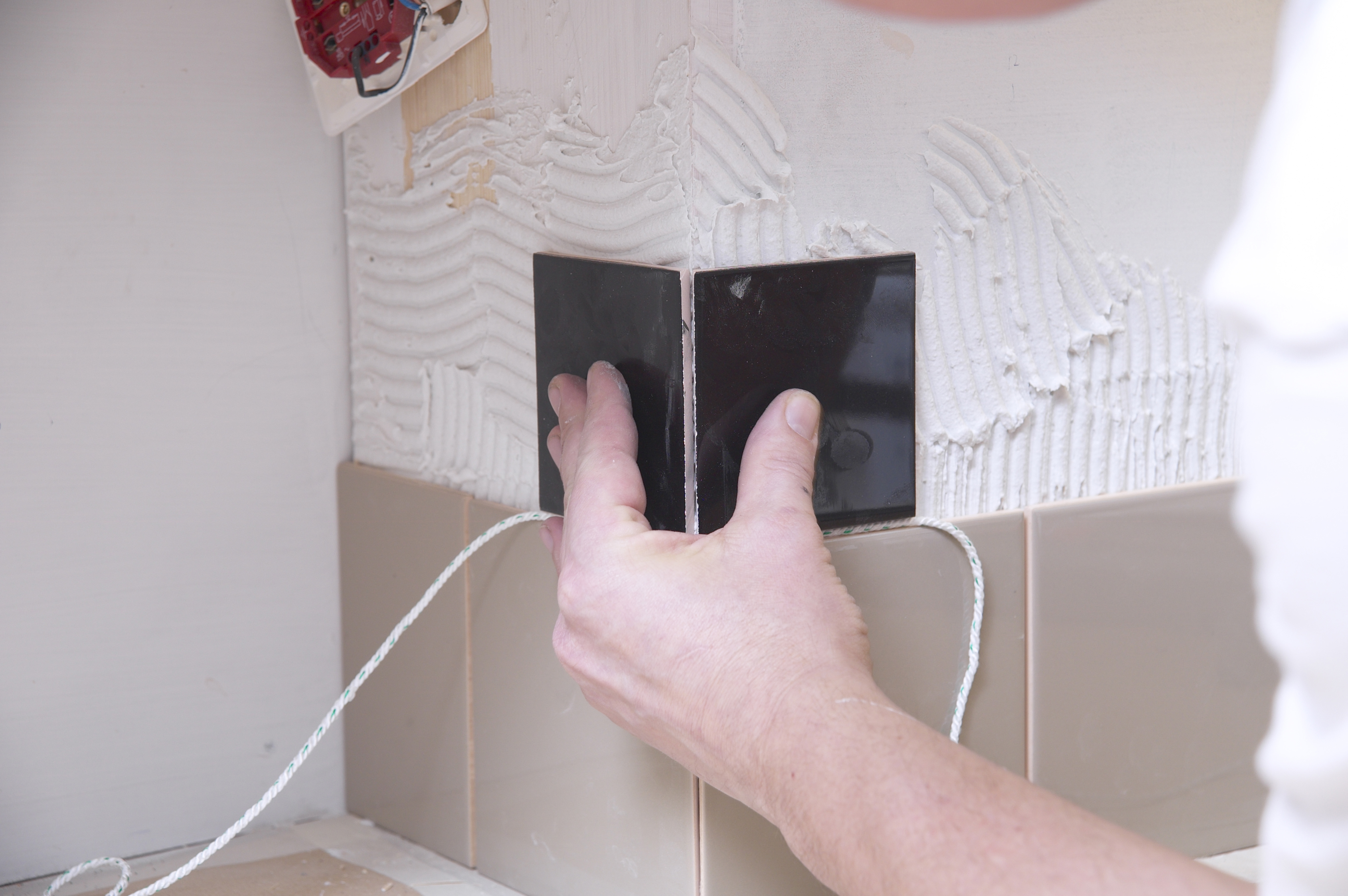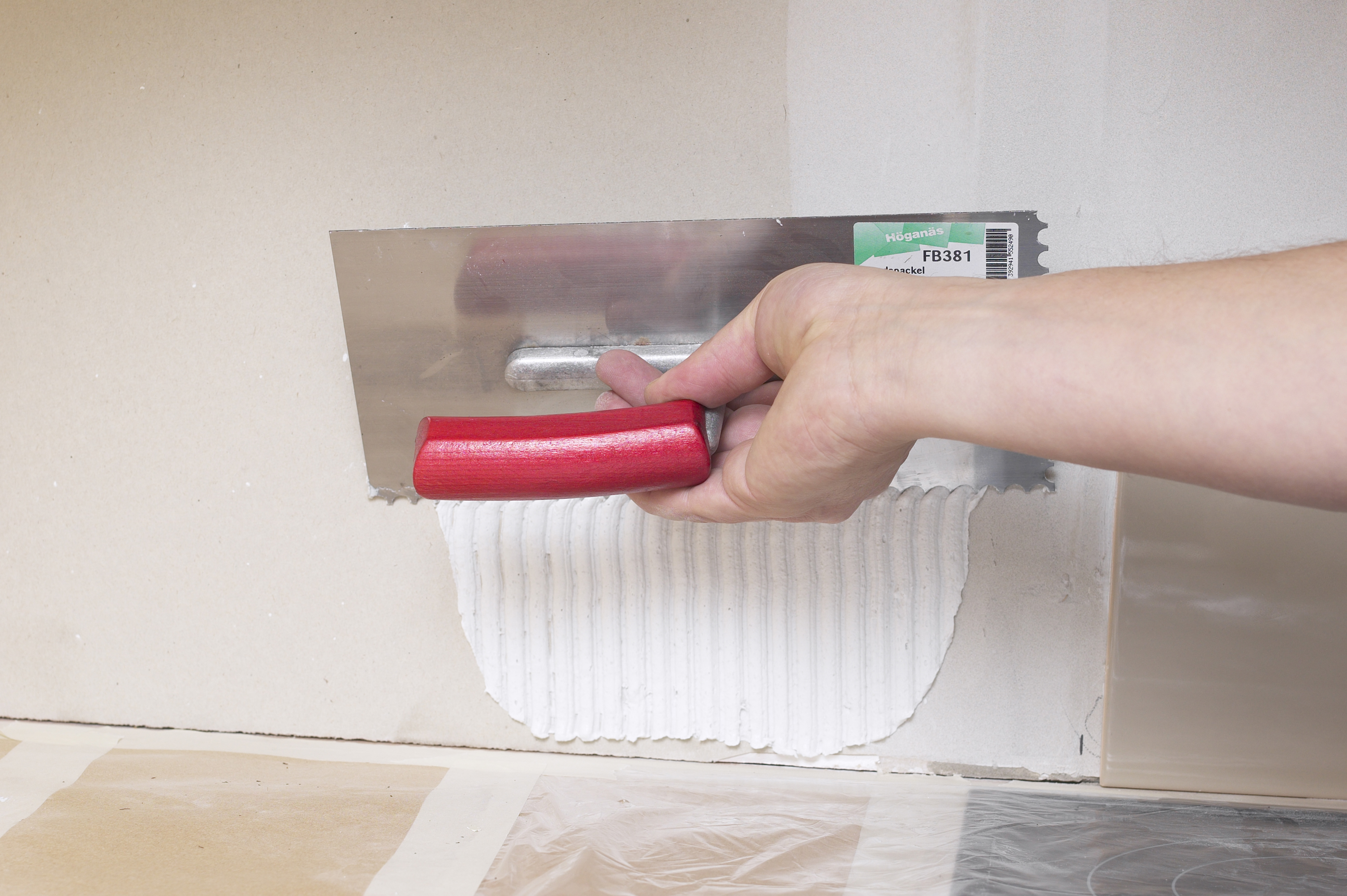 Innredningen og kjøkkenbenken beskyttes først med dekkeplast. Hvis kjøkkenbenken er i vater kan man starte første flisrad rett over benken. Benken i vårt tilfelle var helt rett, så det var en enkel start. Hvis benken ikke er rett, må første flisrad vatres opp. Da starter man med andre flisrad. Feltet mellom benken og andre rad må være mindre enn flisens høyde på benkens laveste punkt. Når første rad er lagt skal limet herde før neste rad legges. Slik forhindrer man at flisene siger.