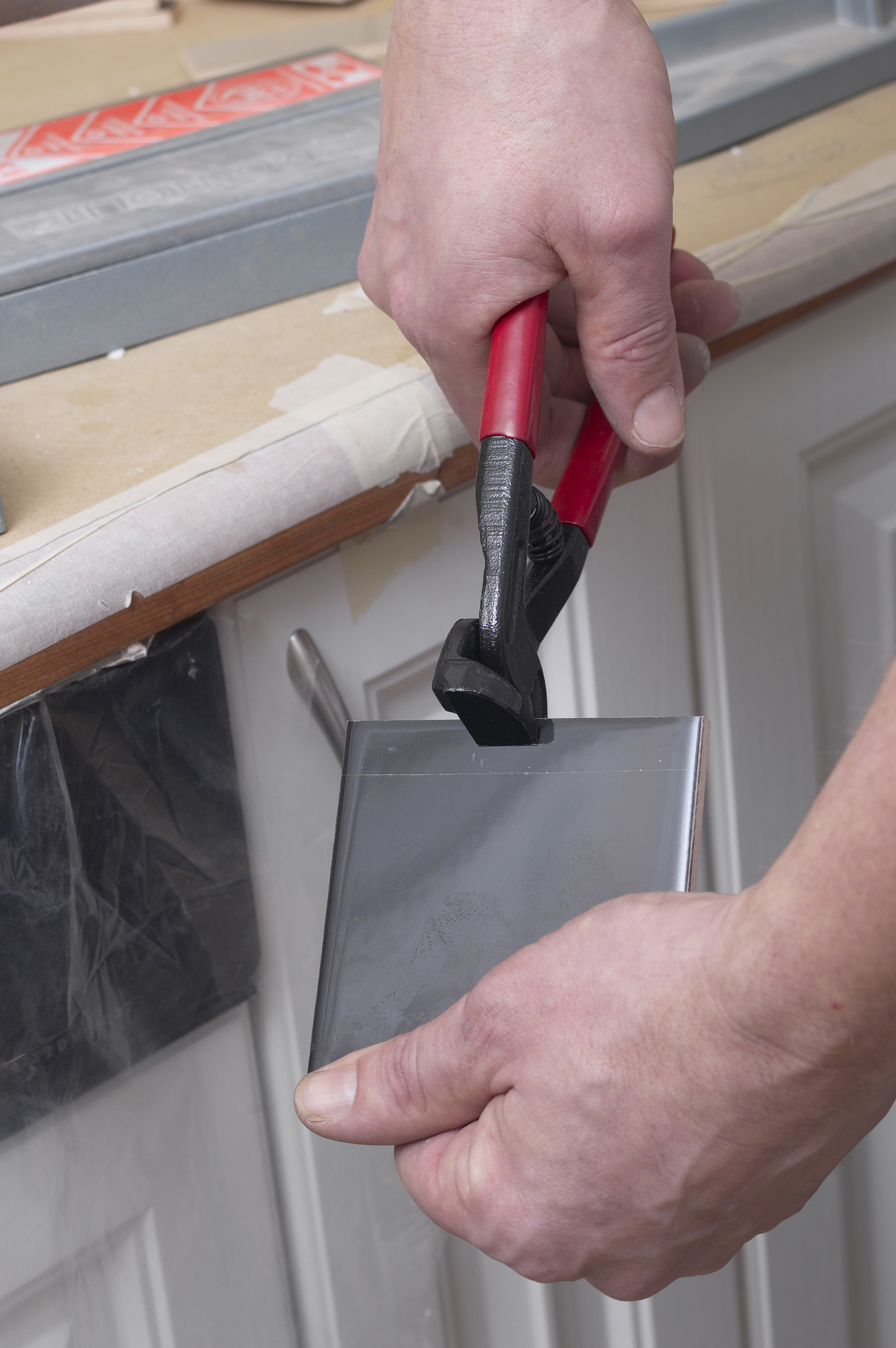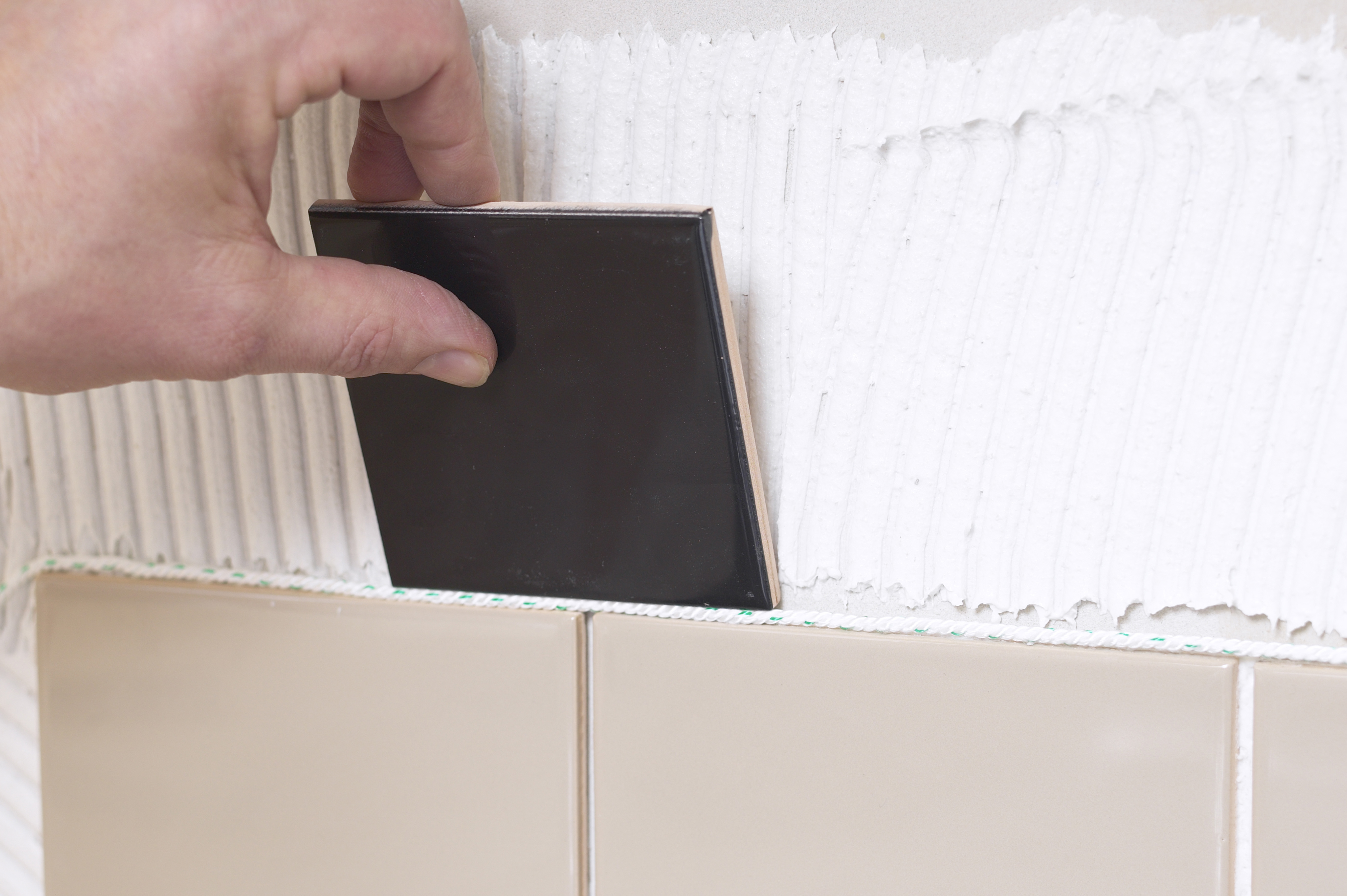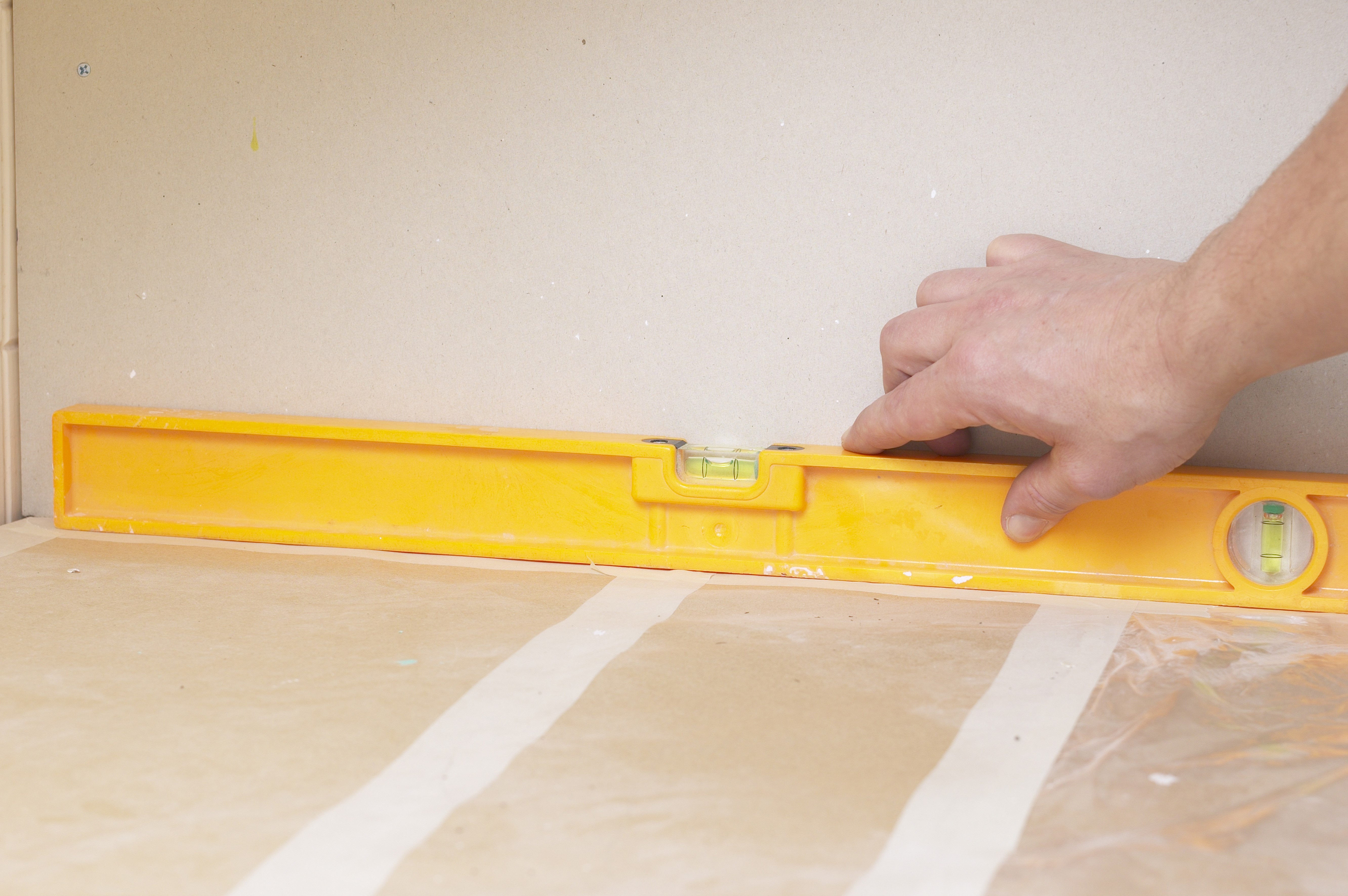 Innredningen og kjøkkenbenken beskyttes først med dekkeplast. Hvis kjøkkenbenken er i vater kan man starte første flisrad rett over benken. Benken i vårt tilfelle var helt rett, så det var en enkel start. Hvis benken ikke er rett, må første flisrad vatres opp. Da starter man med andre flisrad. Feltet mellom benken og andre rad må være mindre enn flisens høyde på benkens laveste punkt. Når første rad er lagt skal limet herde før neste rad legges. Slik forhindrer man at flisene siger.