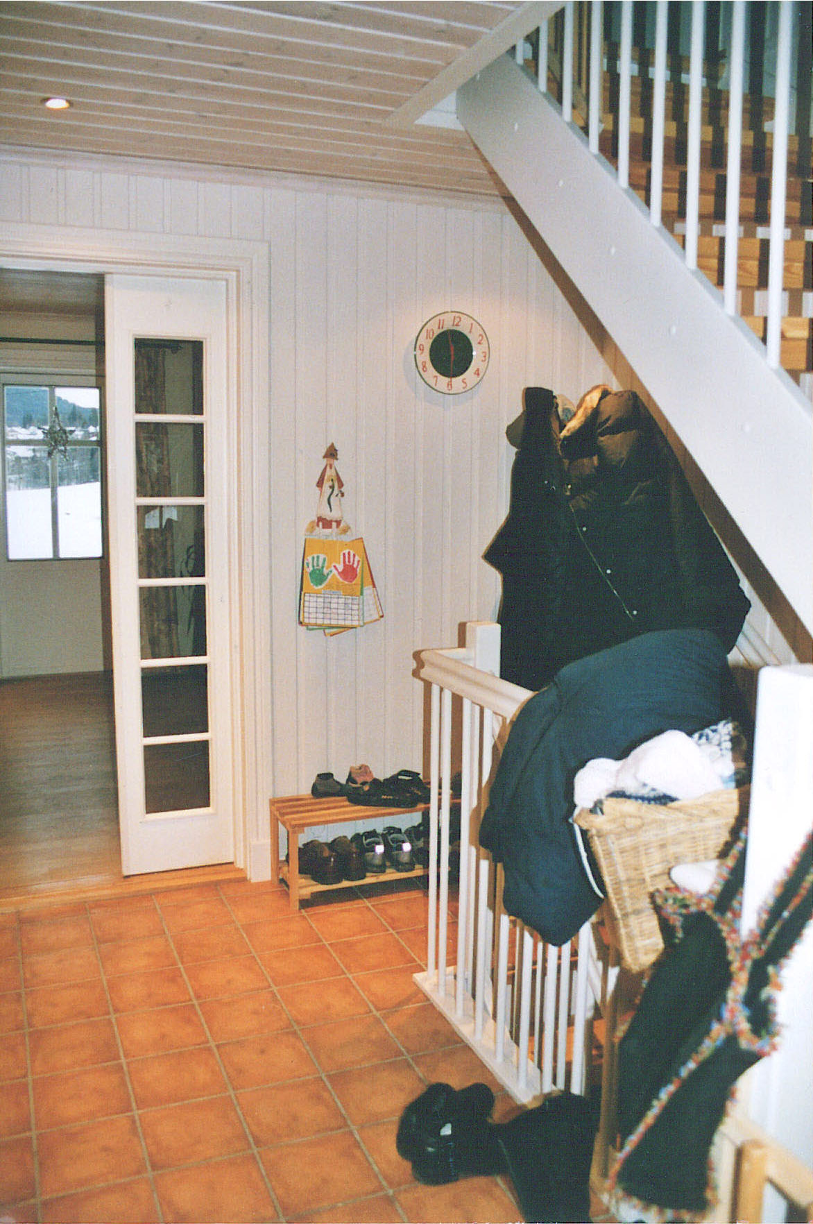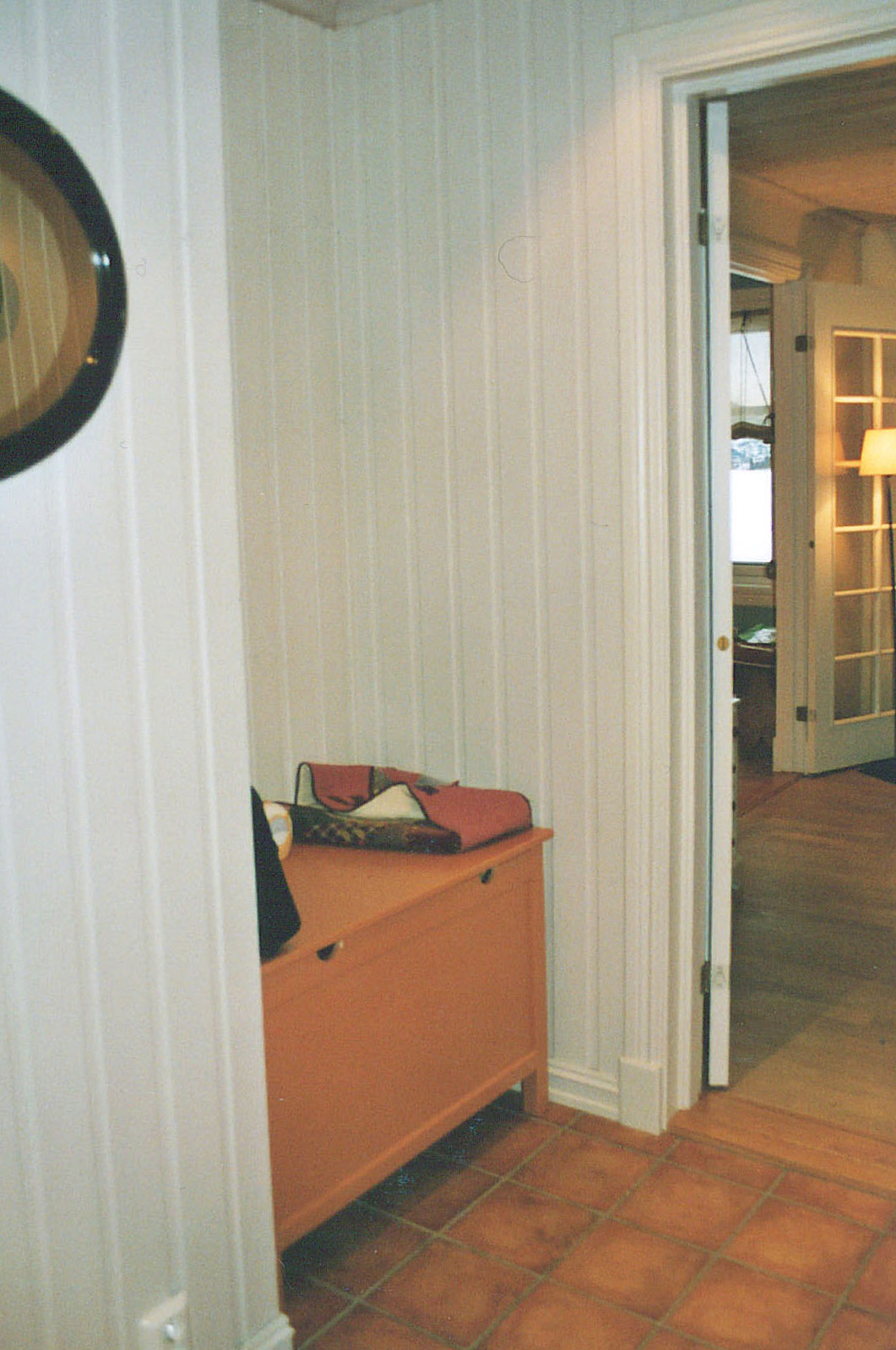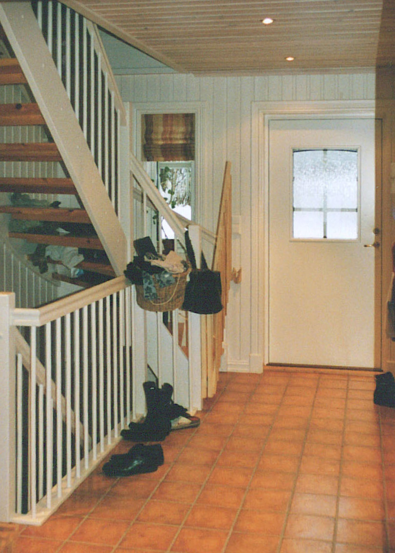 Gulvet var av slitesterk terracottaklinker, men for å stoppe skitten fra å trekke inn i resten av huset, ble en stilig og bred løper med gummiert underside anskaffet. I tillegg til å være svært pent, vil et slikt teppe fange opp sand og smuss. Og når det blir møkkete, kan man ta det med ut og riste det.