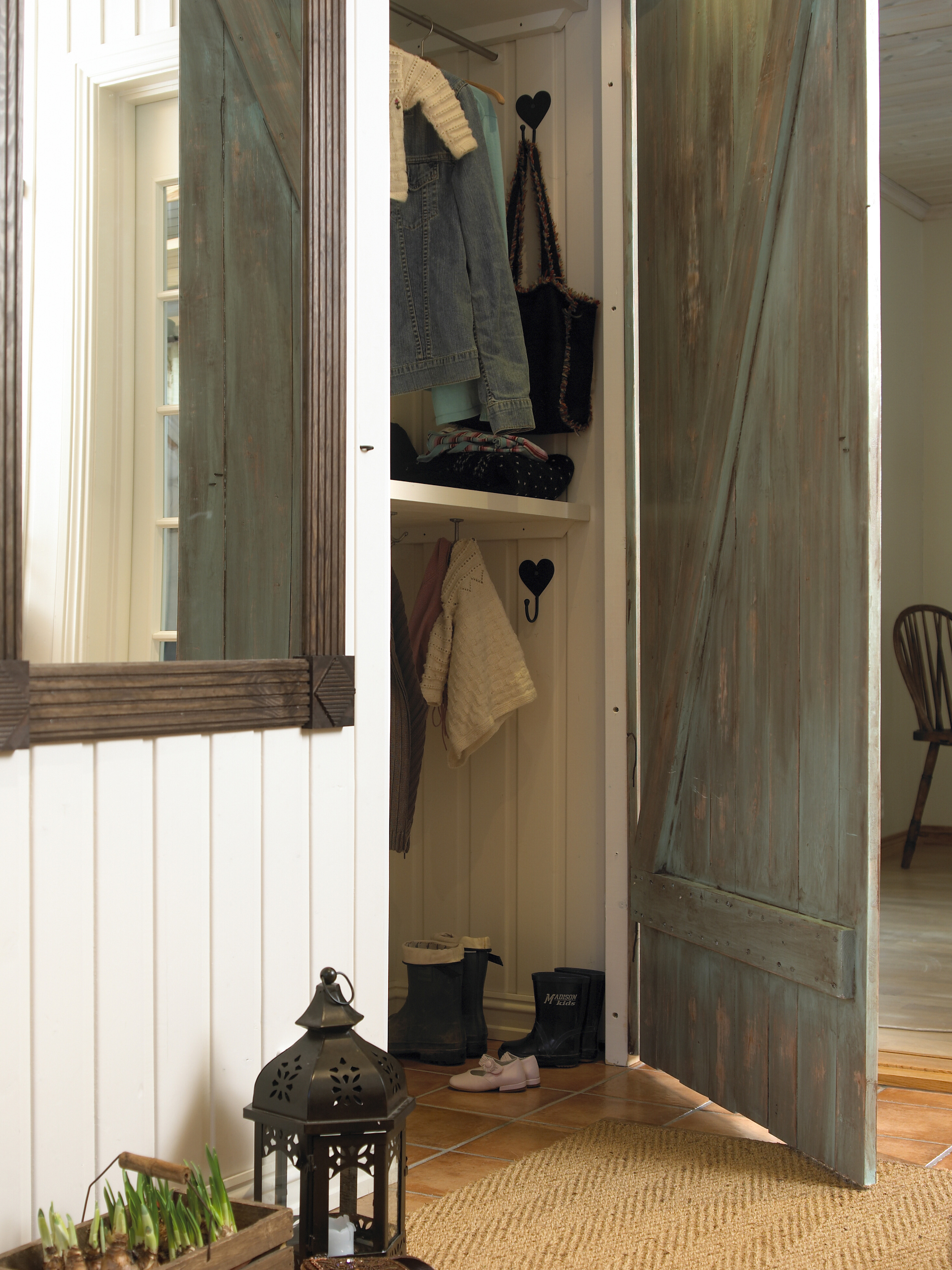 Inn mot stuen ble rustikke knagger hengt på veggen. Men fordi tøy hengende på slike knagger er lett synlig og fort kan skape et rotete inntrykk, ble knaggveggen heller gjort til et dekorativt element. Dette ble gjort ved å bare henge opp "pene" klær, som hatter, vesker, skjærf og lignende, slik at klærne i seg selv ble en del av dekoren.